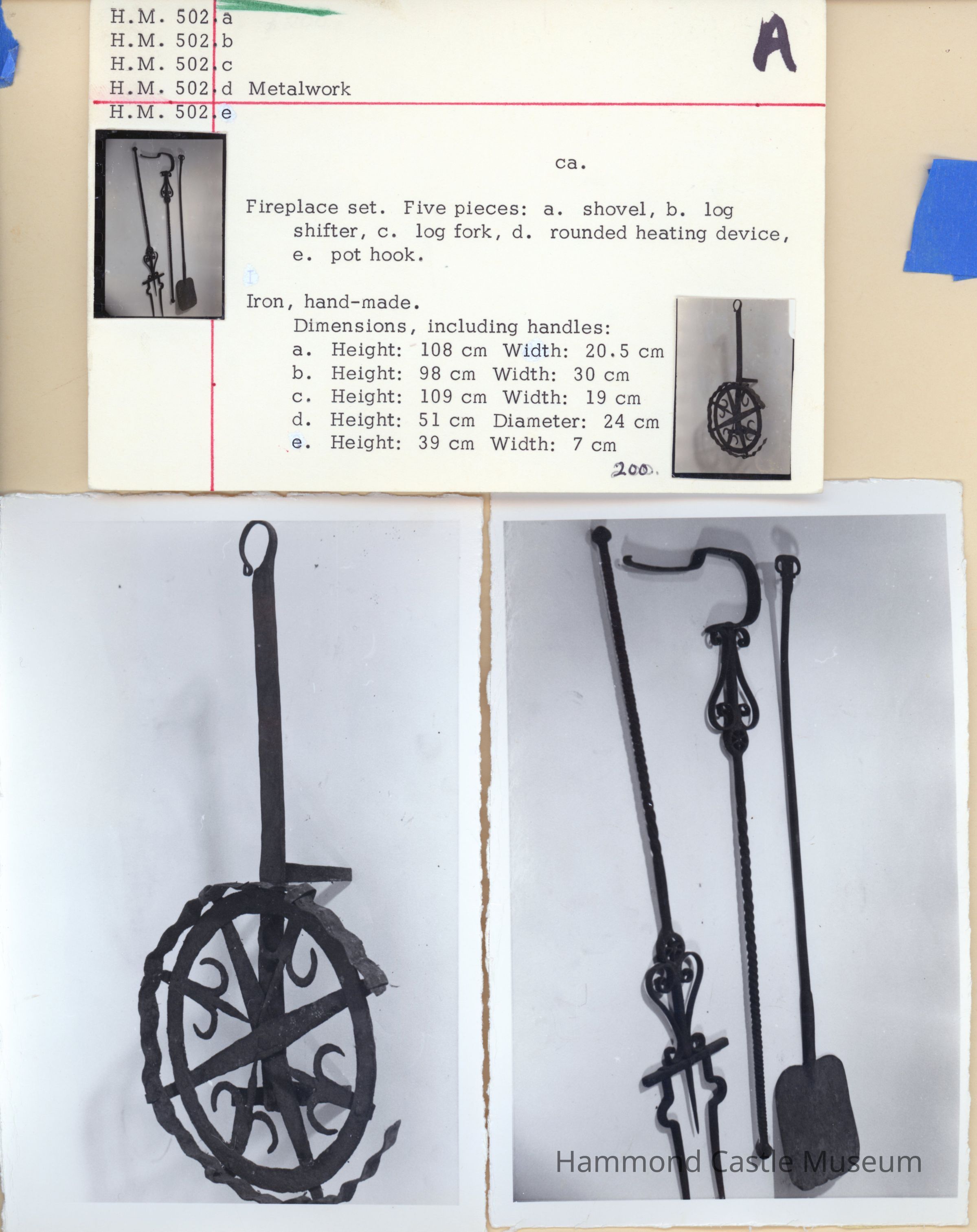 Part of fireplace set. e. pot hook Iron, hand-made.