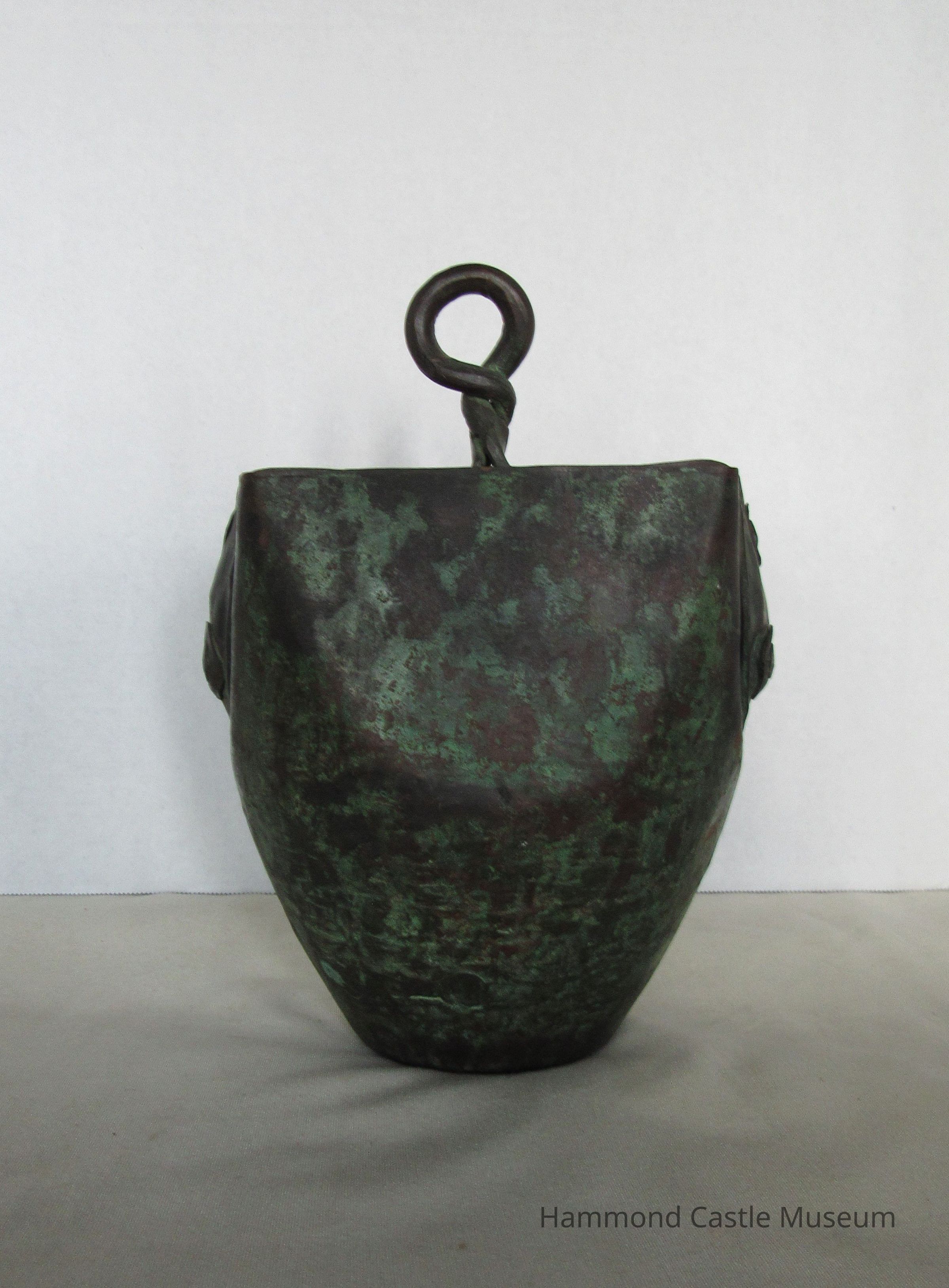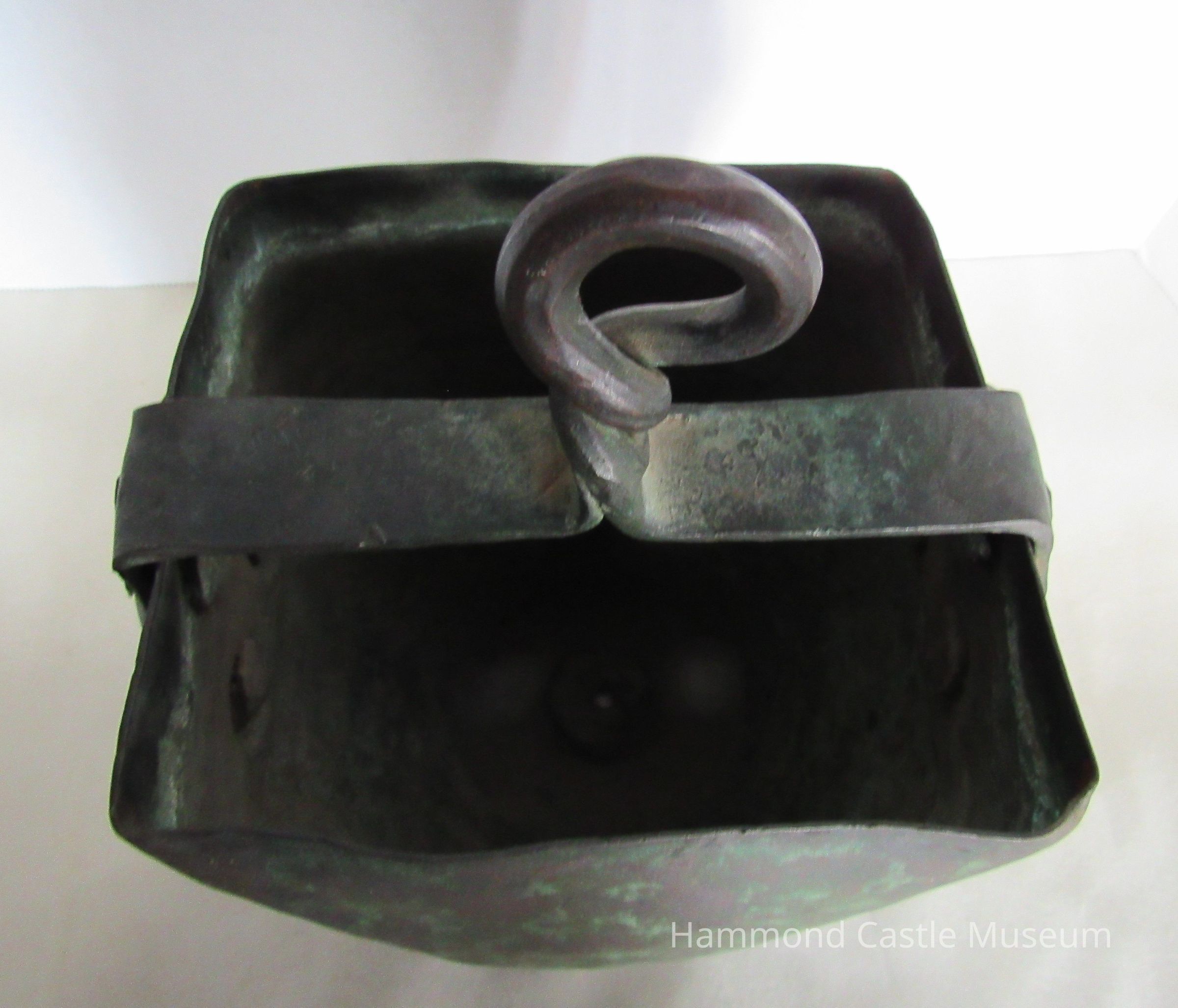 Bucket; square mouth widening into irregular shape, small circular handle, hole in bottom.