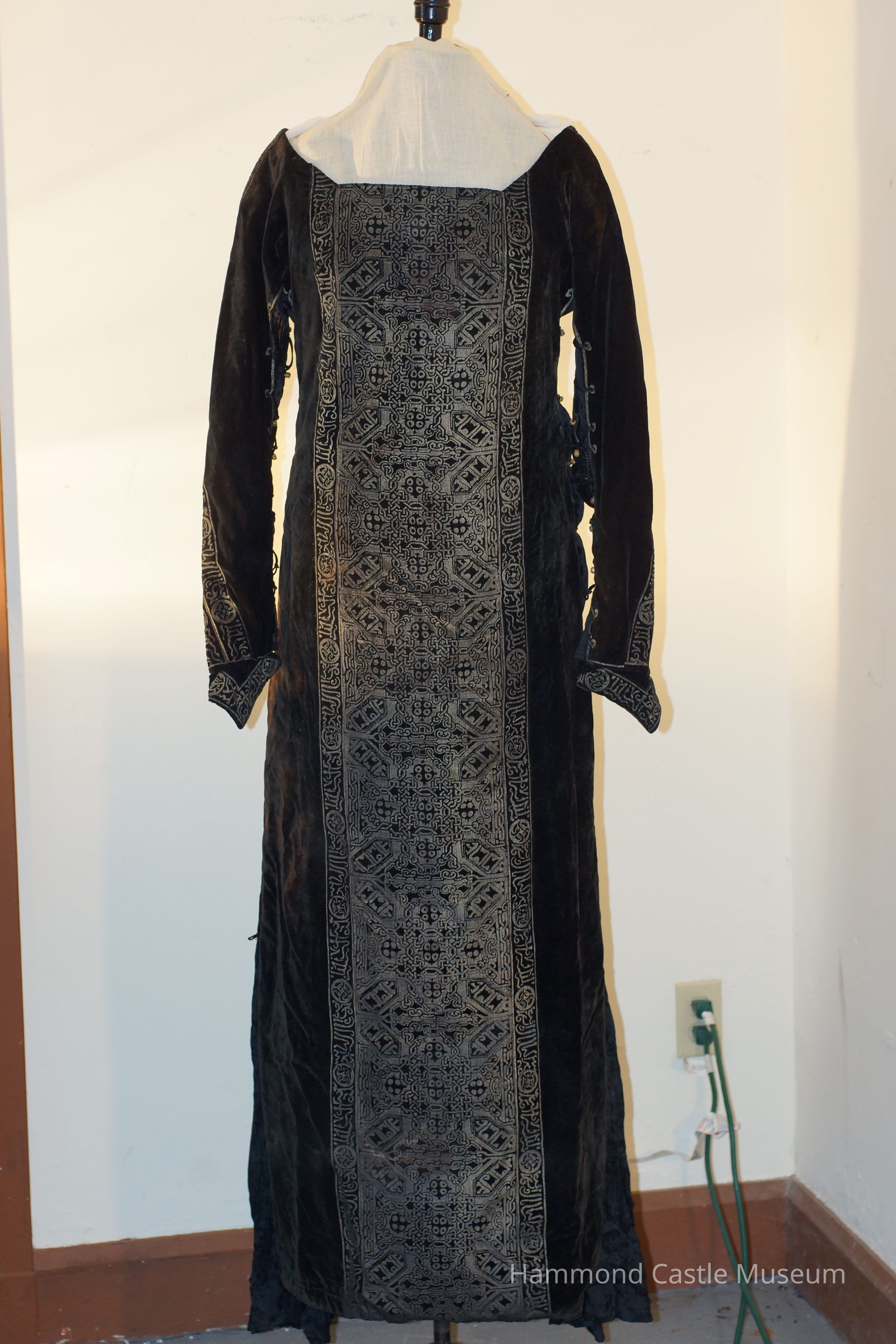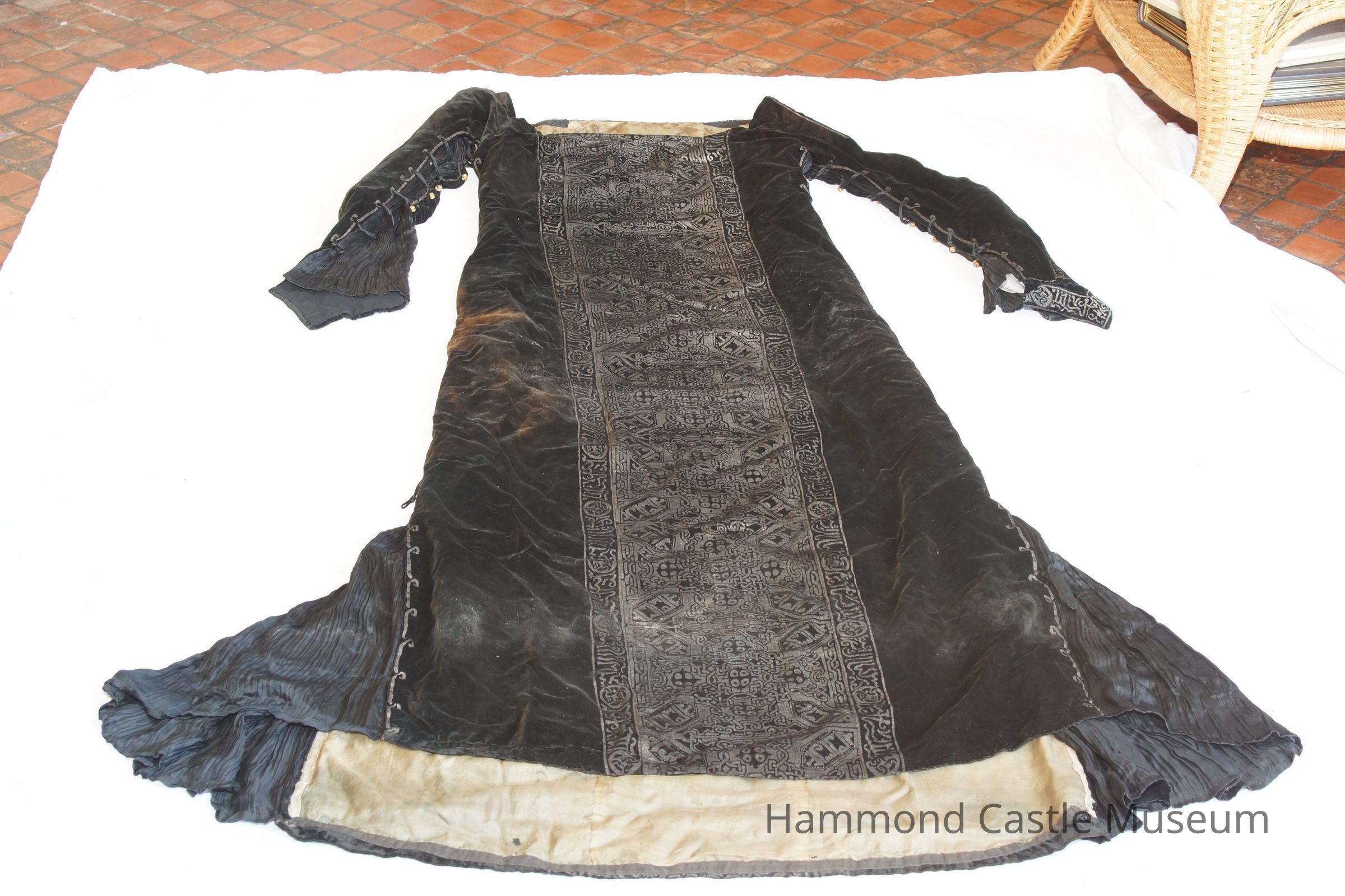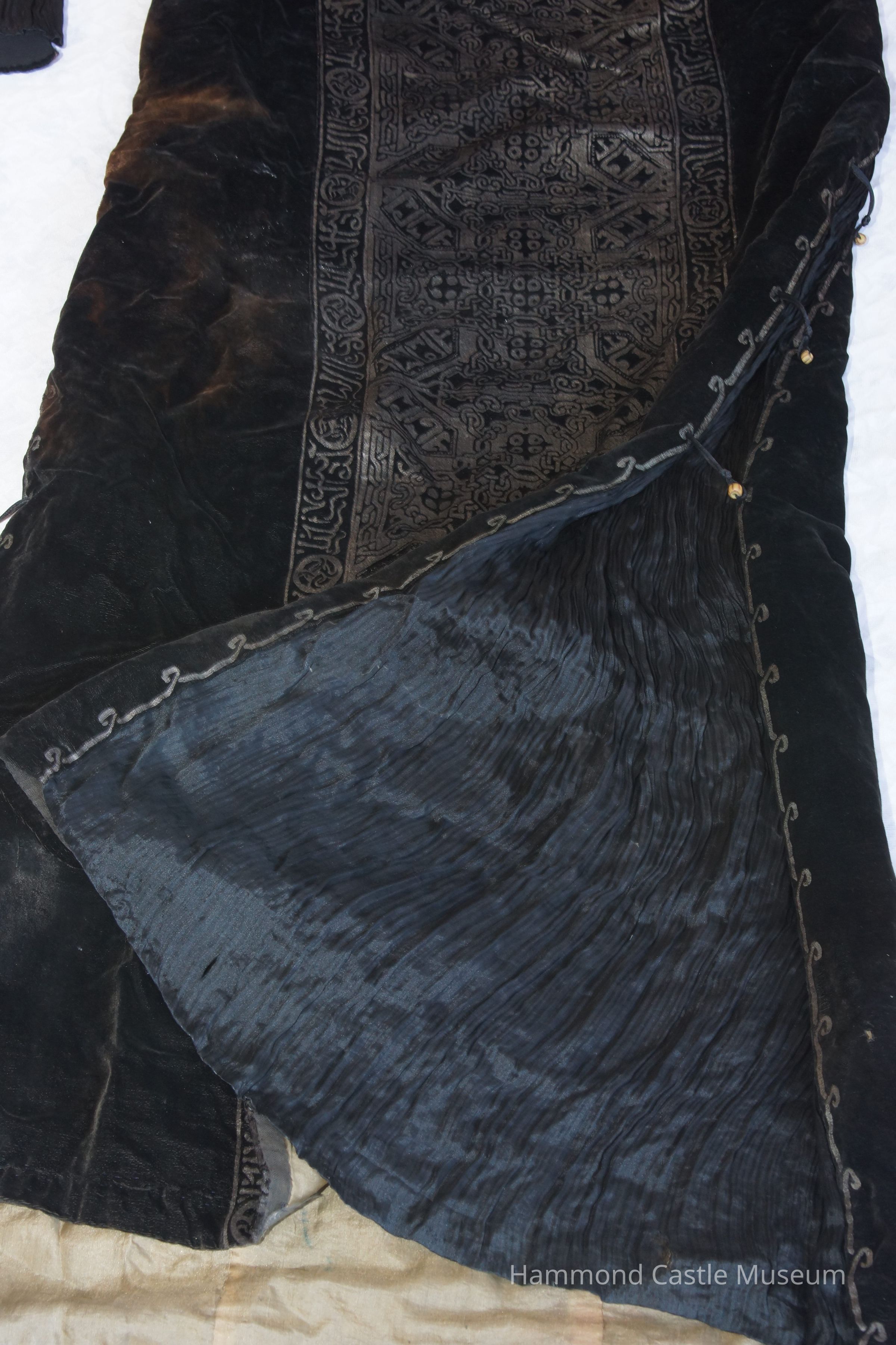 Dress is designed by Mariano Fortuny y Madrazo. Black velvet tabard dress with gold pleated silk panels, featuring a gold block-printed design on the front, back, and sleeves. The block print pattern on the black gown reflects Persian style influence from the fifteenth century. This particular pattern is called "Moresco", a word in Italian which literally translates to "Moorish". Donated by Princess Evangeline Zalstem-Zalessky