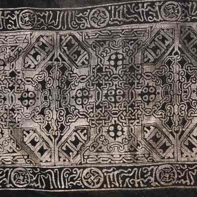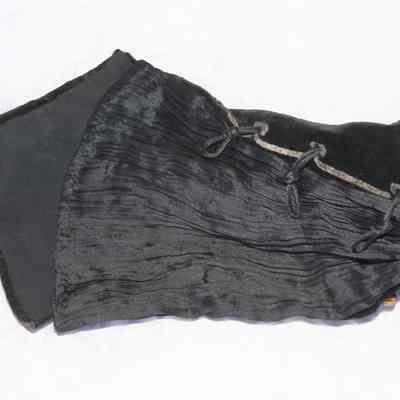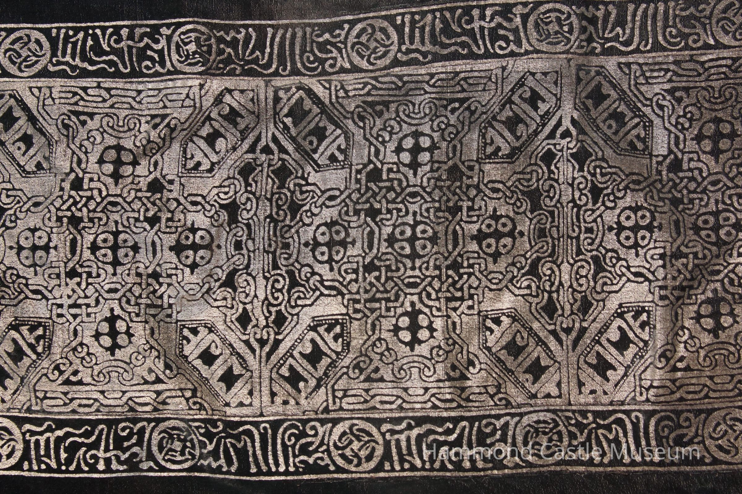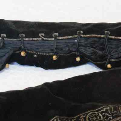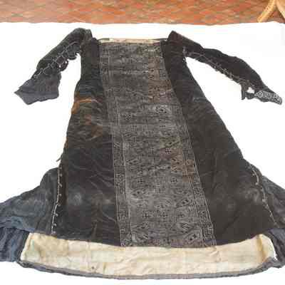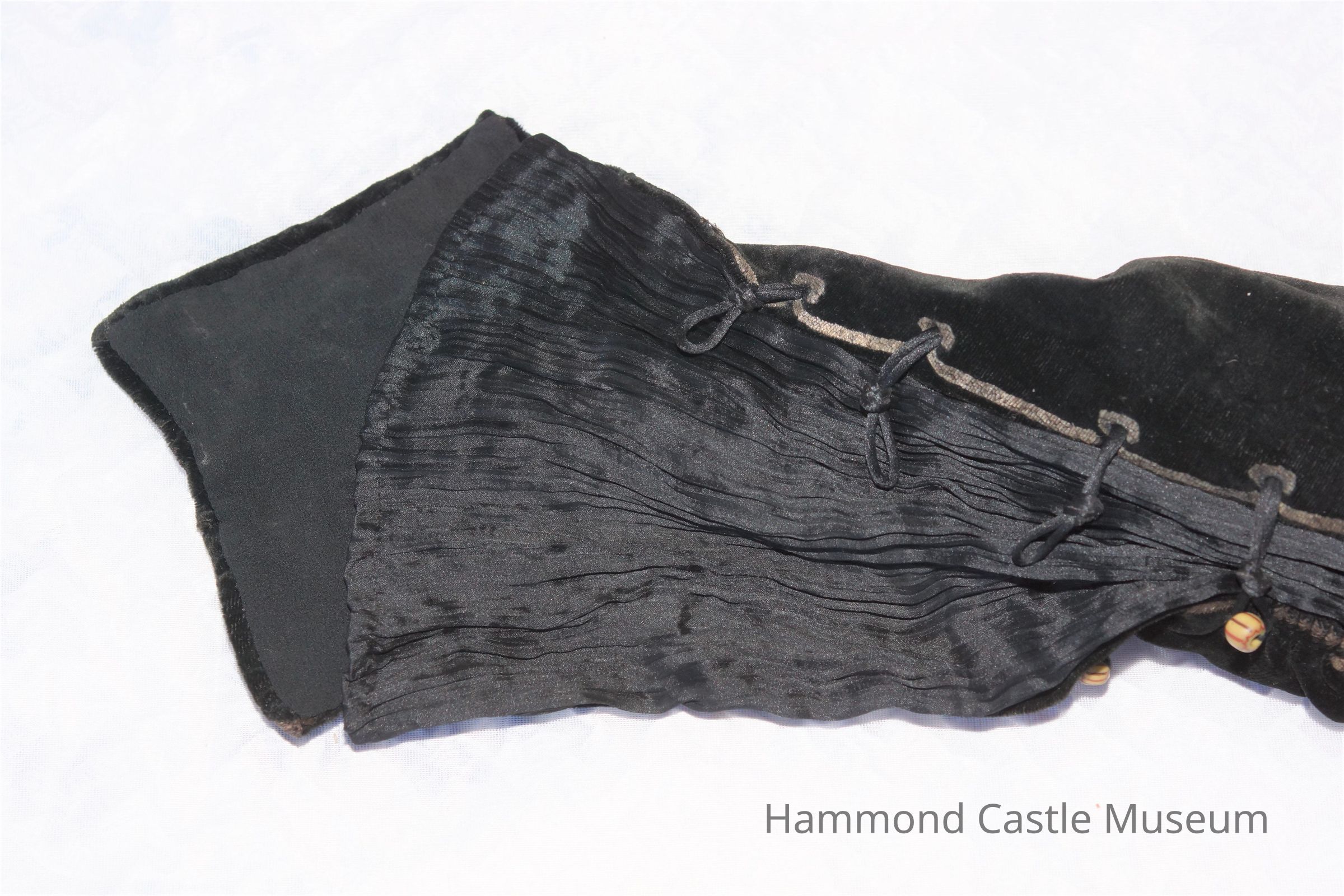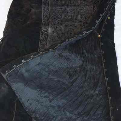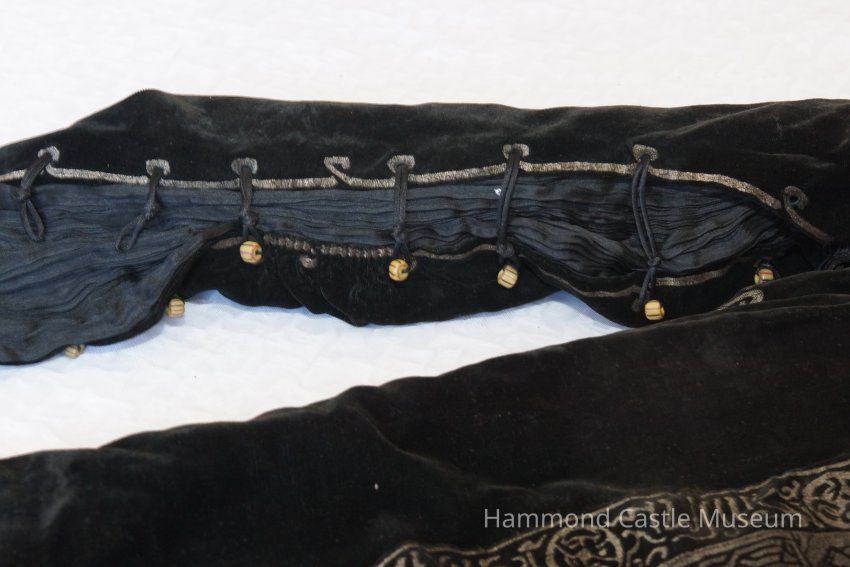 Dress is designed by Mariano Fortuny y Madrazo. Black velvet tabard dress with gold pleated silk panels, featuring a gold block-printed design on the front, back, and sleeves. The block print pattern on the black gown reflects Persian style influence from the fifteenth century. This particular pattern is called "Moresco", a word in Italian which literally translates to "Moorish". Donated by Princess Evangeline Zalstem-Zalessky