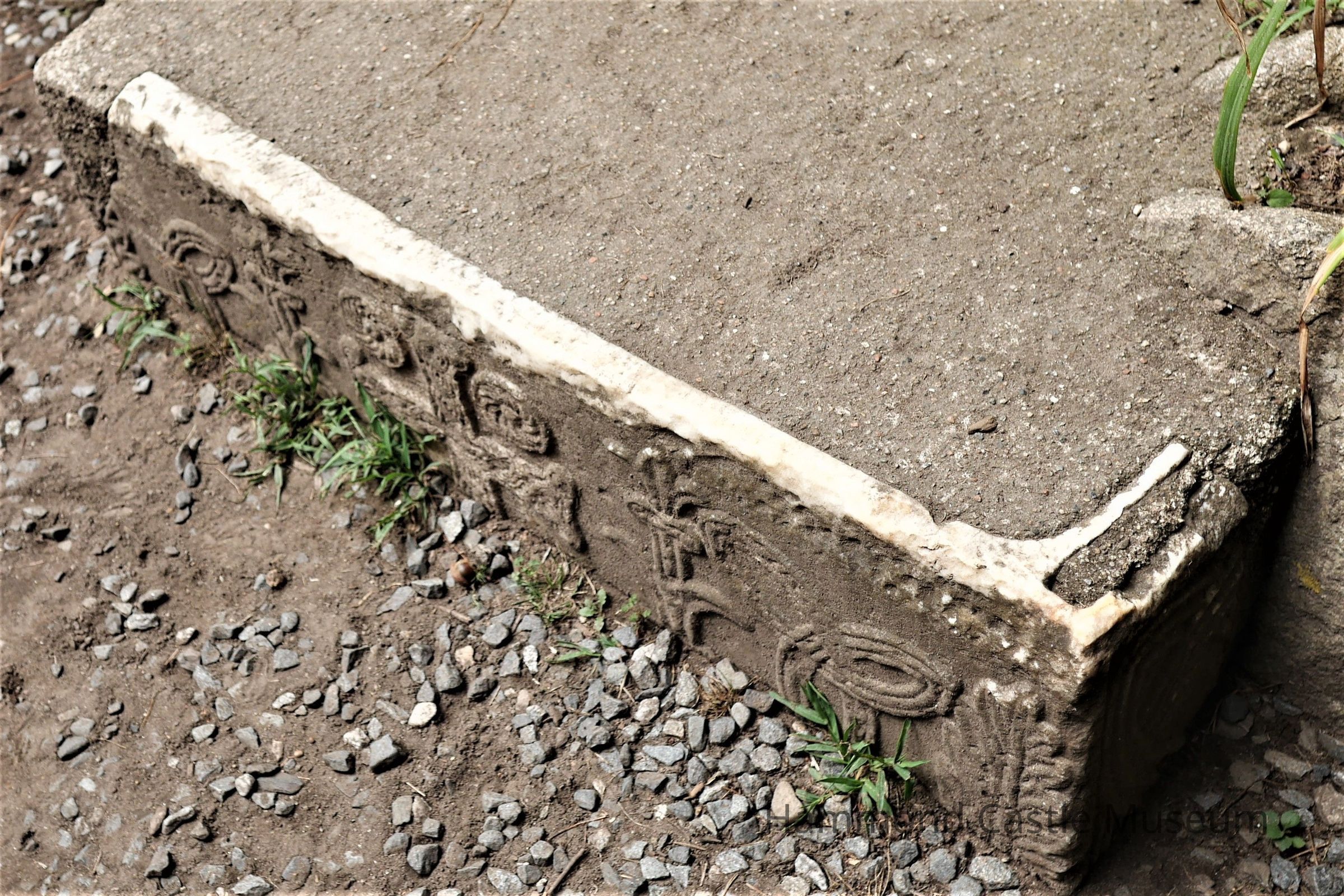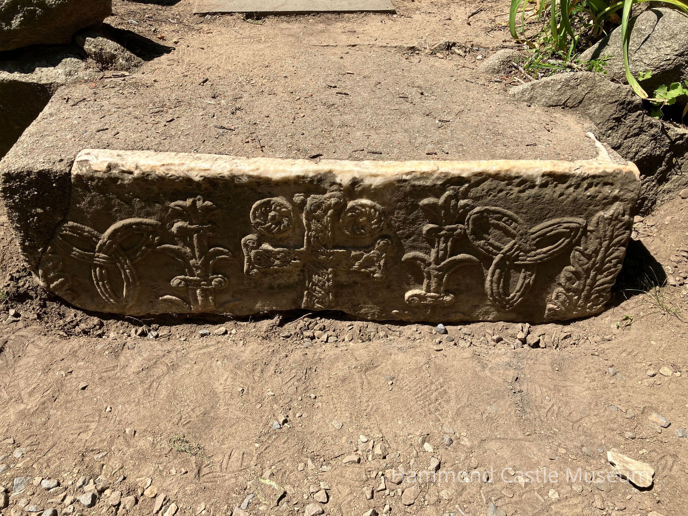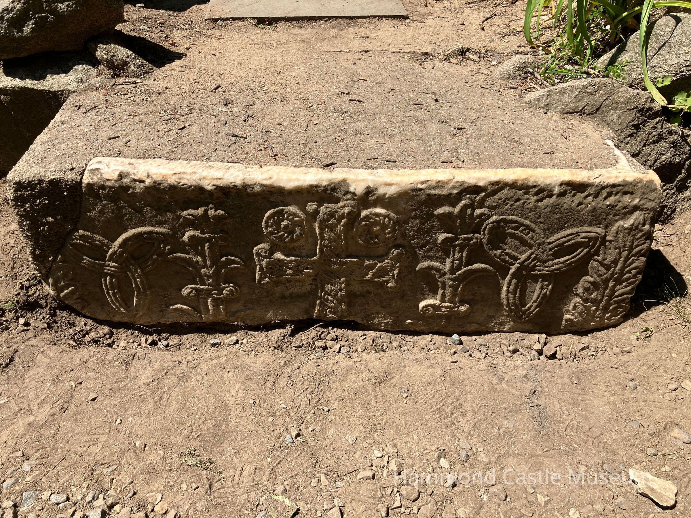 Cross Relief Sarcophagus Fragment Originally a side of a child's sarcophagus Decorative cross relief with flowers on either side Cat garden step along path