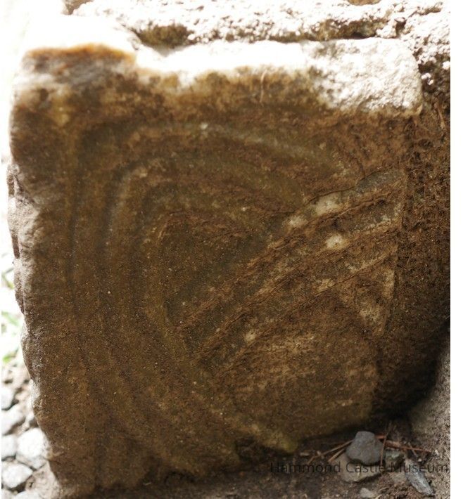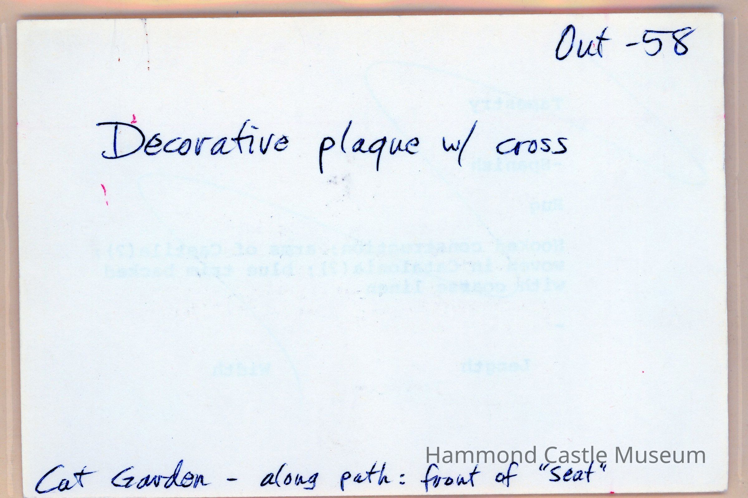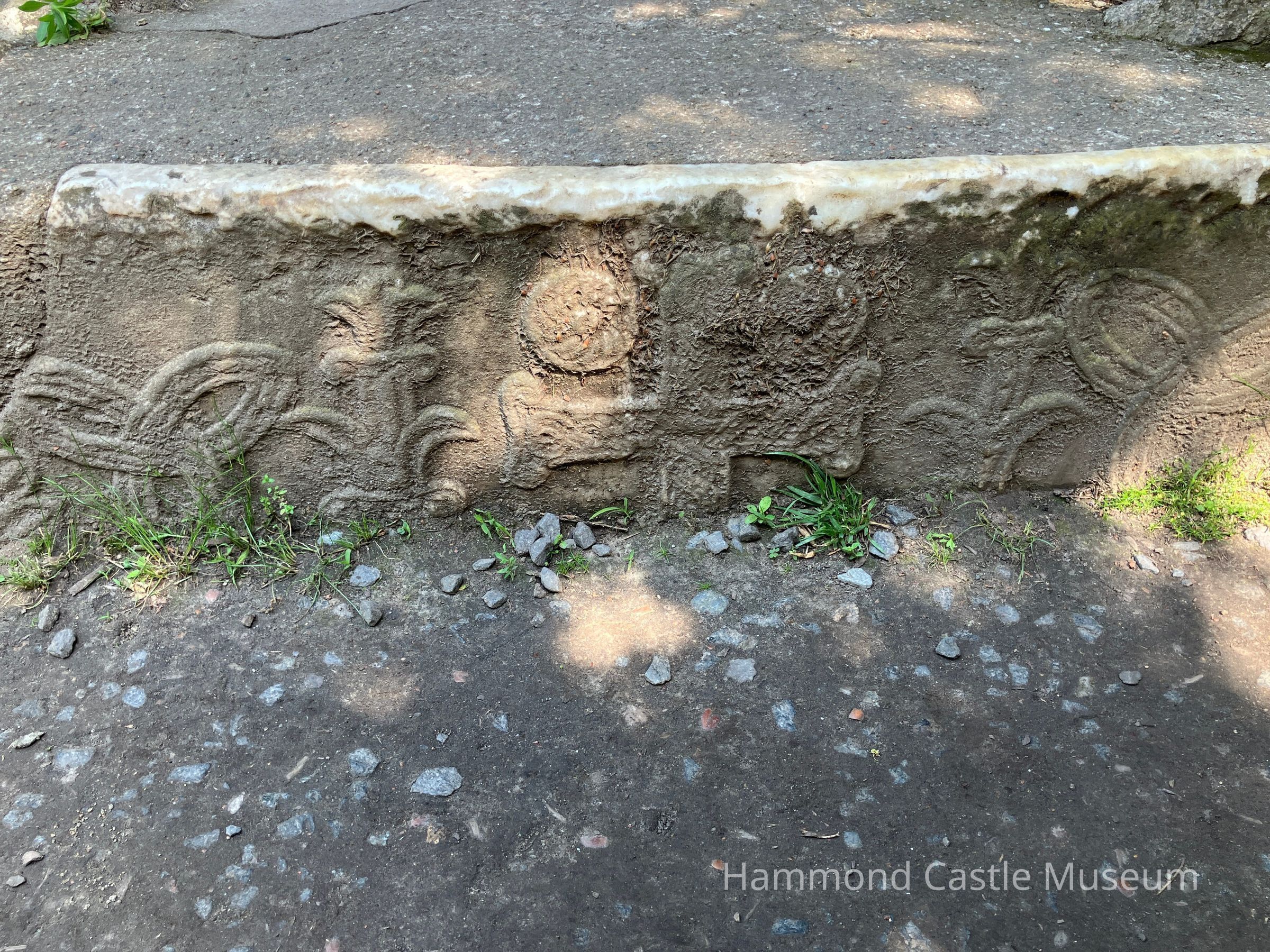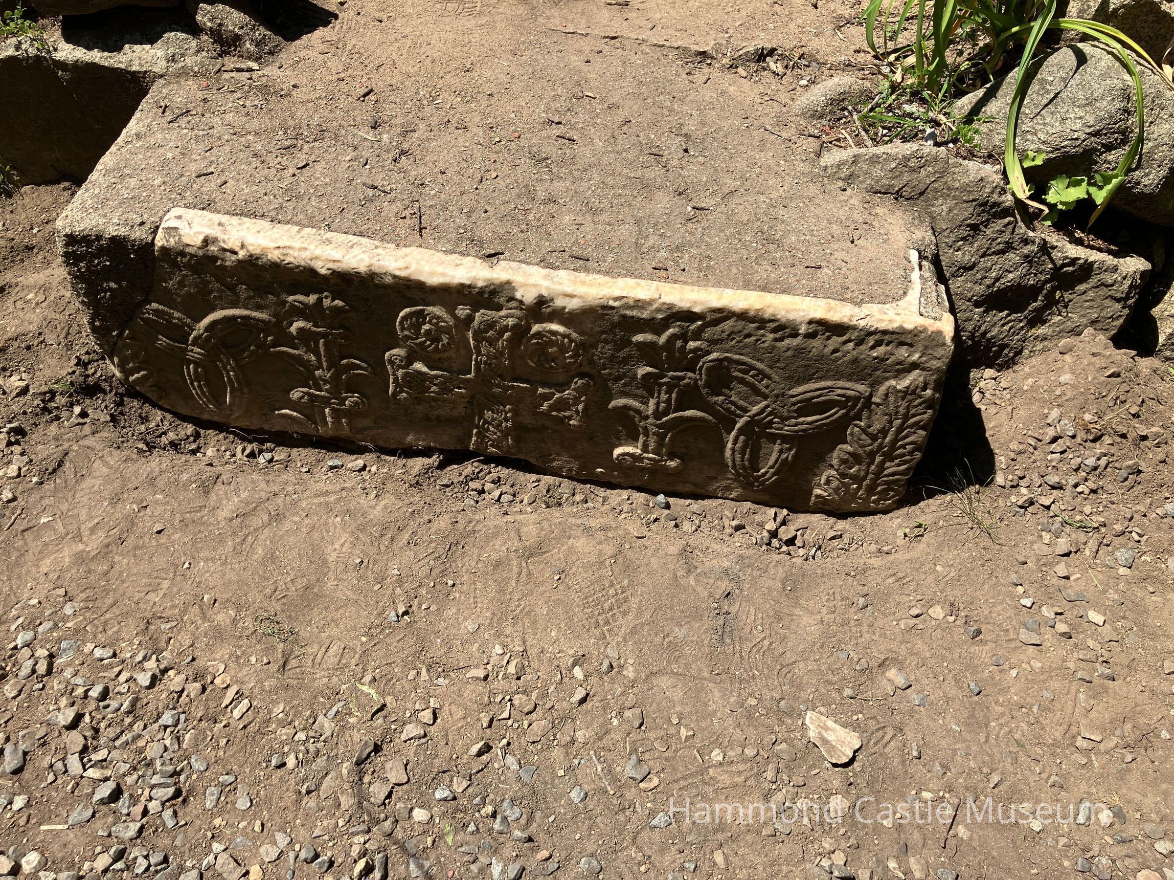 Cross Relief Sarcophagus Fragment Originally a side of a child's sarcophagus Decorative cross relief with flowers on either side Cat garden step along path