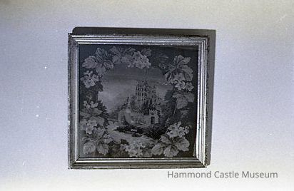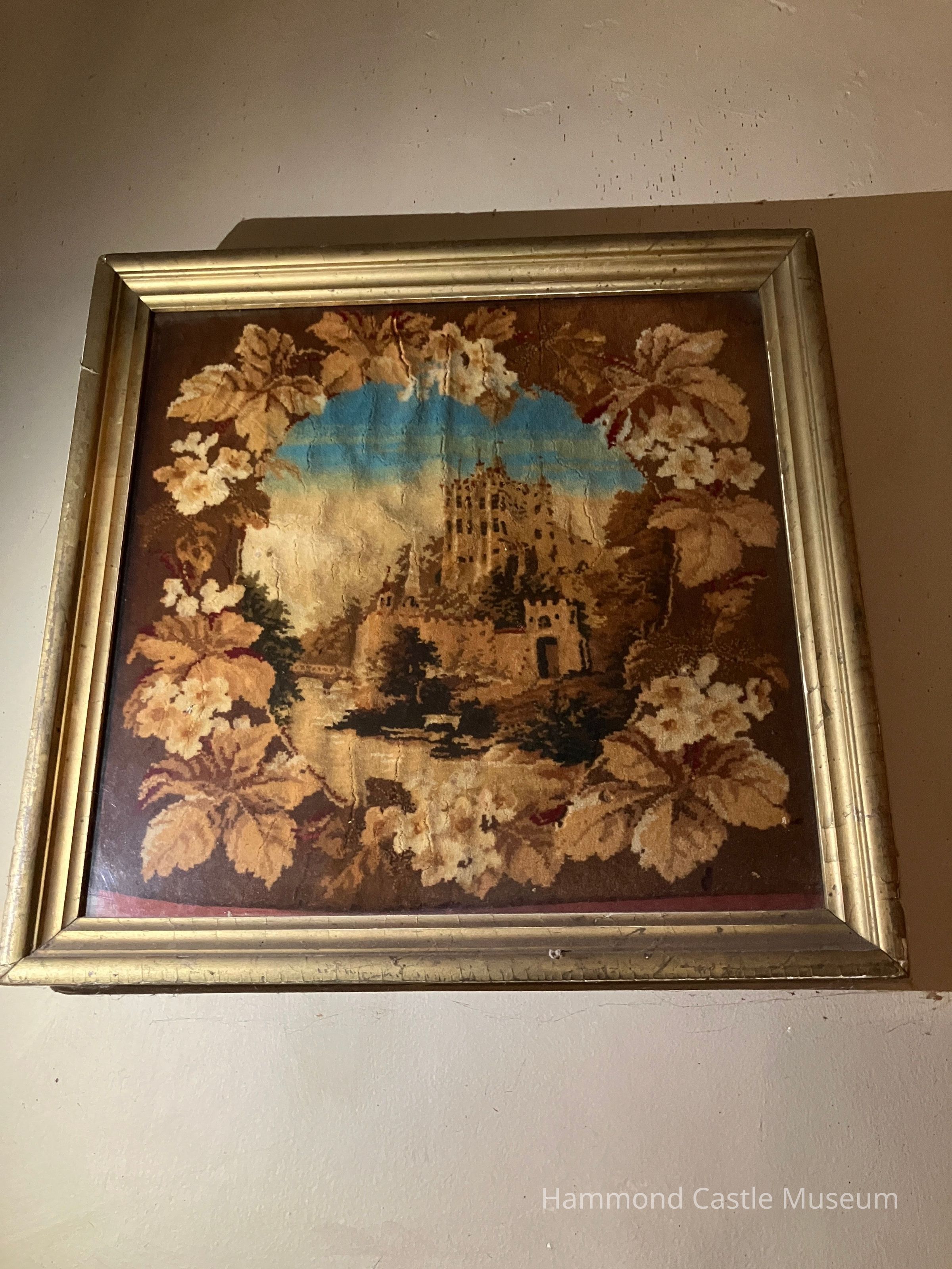 Framed velvet or petti point picture with floral design around castle scene Gold frame In Lower Guestroom when Hammond died 1965