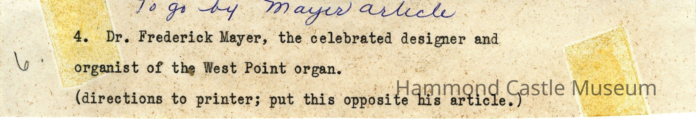 Photo & inscriptions of Frederick Mayer, West Point Chapel organ (Mayer was a friend of Hammond and fellow organ enthusiast)