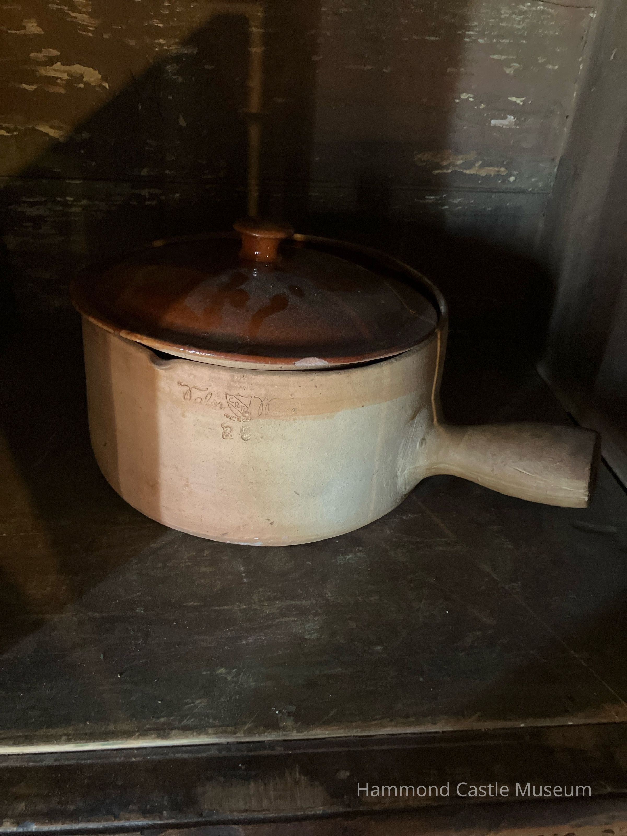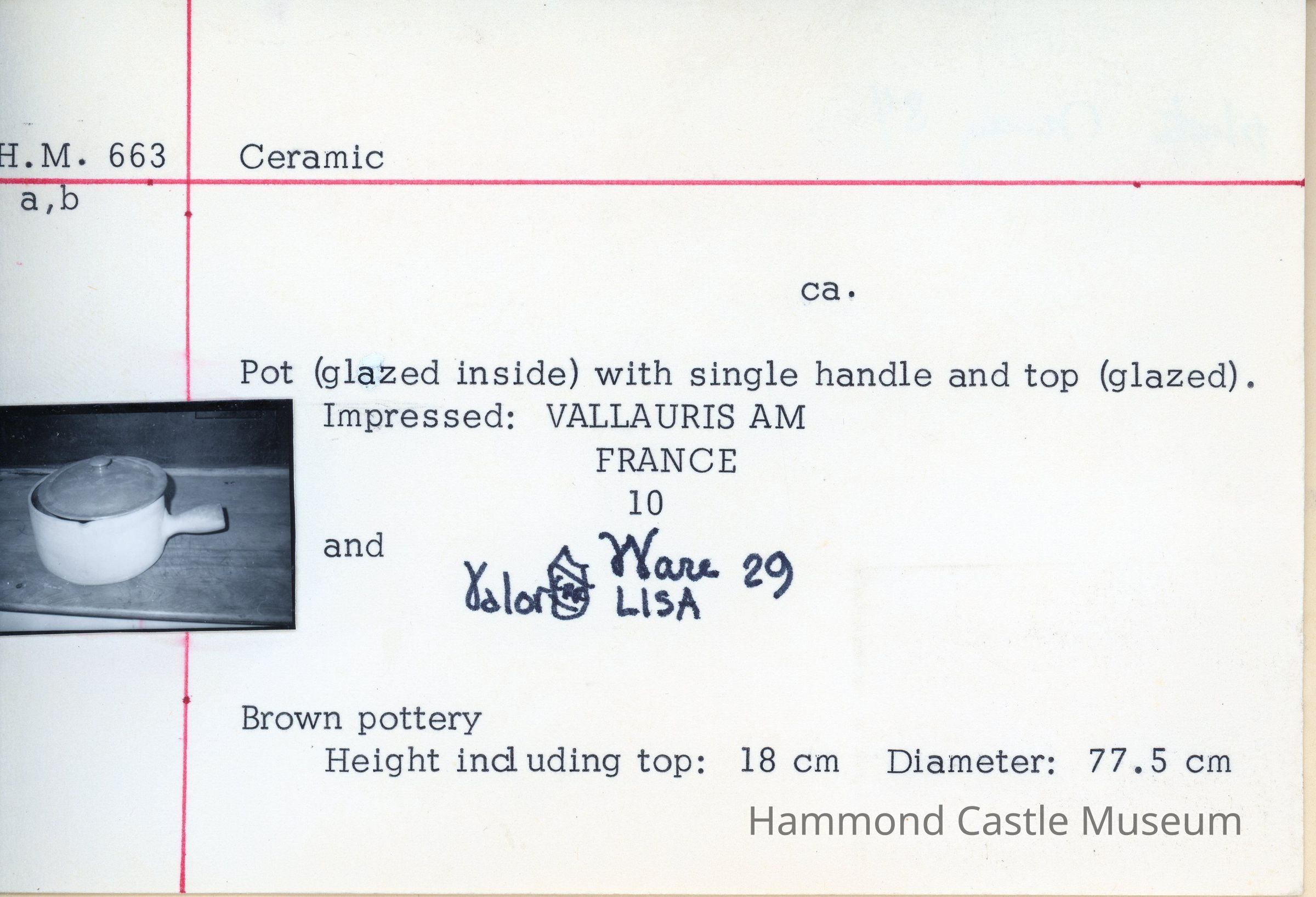French brown pottery pot (glazed inside) with single handle and top (glazed). Impressed: VALLARUIS AM FRANCE 10 VALOR (shield symbol) Ware 29 LISA