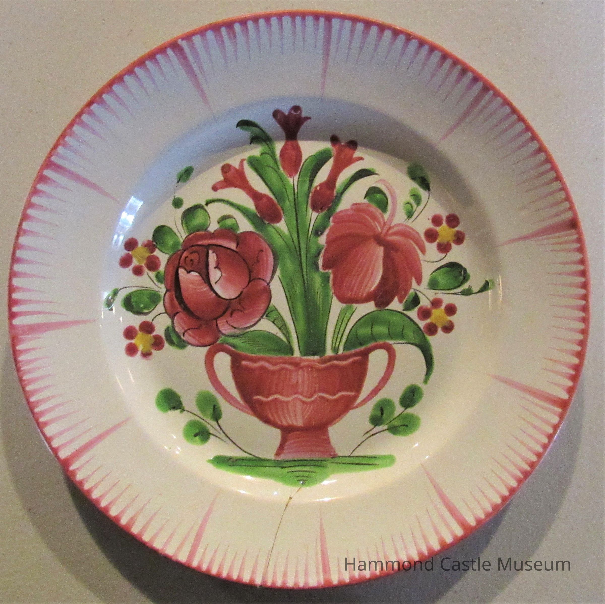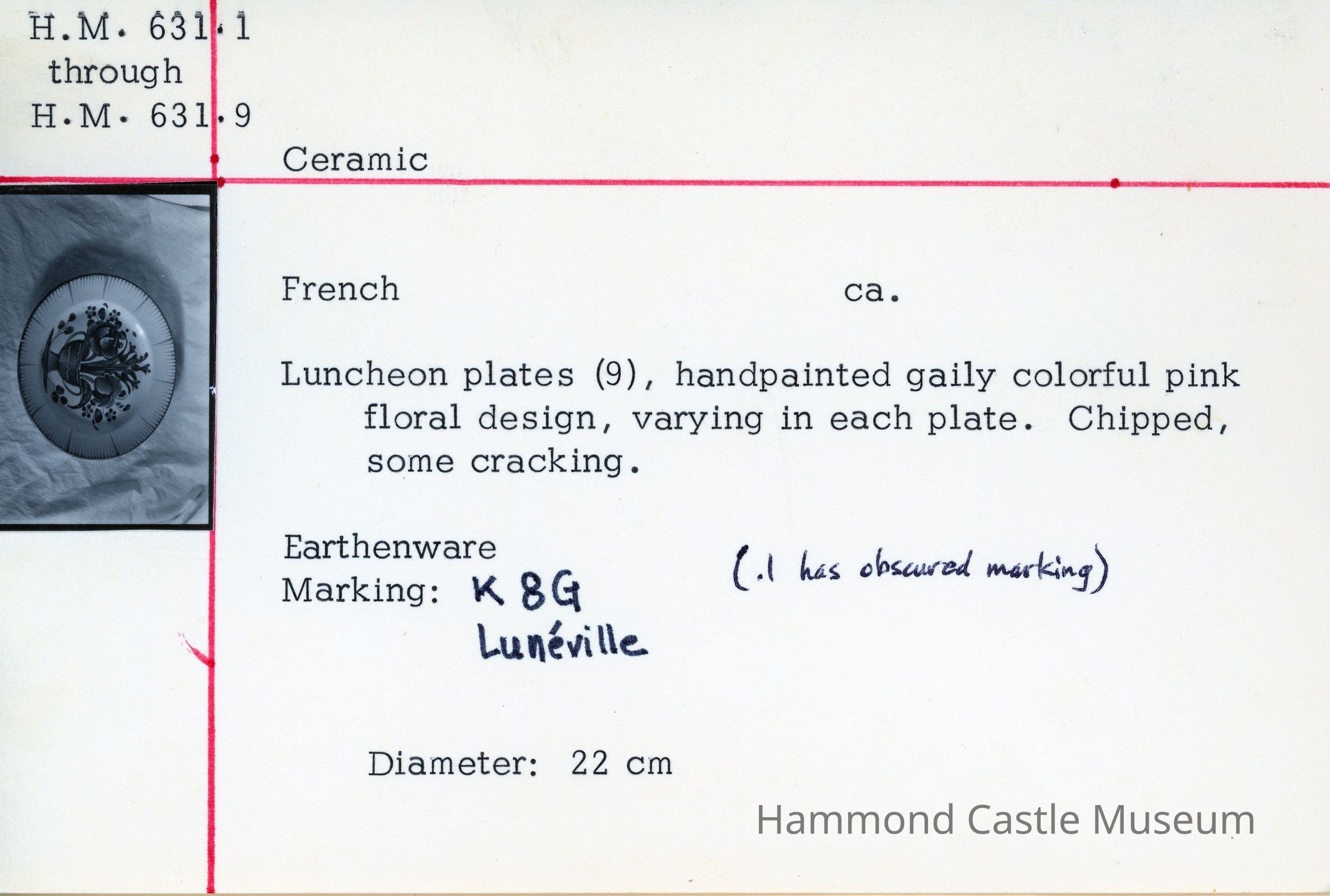 French ceramic luncheon plate. Handpainted gaily colorful pink floral design, varying in each plate. Chipped, some cracking. Earthenware. Marking: K8G Luneville