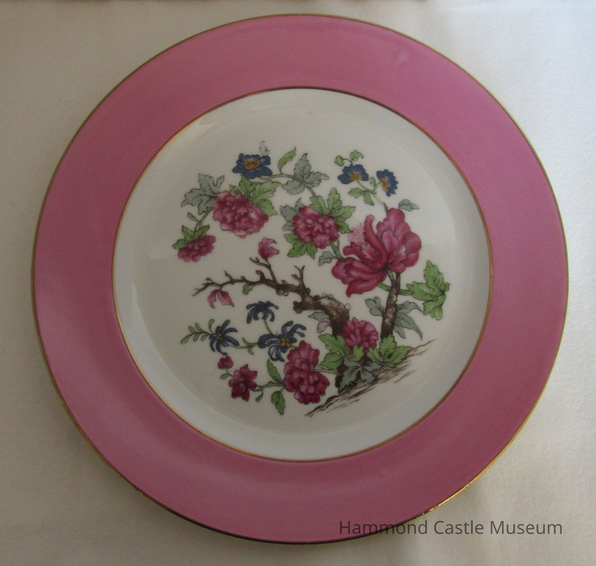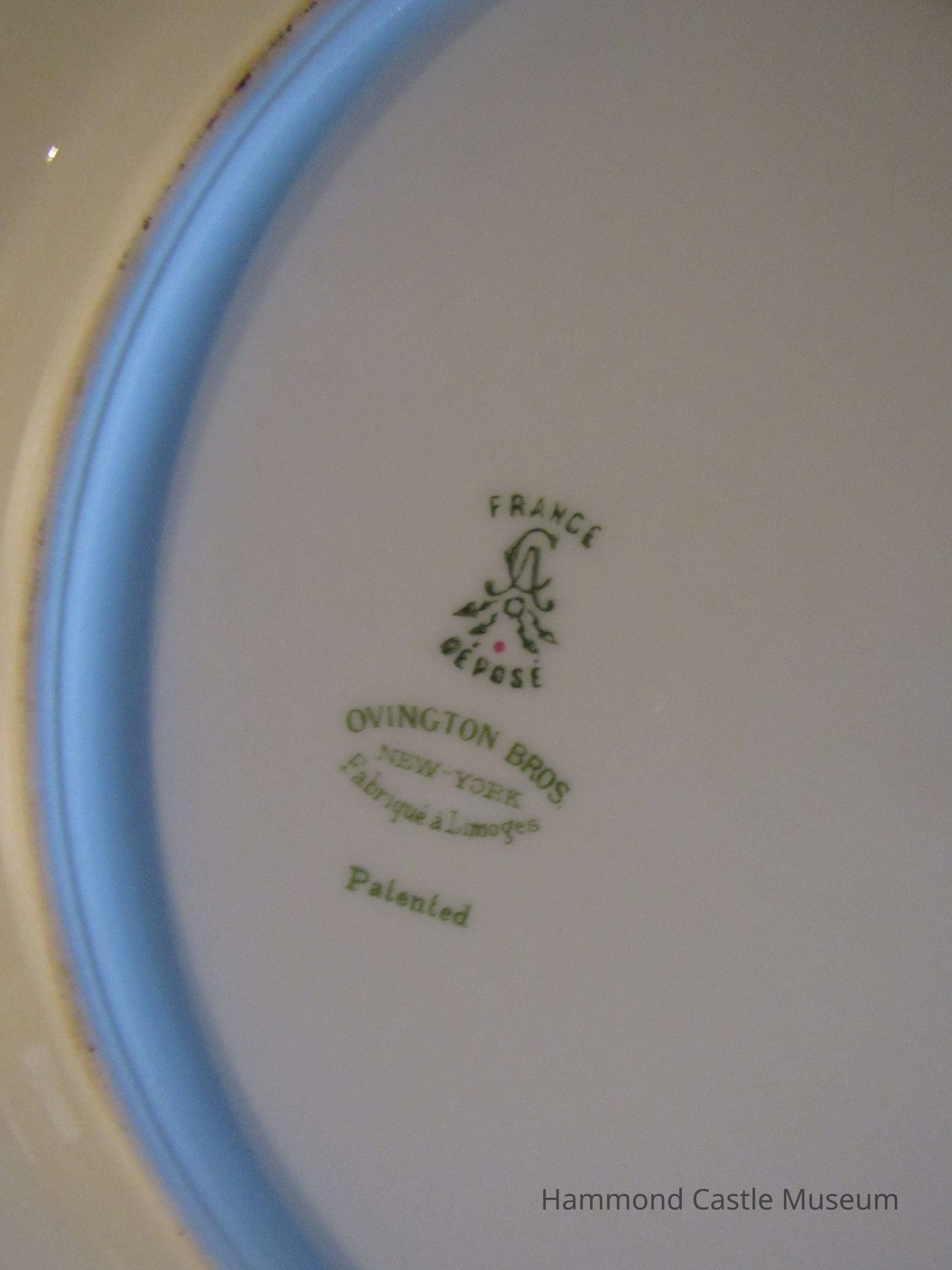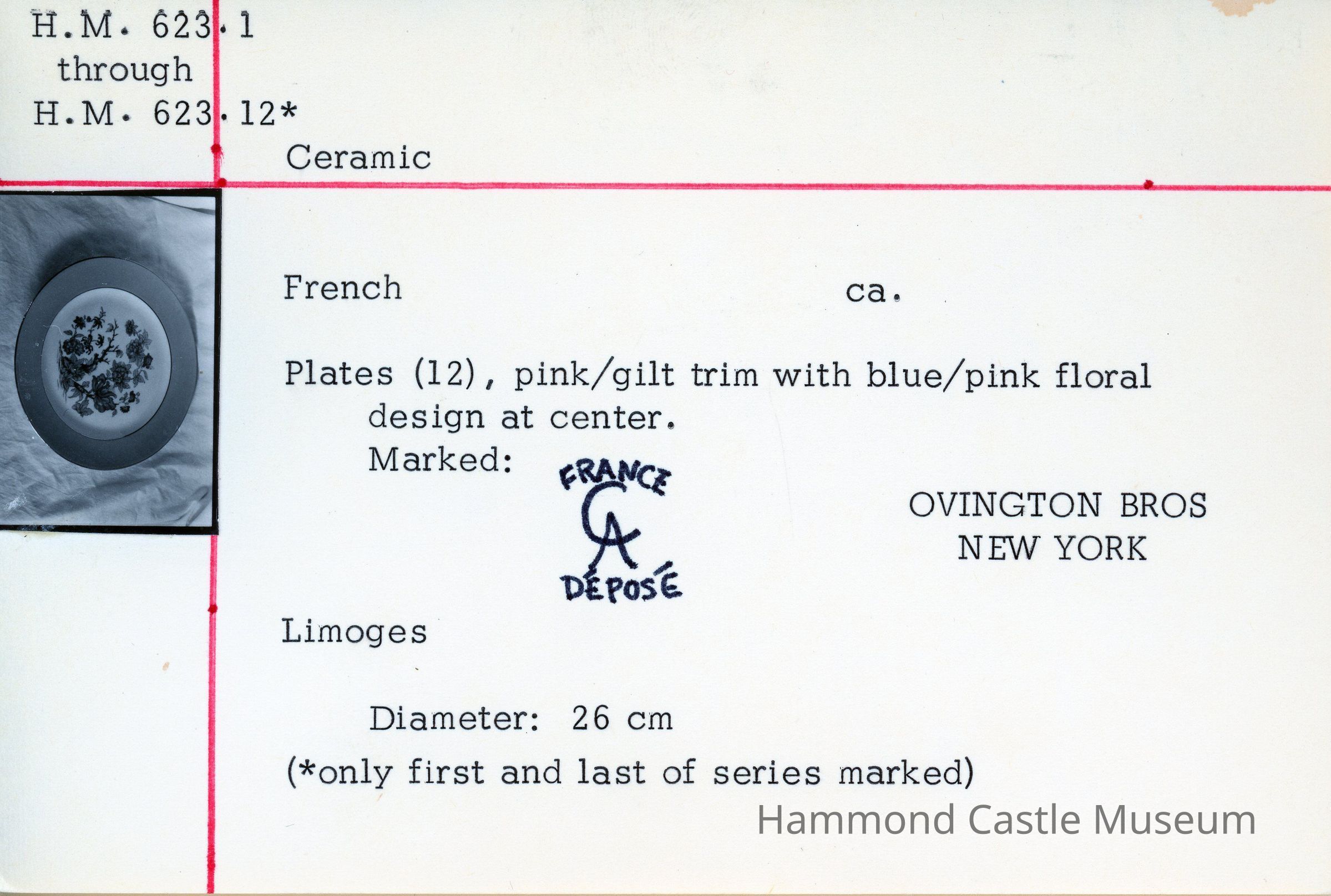 French ceramic plates. Pink/gilt trim wiht blue/pink floral design at center. Marked with maker's mark symbol of interconnected C and A, with "FRANCE" written above and "DEPOSE" written below. Also marked: OVINGTON BROS NEW YORK
