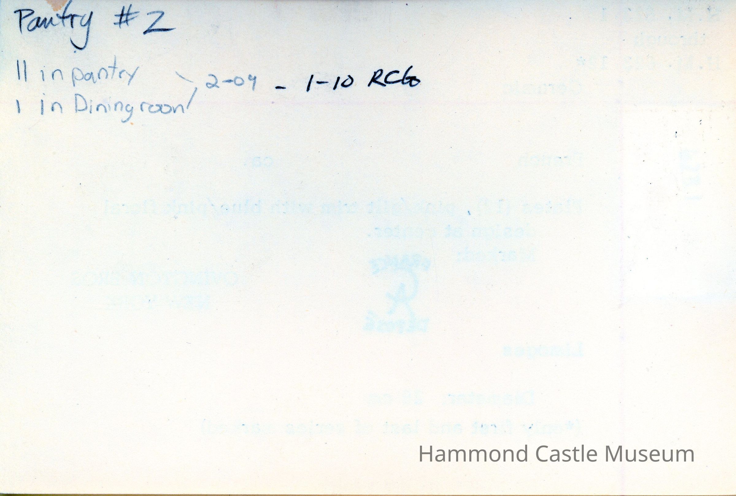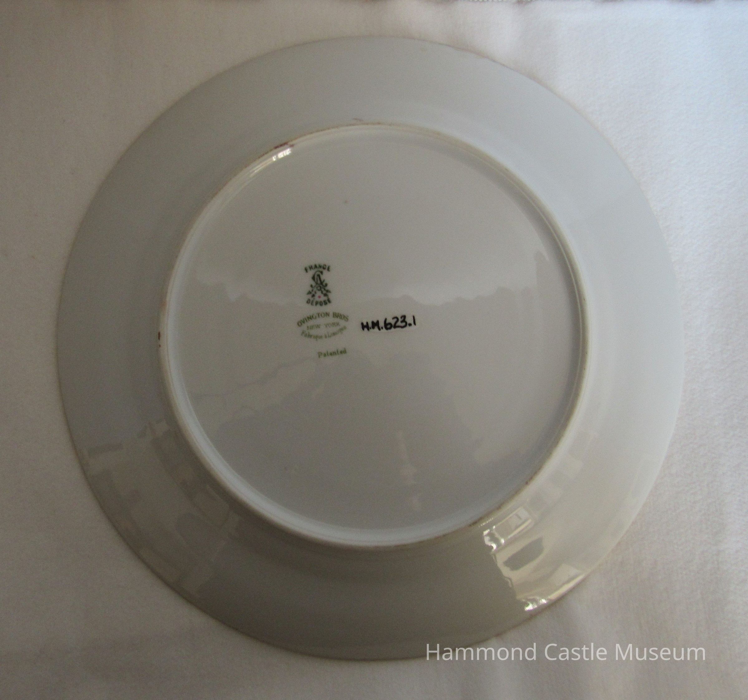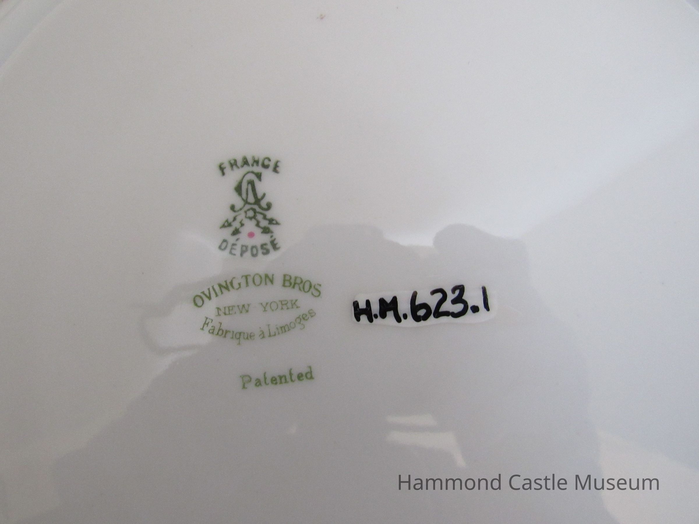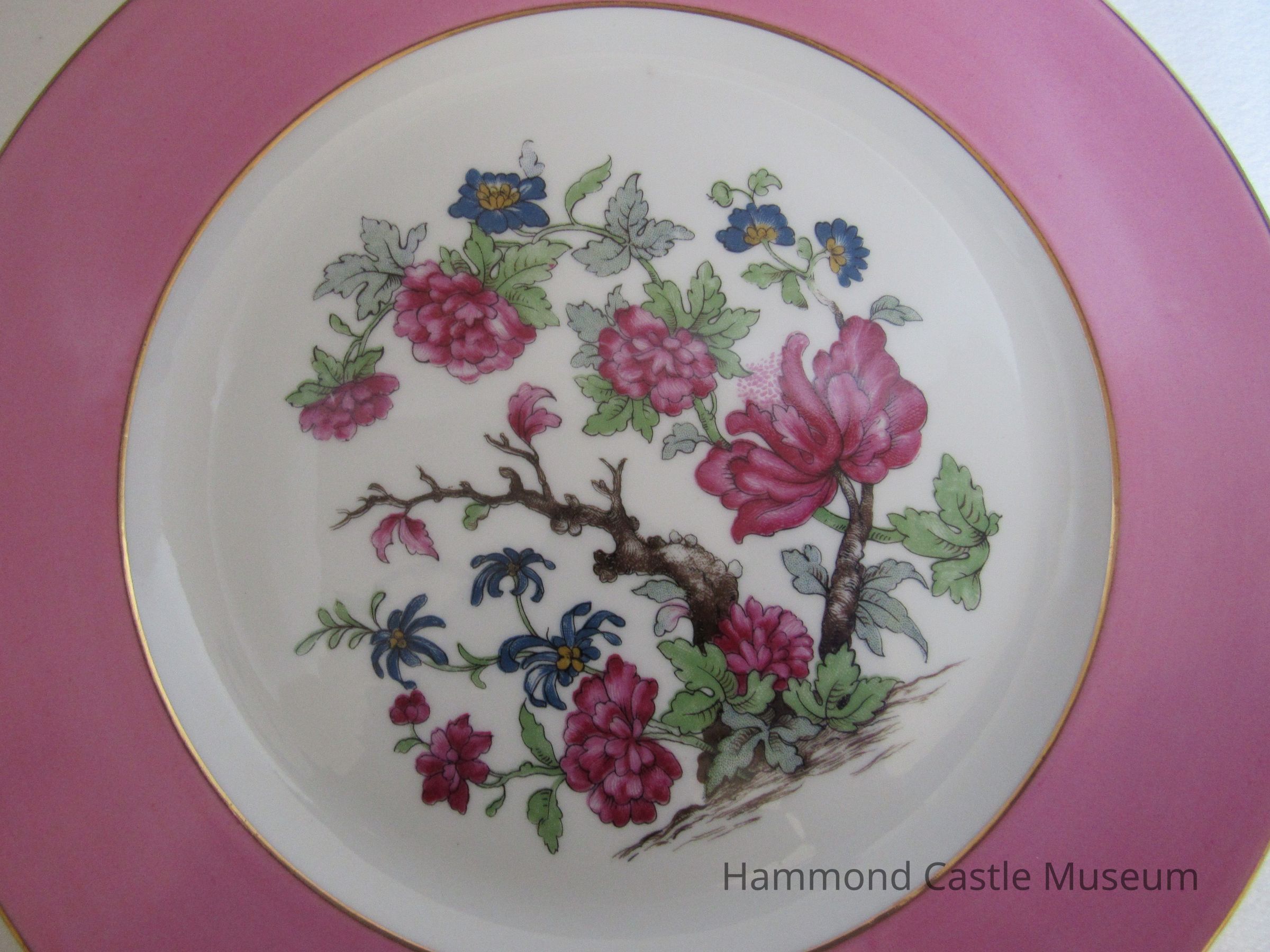 French ceramic plates. Pink/gilt trim wiht blue/pink floral design at center. Marked with maker's mark symbol of interconnected C and A, with "FRANCE" written above and "DEPOSE" written below. Also marked: OVINGTON BROS NEW YORK
