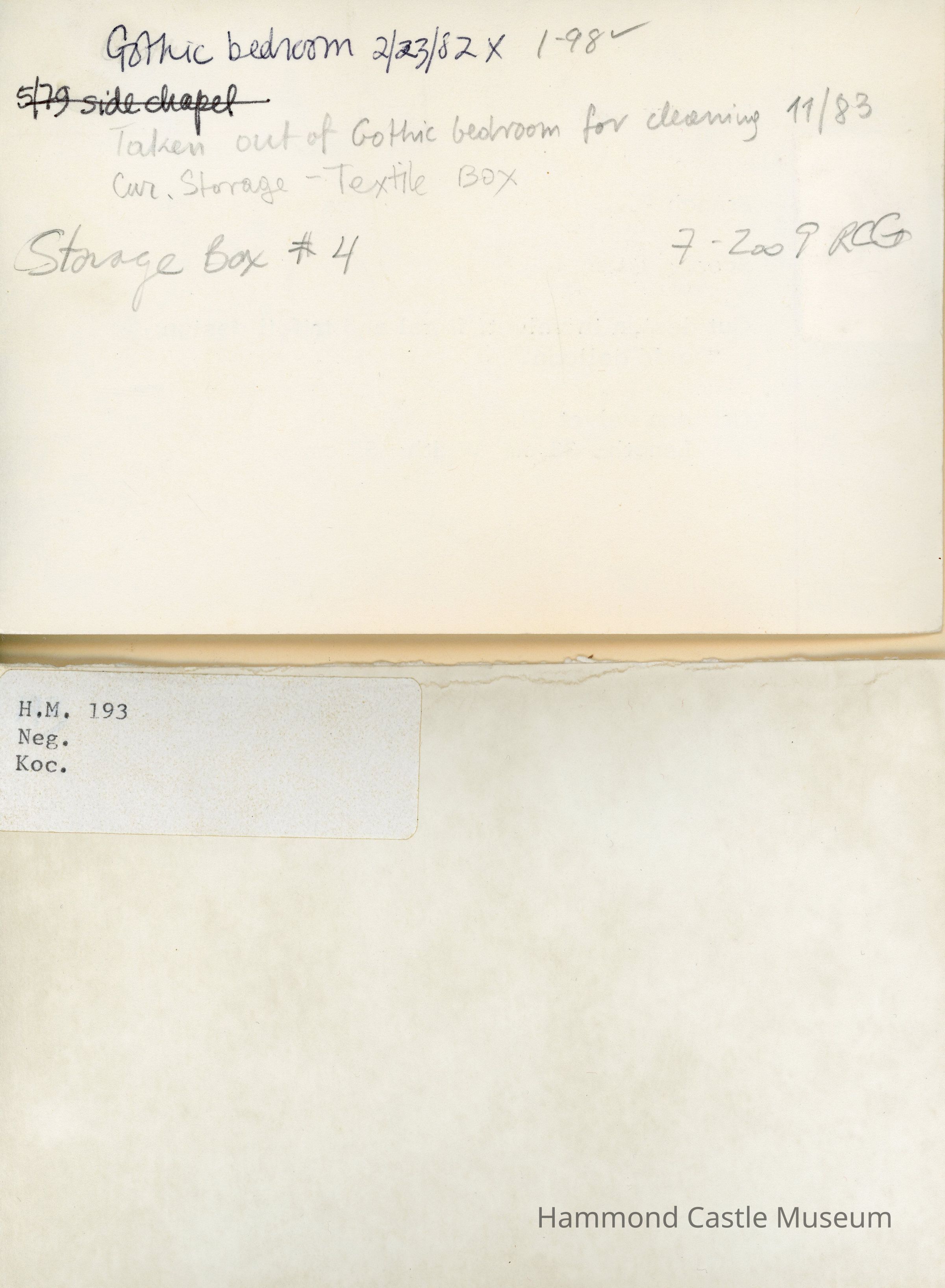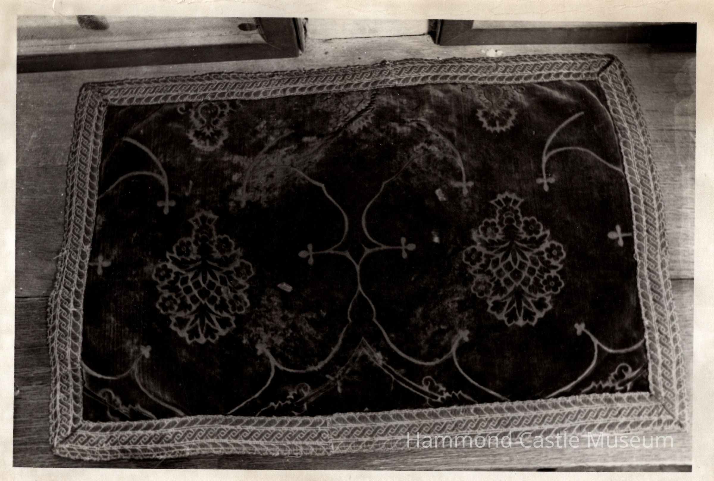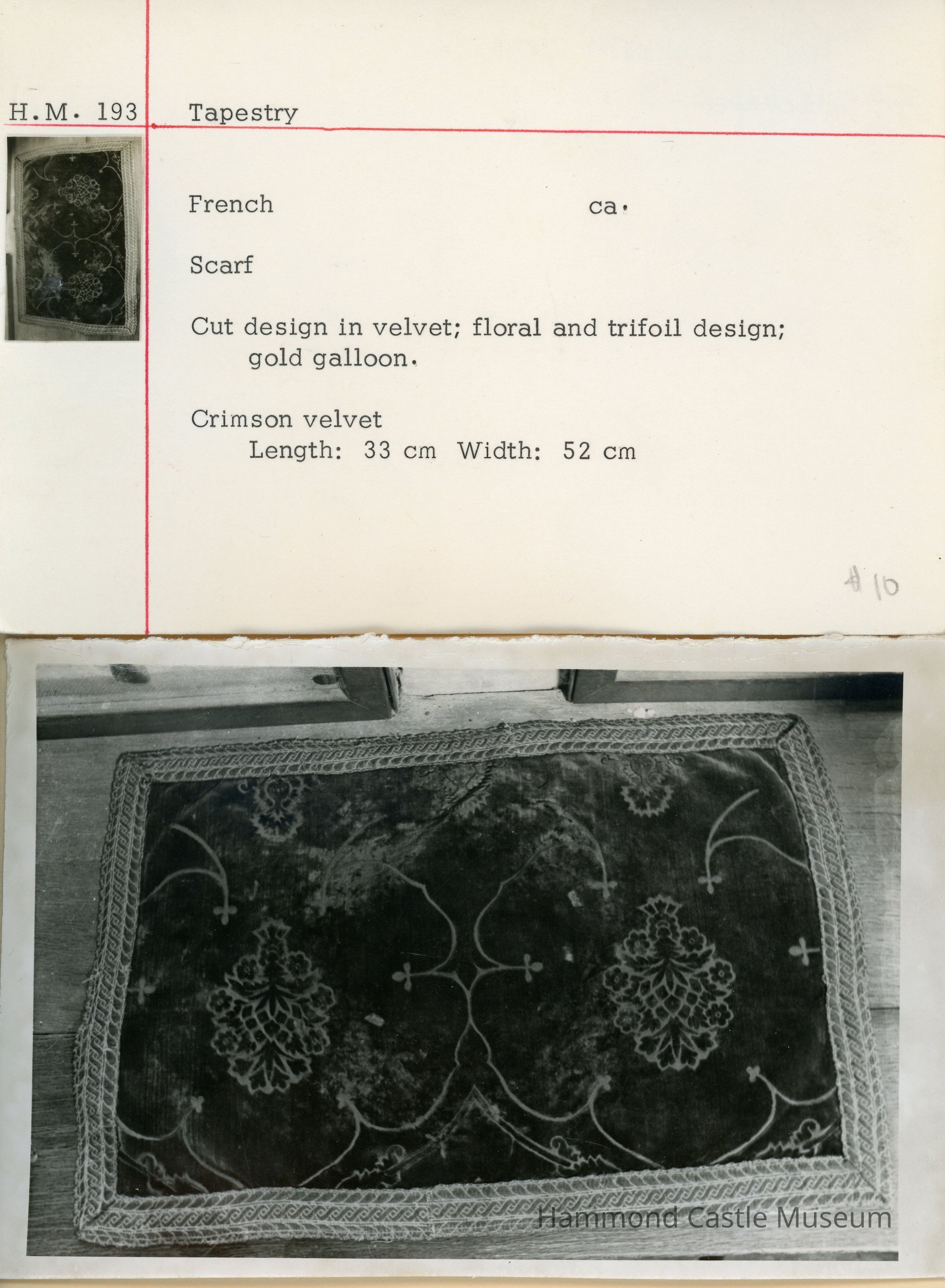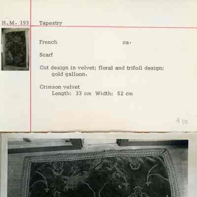 Cut design in crimson velvet; floral and trifoil design; gold galloon.