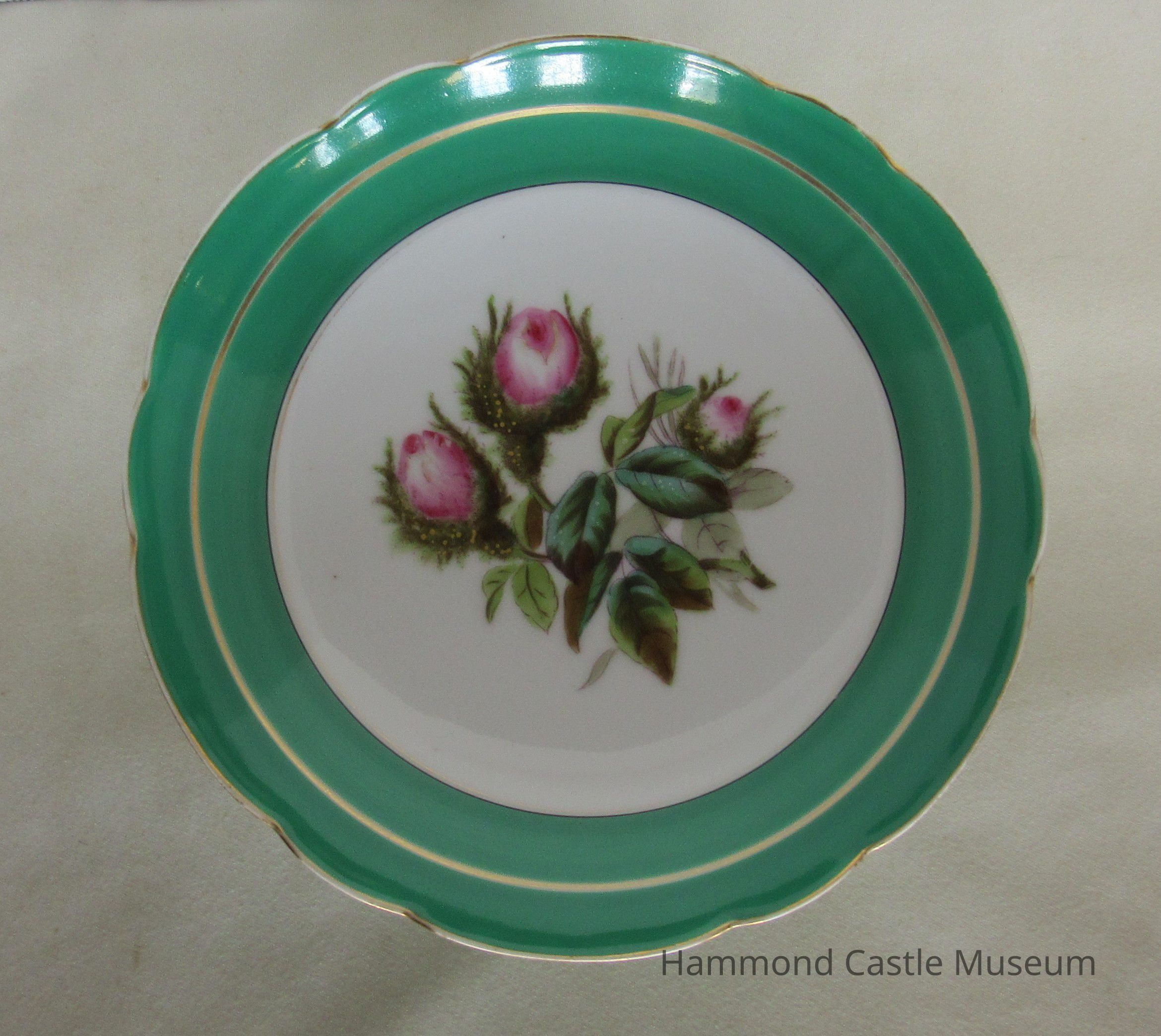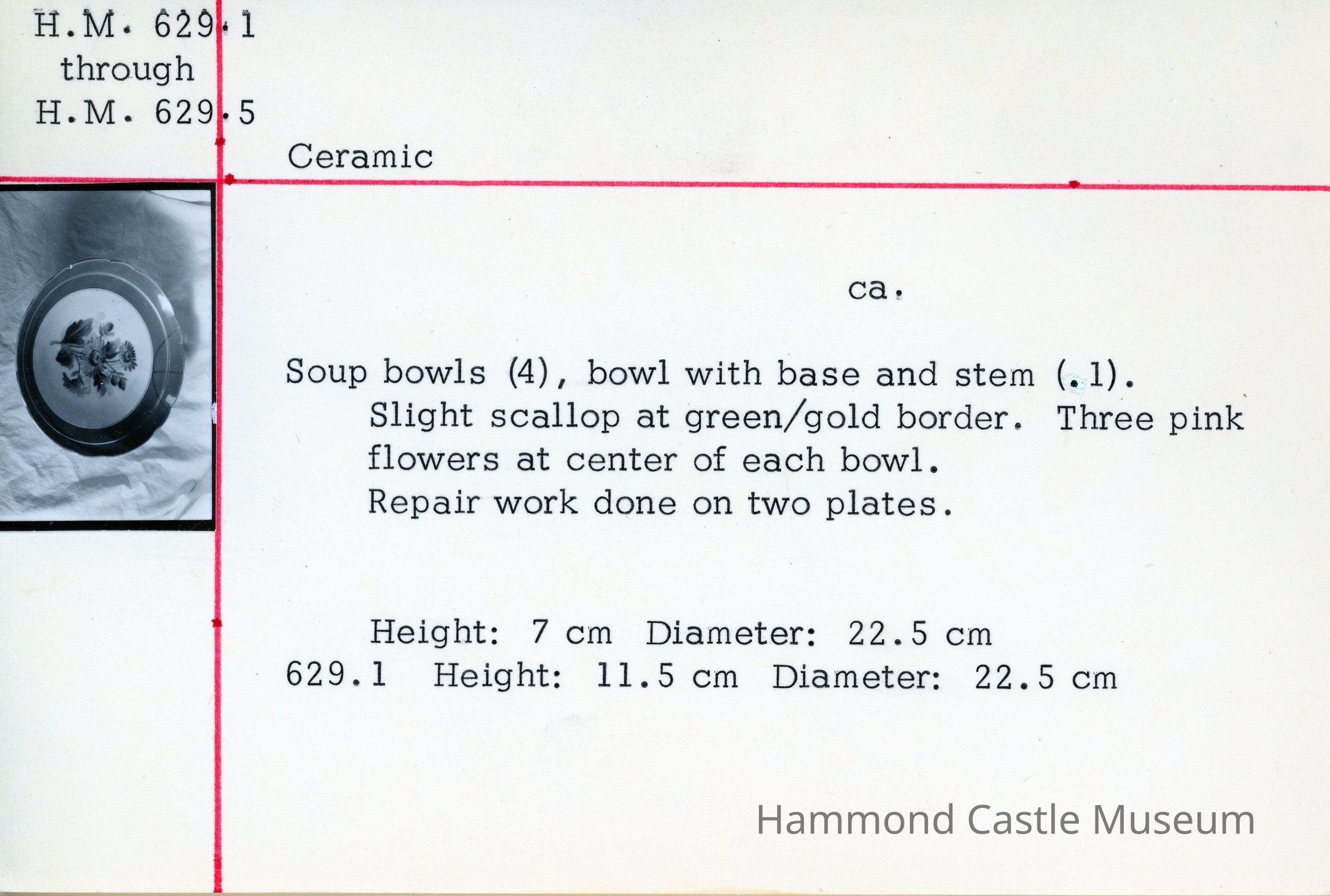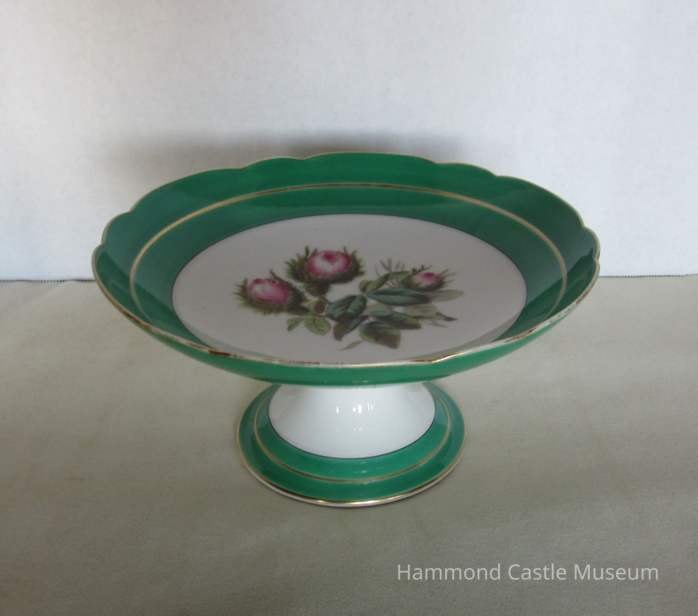Bowl with base and stem. Slight scallop at green/gold border. Three pink flowers at center of each bowl. Repair work done on two plates.