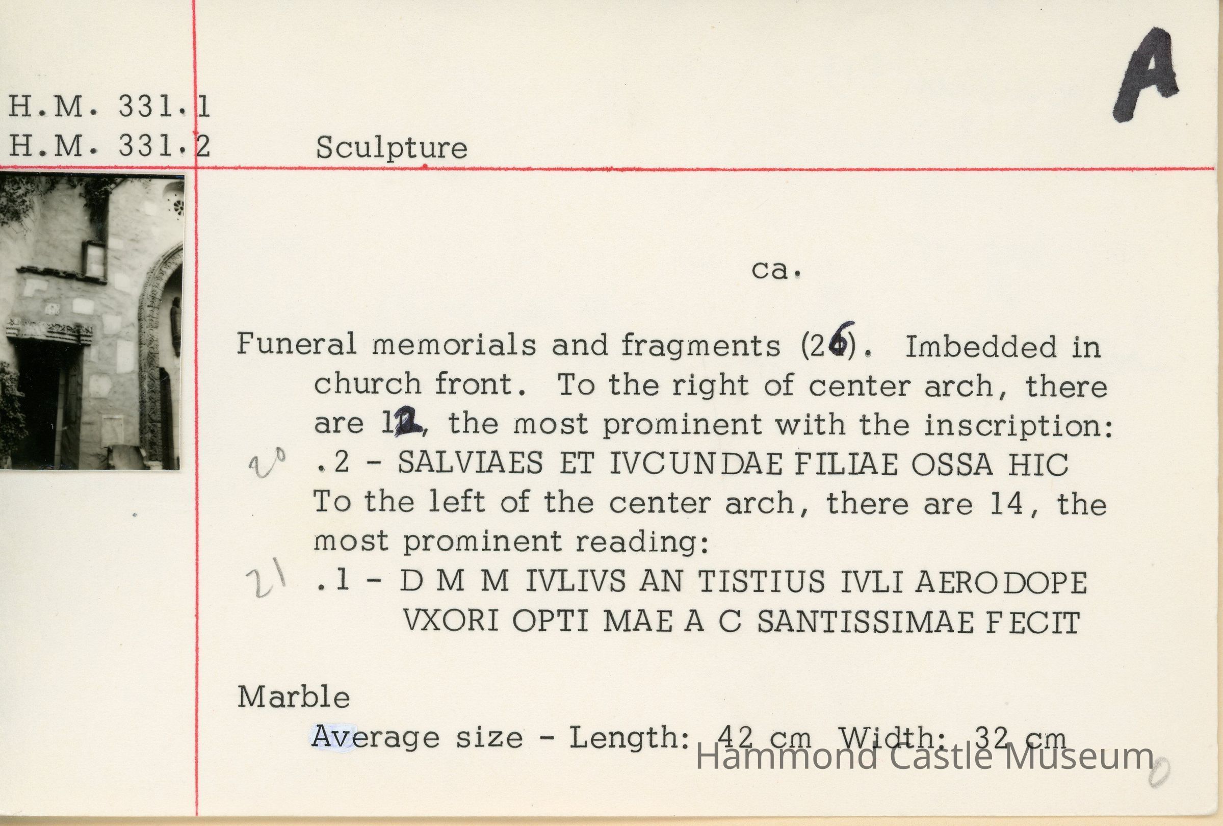 26 funeral memorials and fragments imbedded in wall facing the courtyard. (many part of HM-331 set but some individually numbered) Reportedly discovered 1926 in Roman catacombs To the left of the center arch, there are 14, the most prominent reading: 331.1: D M M IVLIVS AN TISTIUS IVLI AERODOPE VXORI OPTI MAE A C SANTISSIMAE F ECIT To the right of center arch, there are 12, the most prominent with the inscription: 331.2: SALVIAES ET IVCUNDAE FILIAE OSSA HIC Probably these are part of the "inscriptions" purchased from Pacific