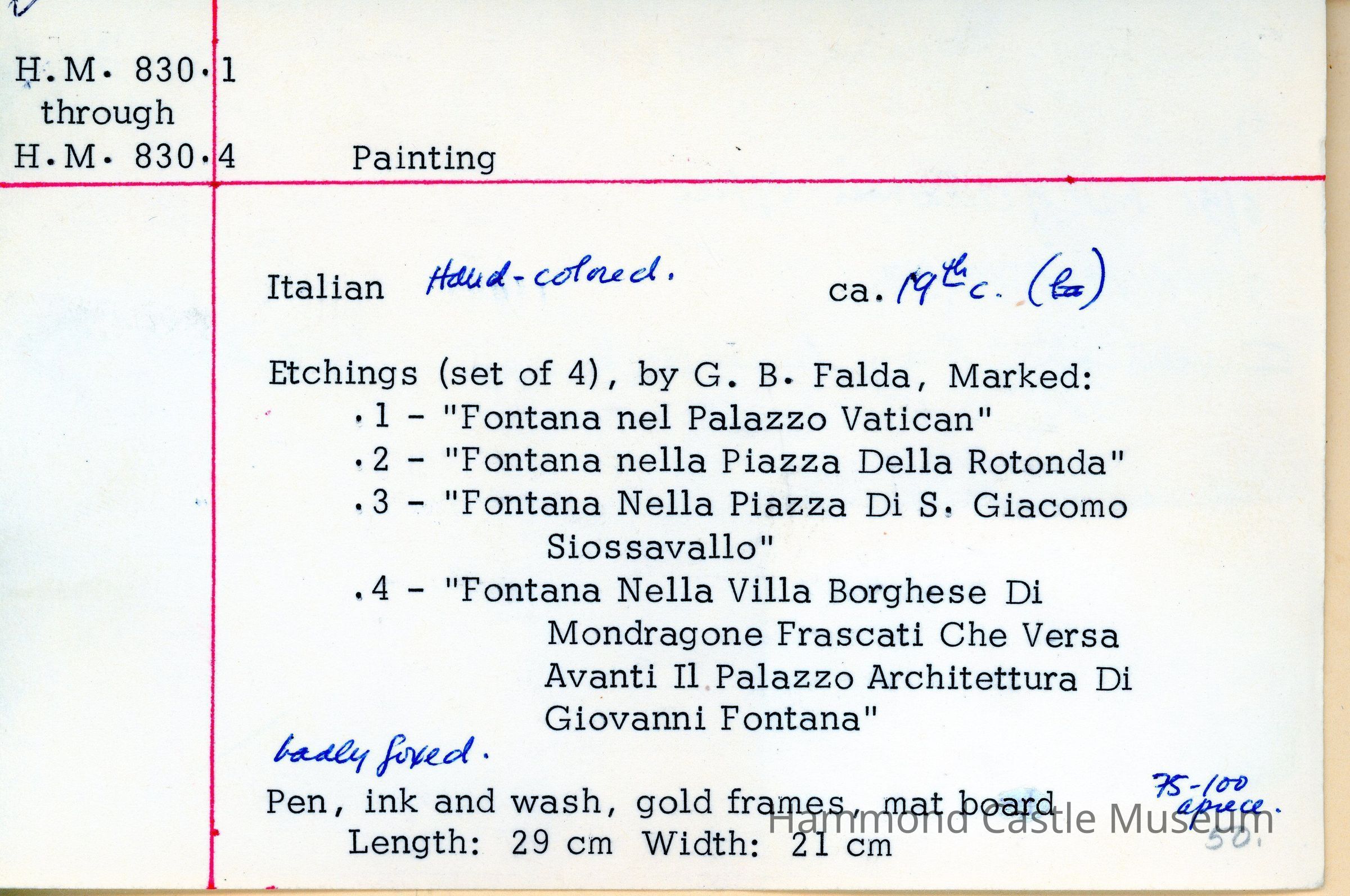 Set of 4 hand-colored etchings by G.B. Falda, marked: .1 -- "Fontana nel Palazzo Vatican" .2 -- "Fontana nella Piazza Della Rotonda" .3 -- "Fontana Nella Piazza Di S. Giacomo Siossavallo" ,4 -- "Fontana Nella Villa Borghese Di Mondragone Frascati Che Versa Avanti Il Palazzo Architettura Di Giovanni Fontana"