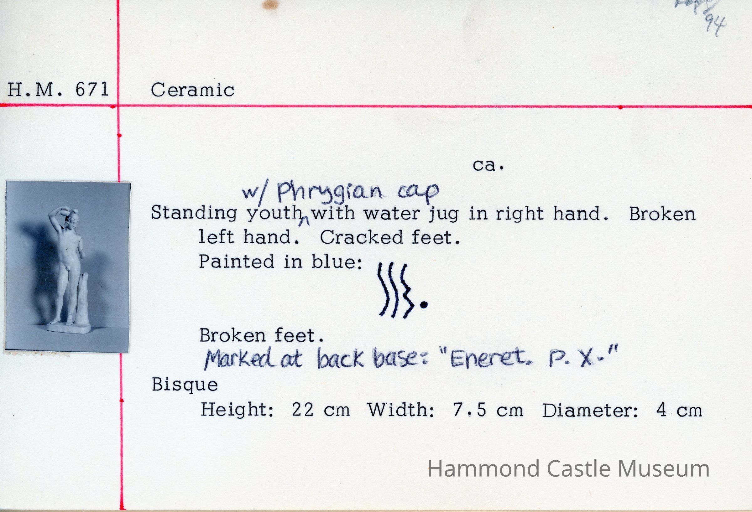 Bisque standing Ganymede - youth with Phrygian cap with water jug in right hand. Broken left hand. Broken/cracked feet.