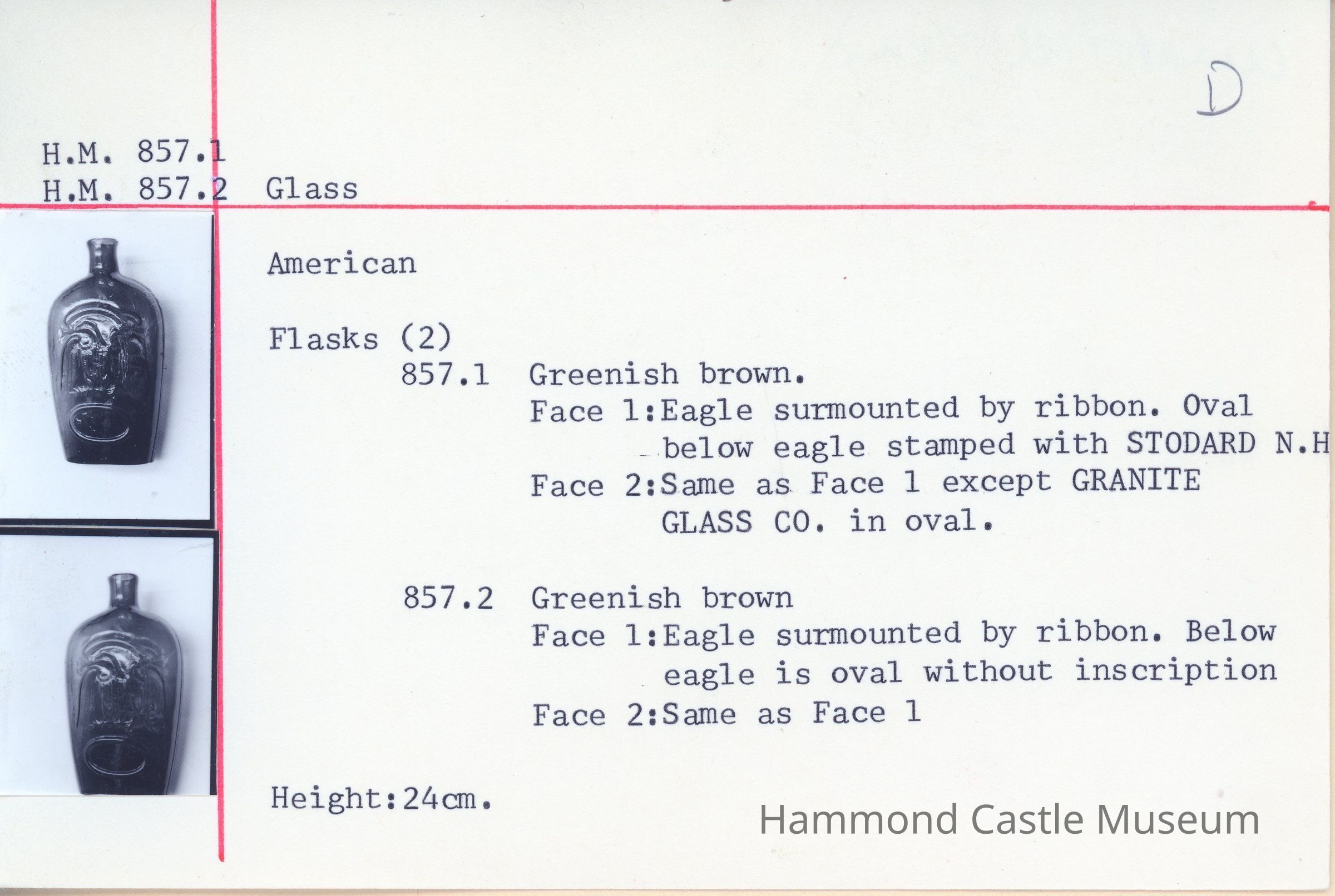 Greenshh brown glass flasks .1 eagle & Stodard NH, Granite State .2 eagle DEACCESSION 6-28-1991