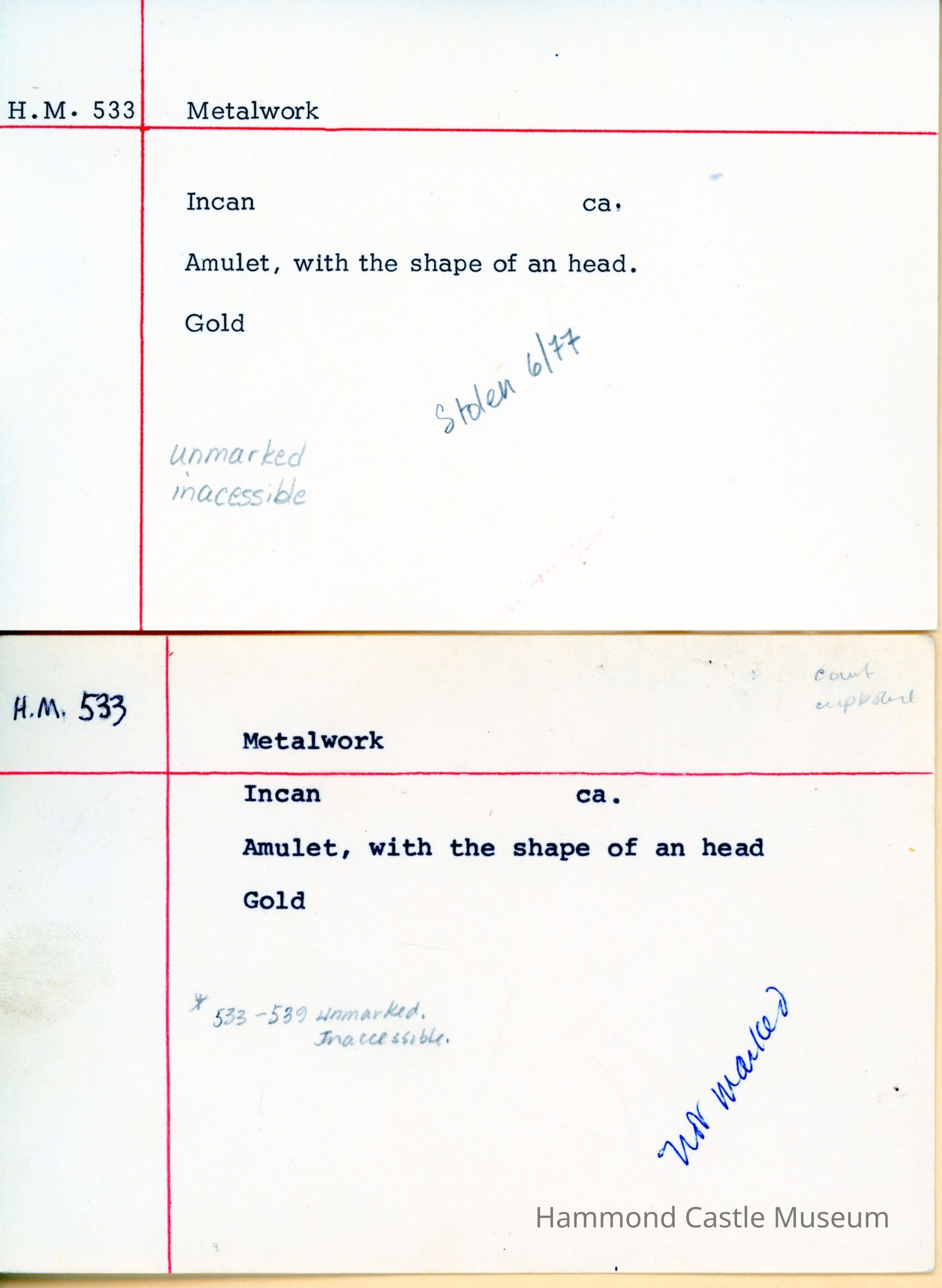 1977-07-28 S Forward reported theft of amulet HM533 from court cupboard HM74Note Type