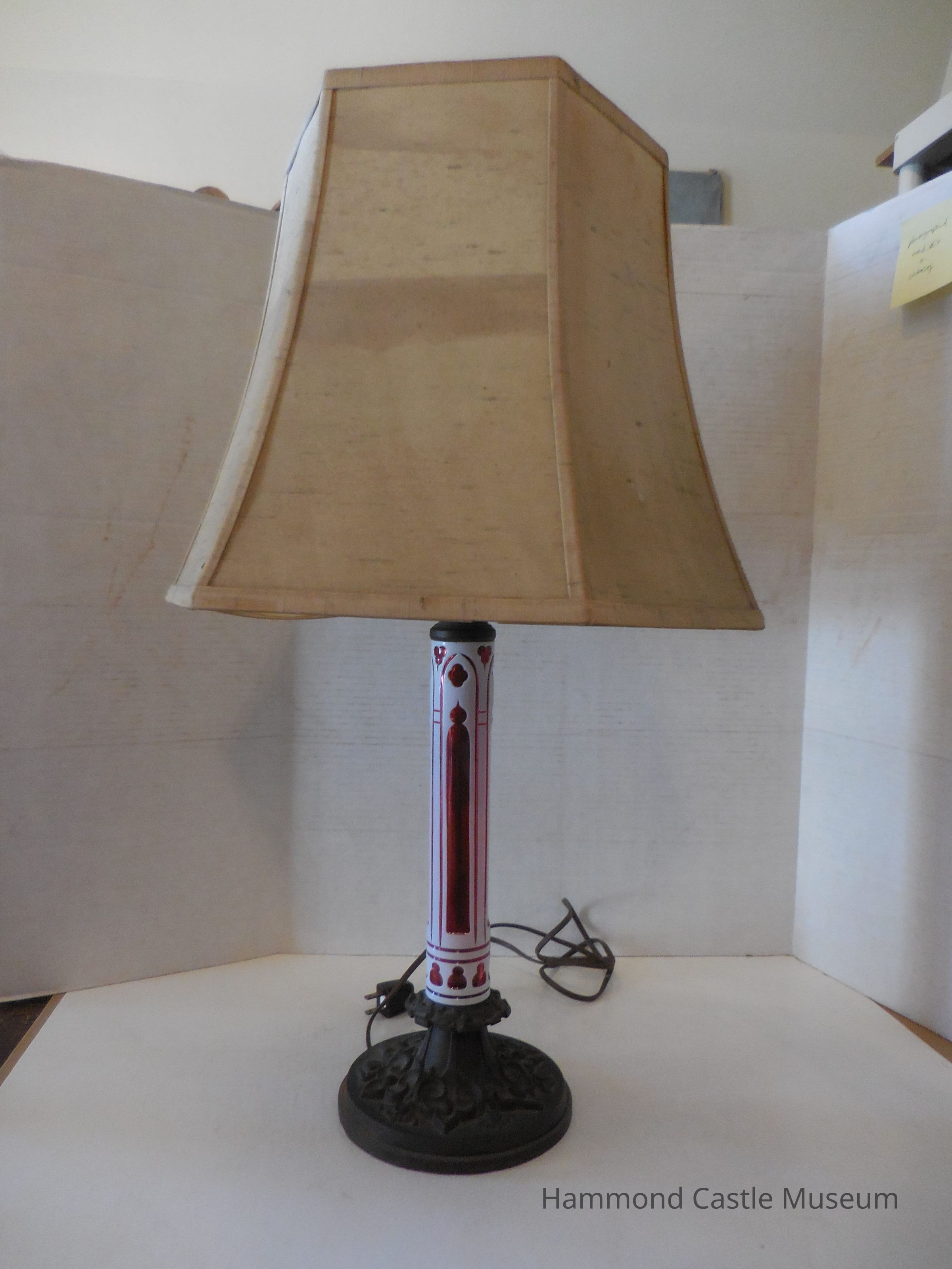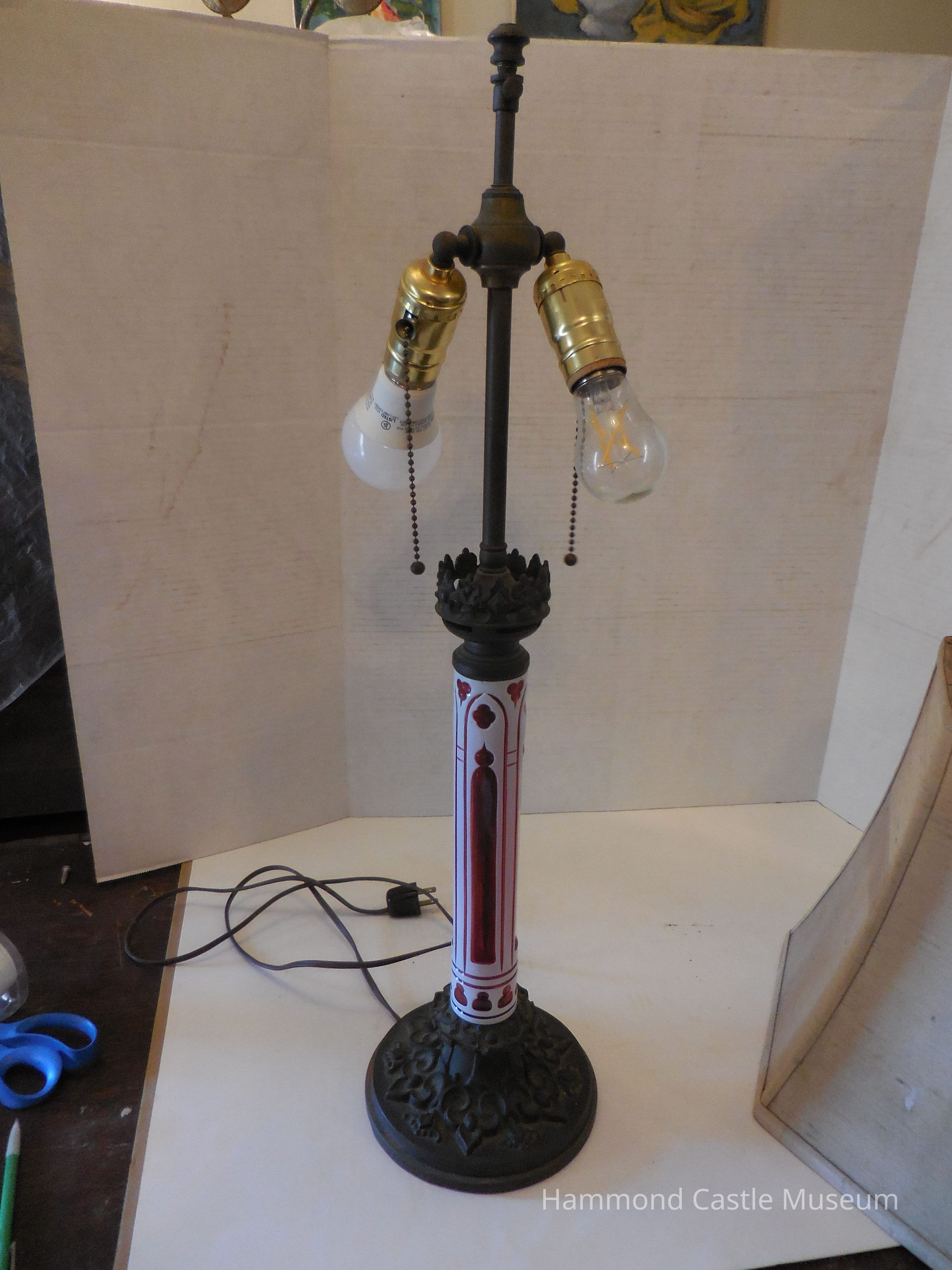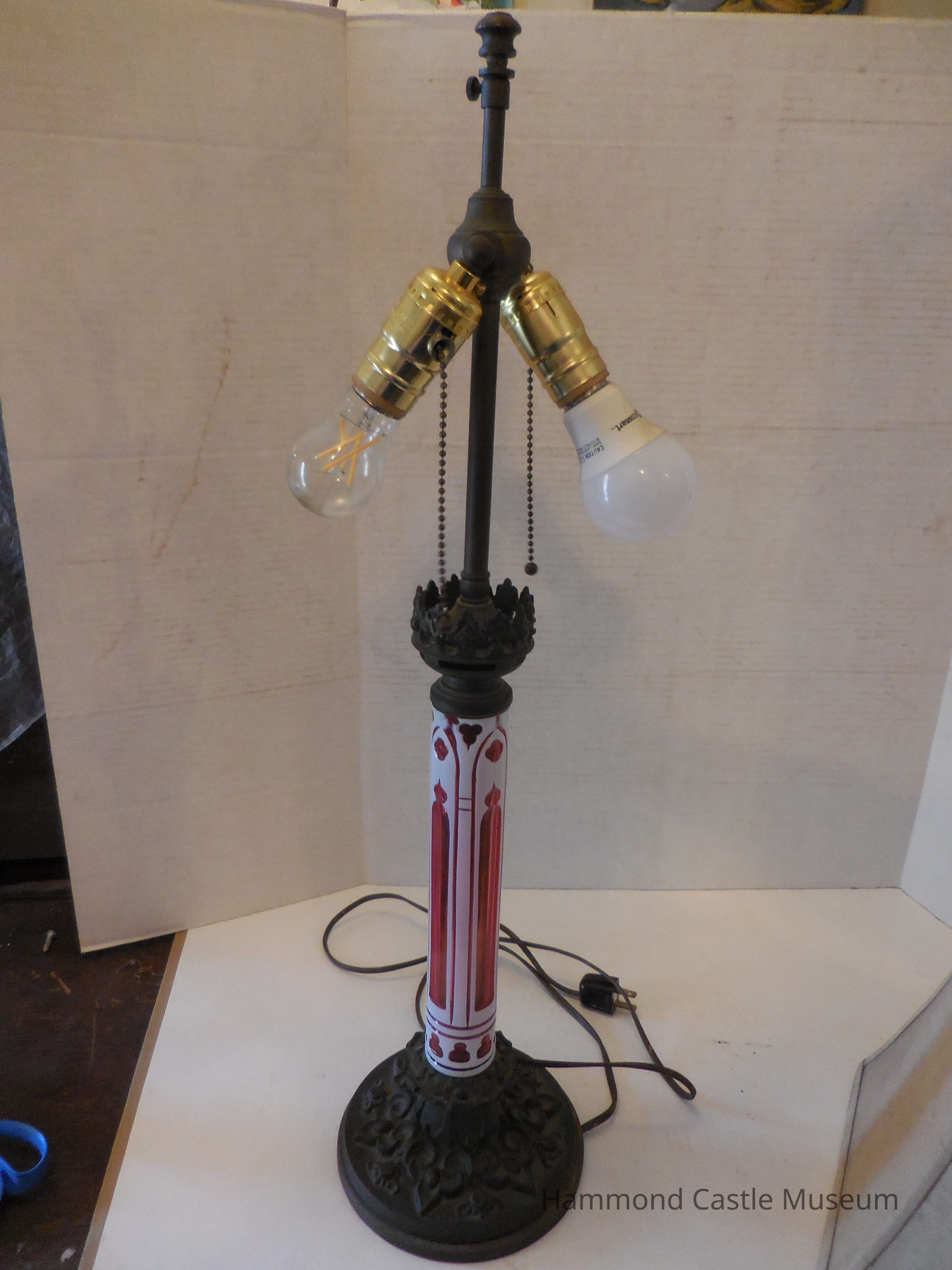 A modern lamp with gothic-style decorations. The middle stem is red and white glass designed in the form of gothic tracery window style. The base and top are made of metal and have more gothic designs that are mimicked on both the base and top. Space for two light bulbs with hanging pull chains.