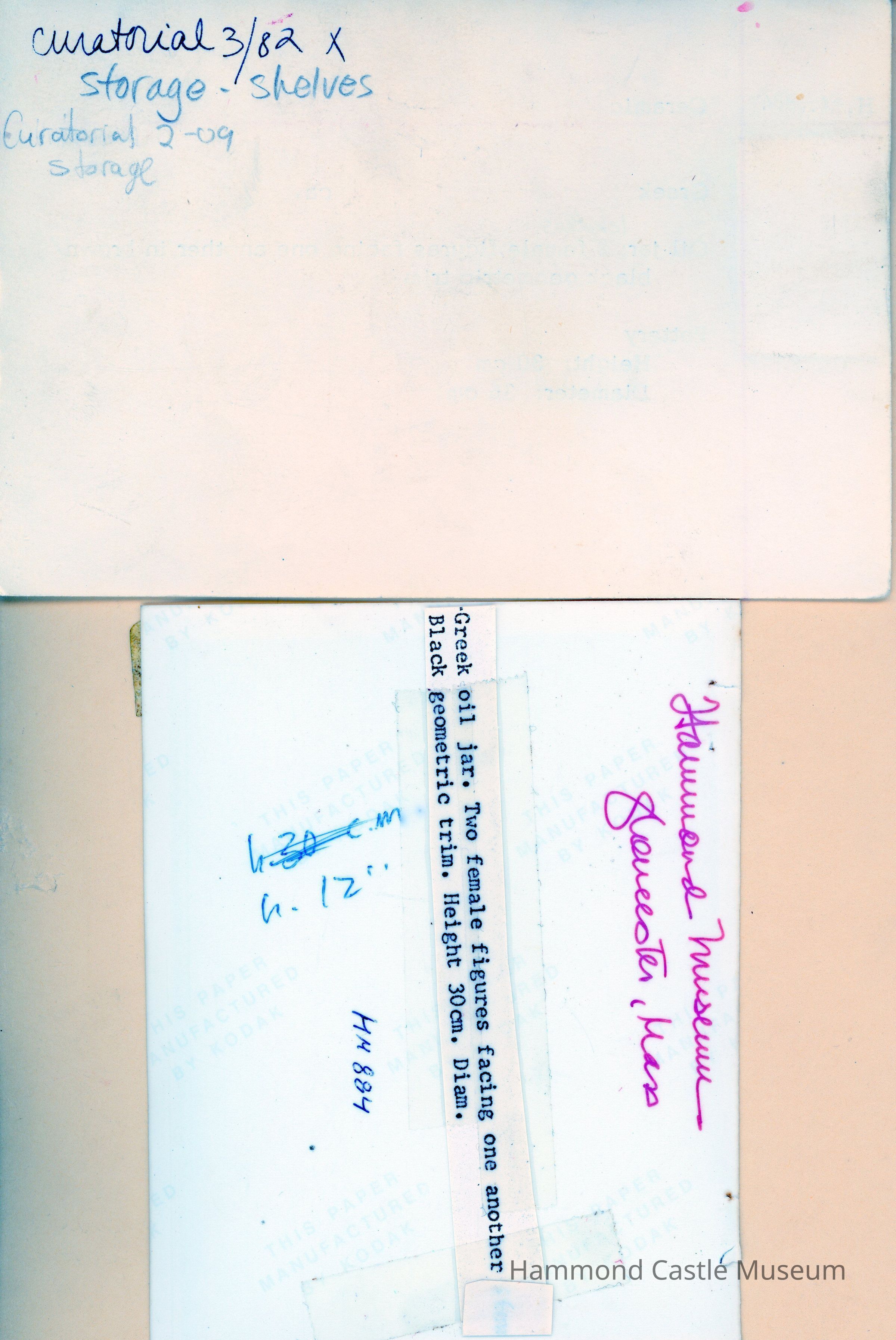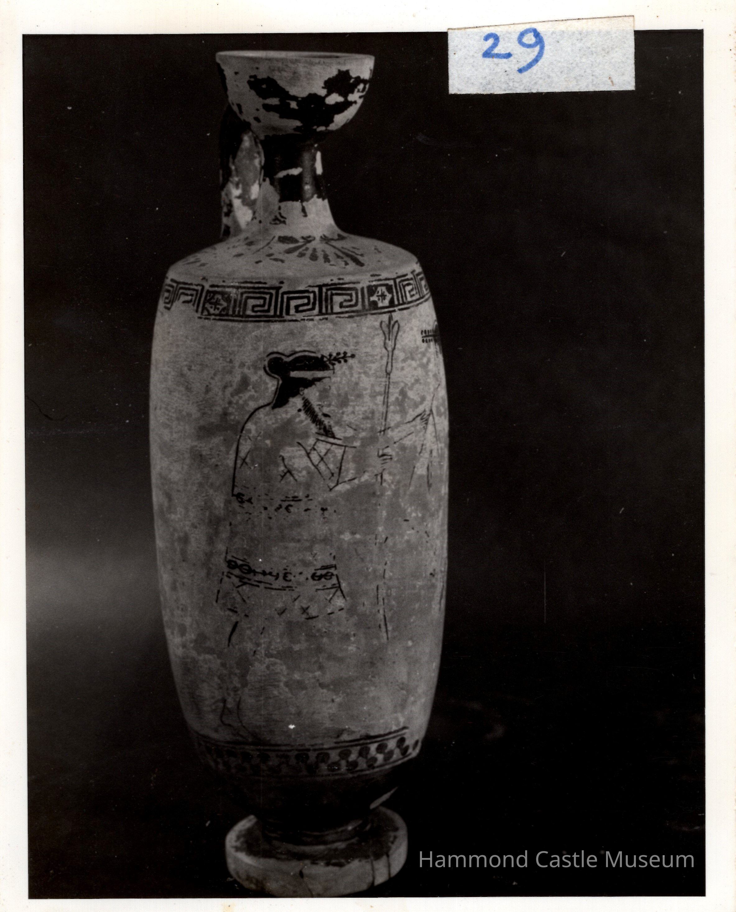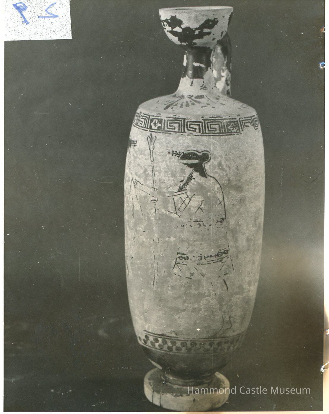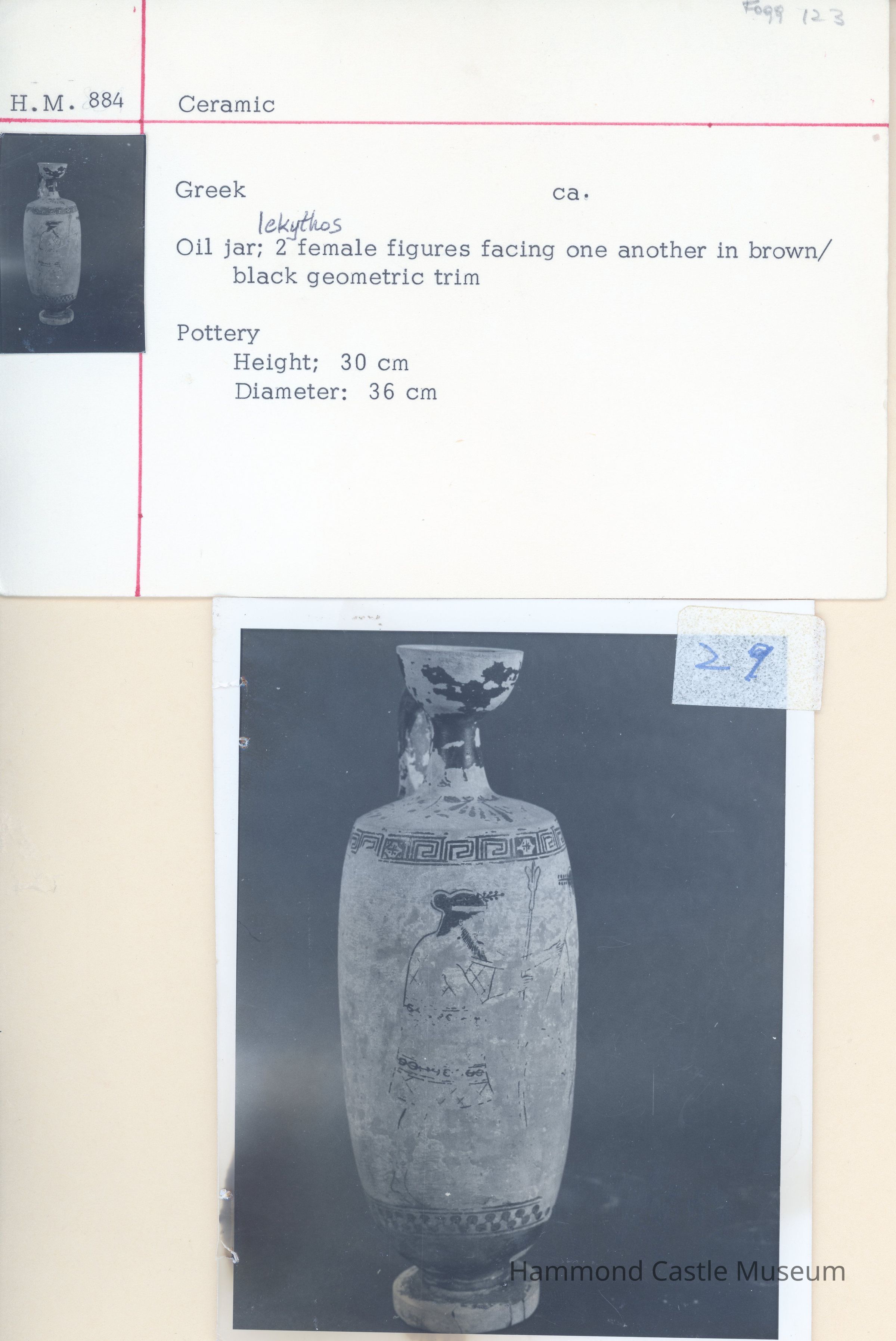 Greek Oil Jar (Lekythos) w 2 female figures facing each other in brown/black geometric trim.