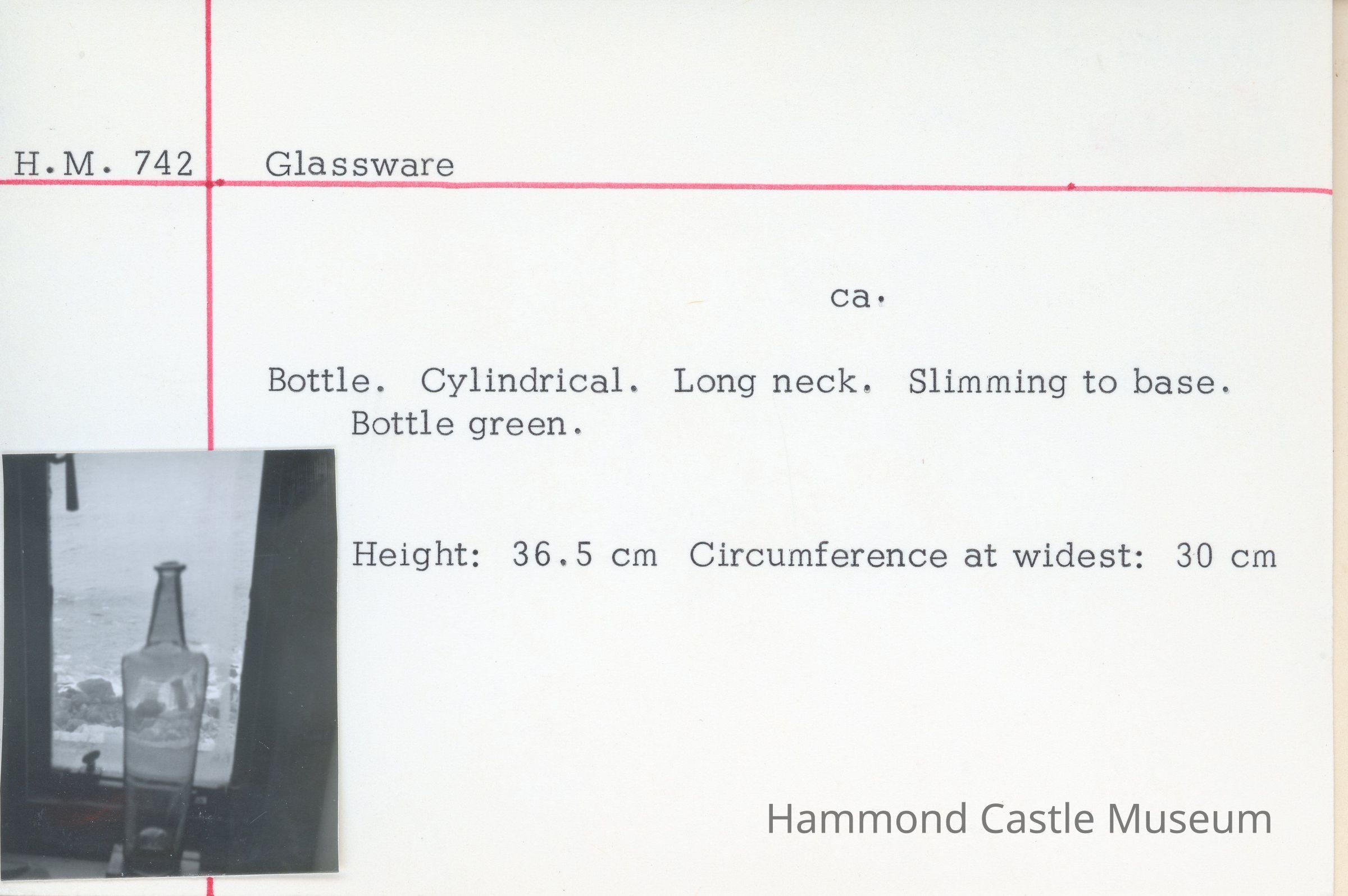 Cylindrical bottle. Long neck. Slimming to base. Bottle green.