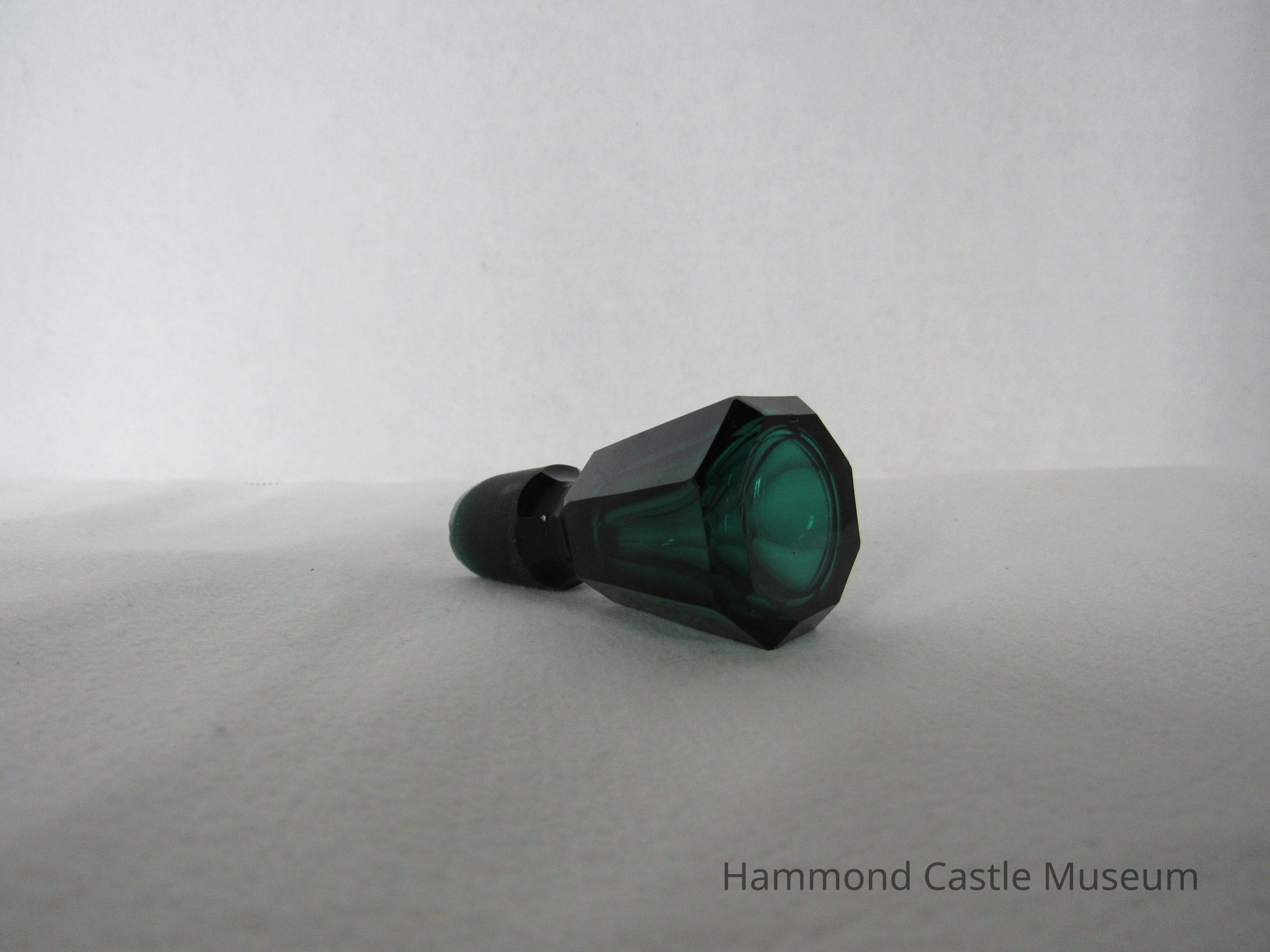 Green decanter with smooth sides. Stopple is octagonal. Has chipped lip.