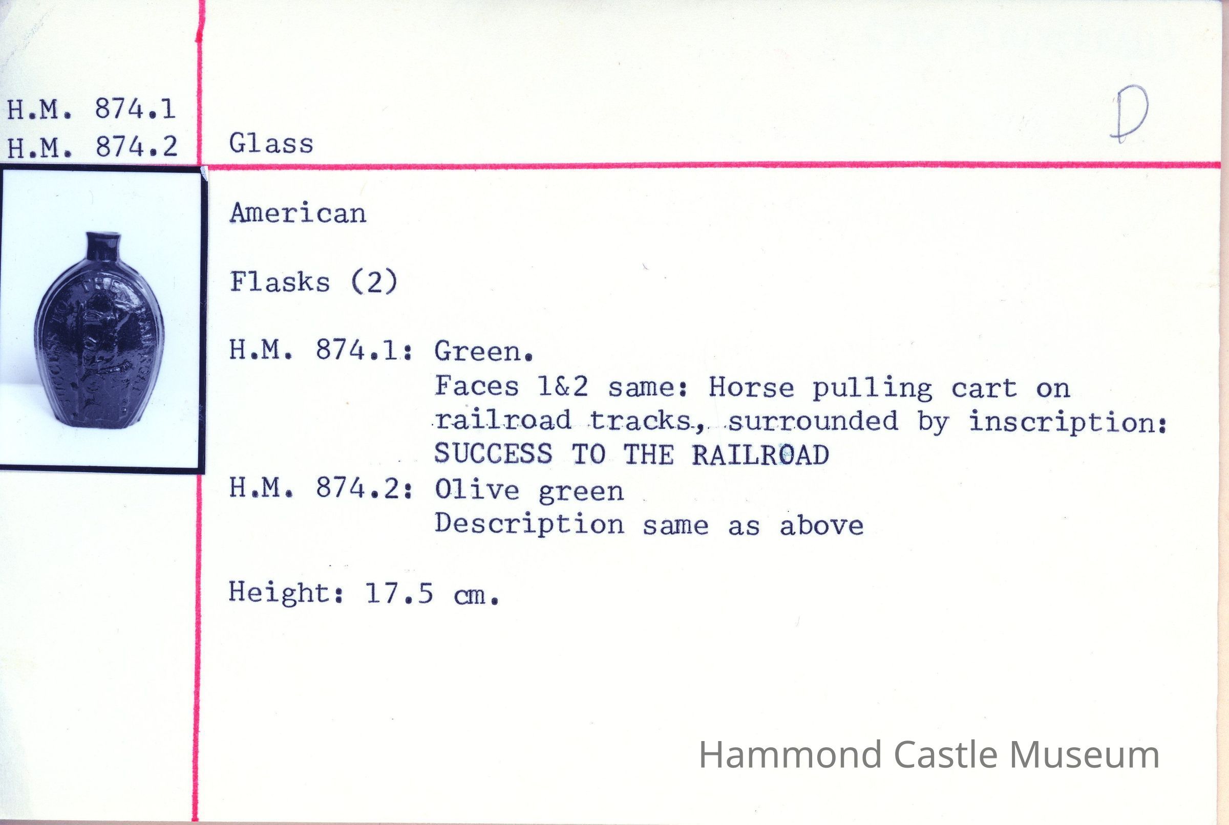 Green glass flask bottle stamped "Success to the Railroad" DEACCESSIONED 6-28-1991