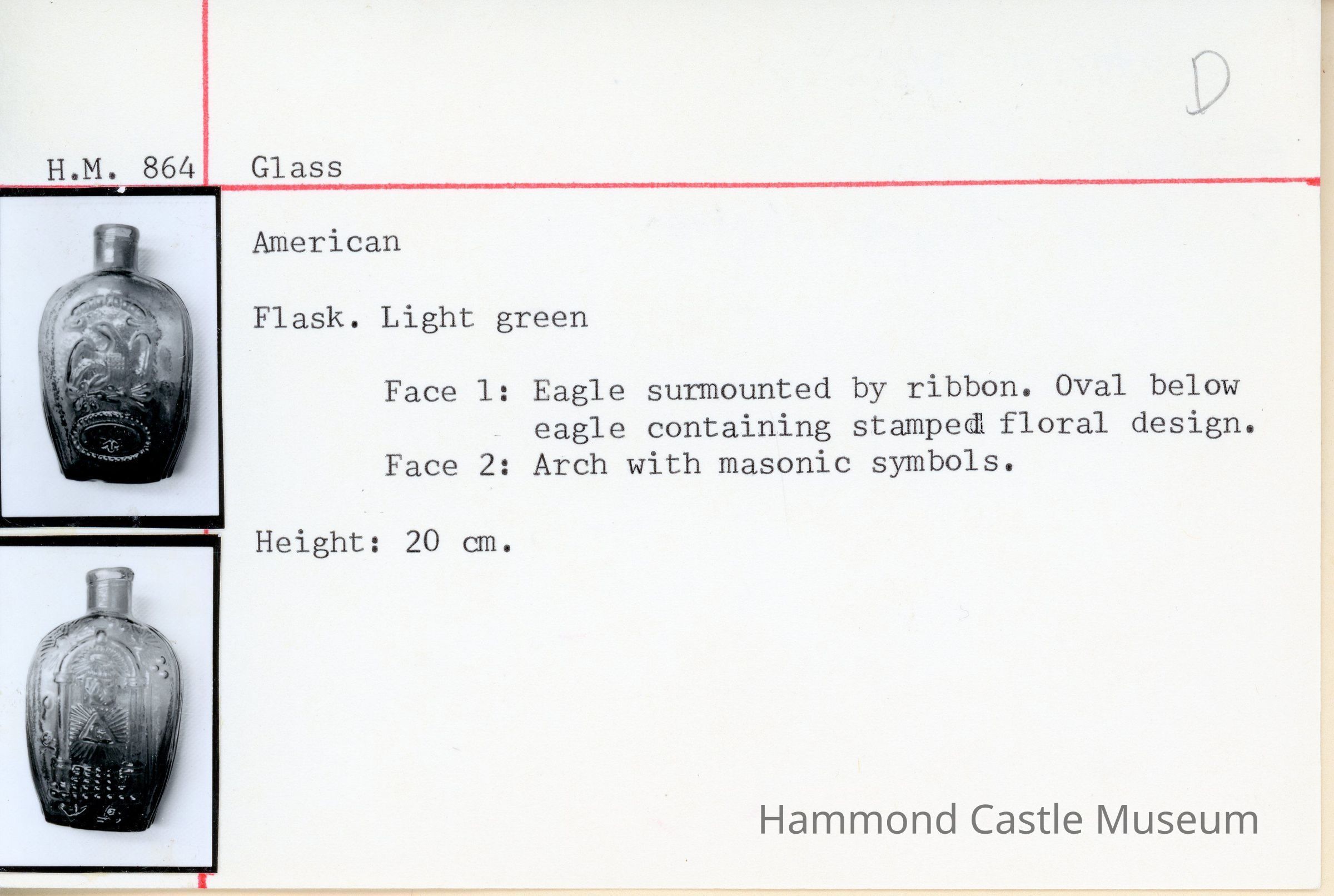 Green glass flask bottle w eagle & Masonic symbols DEACCESSIONED 6-28-1991