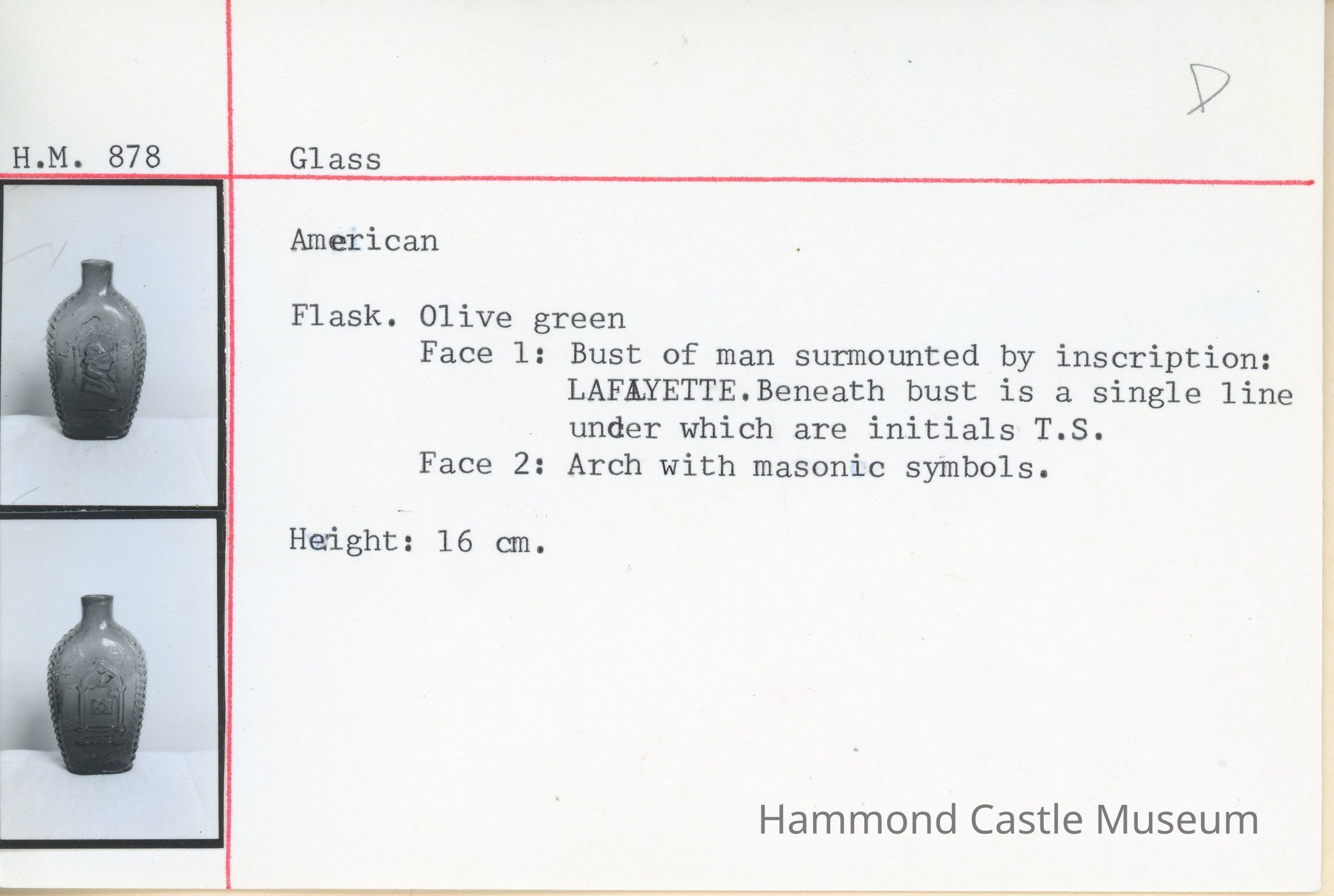green glass flask bottle w Lafayette DEACCESSIONED 6-28-1991