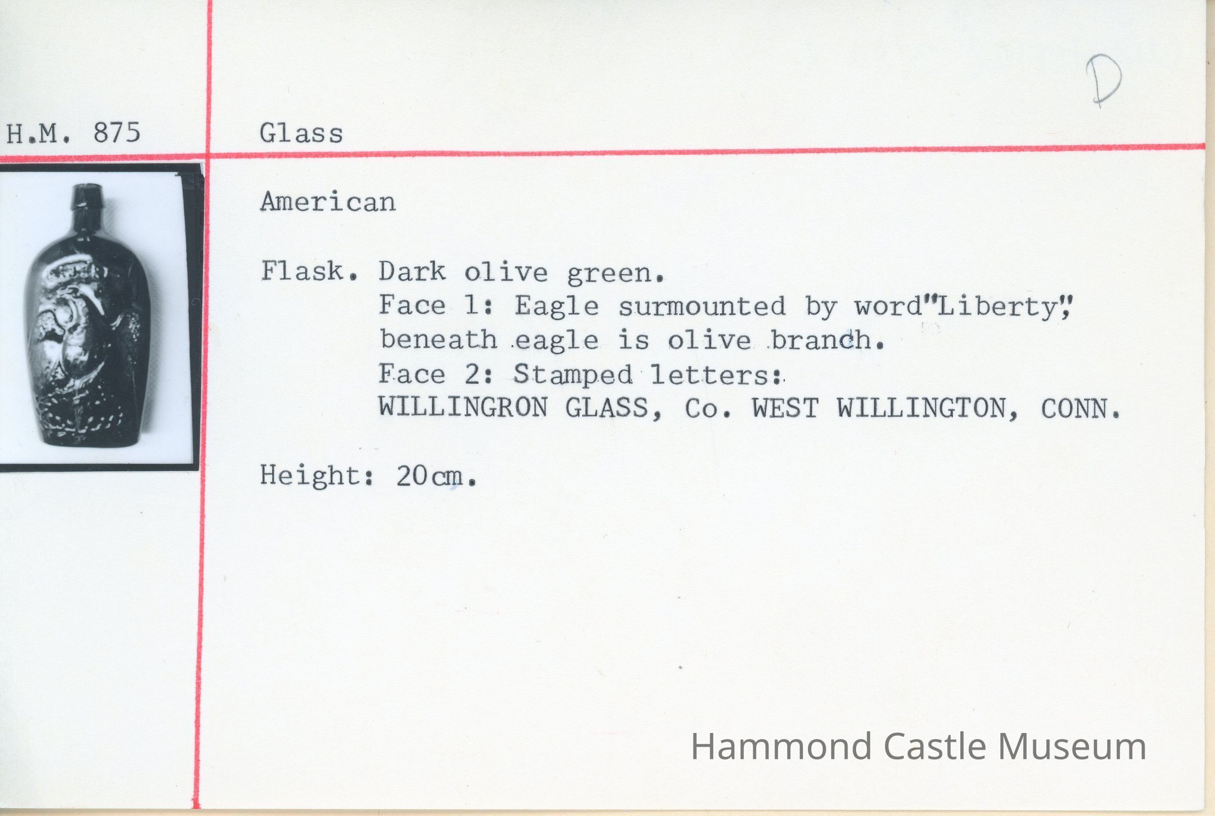 Green glass flask bottle w Liberty eagle & Willington Glass Co stamped DEACCESSIONED 6-28-1991
