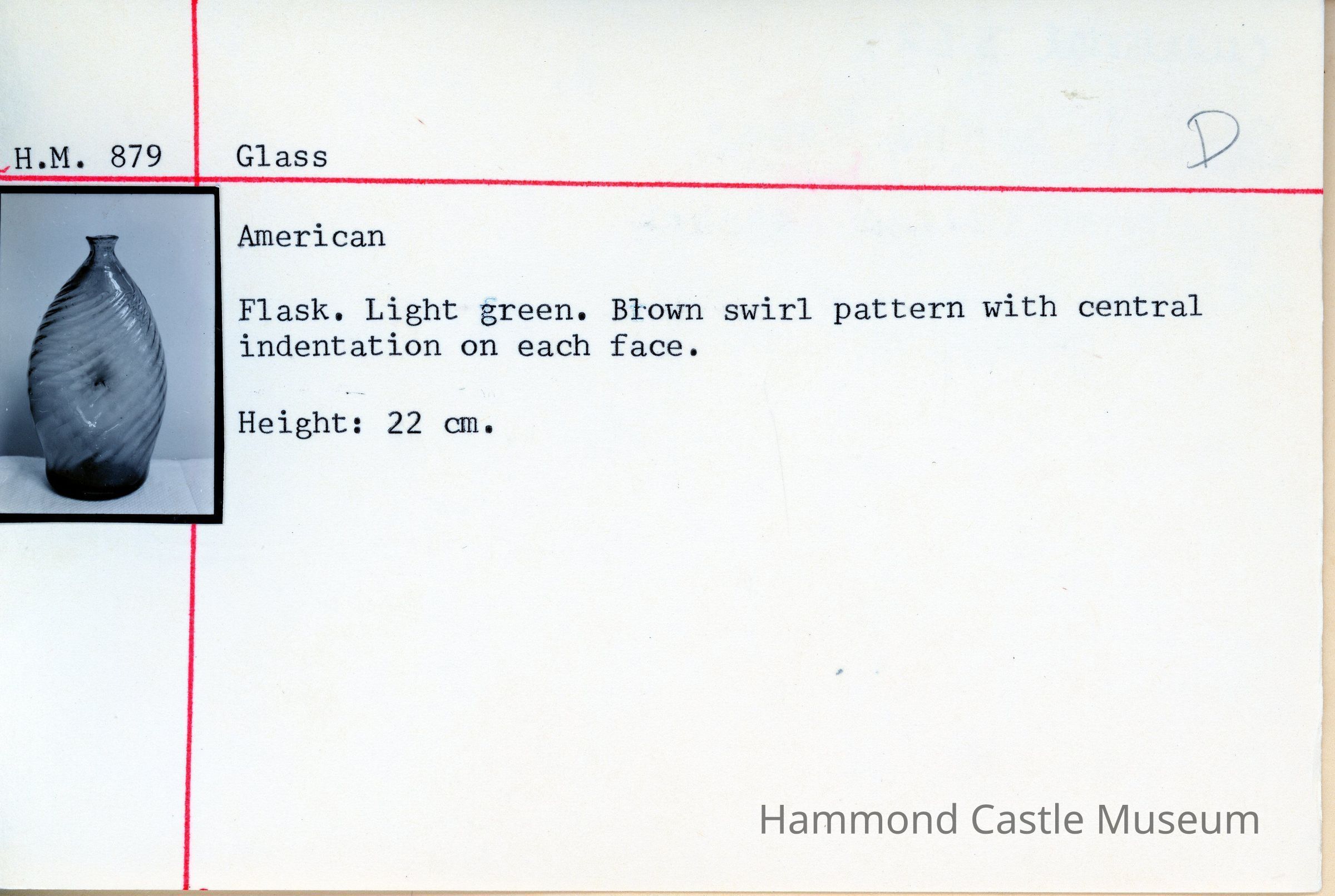 green glass flask bottle w swirls DEACCESSIONED 6-28-1991