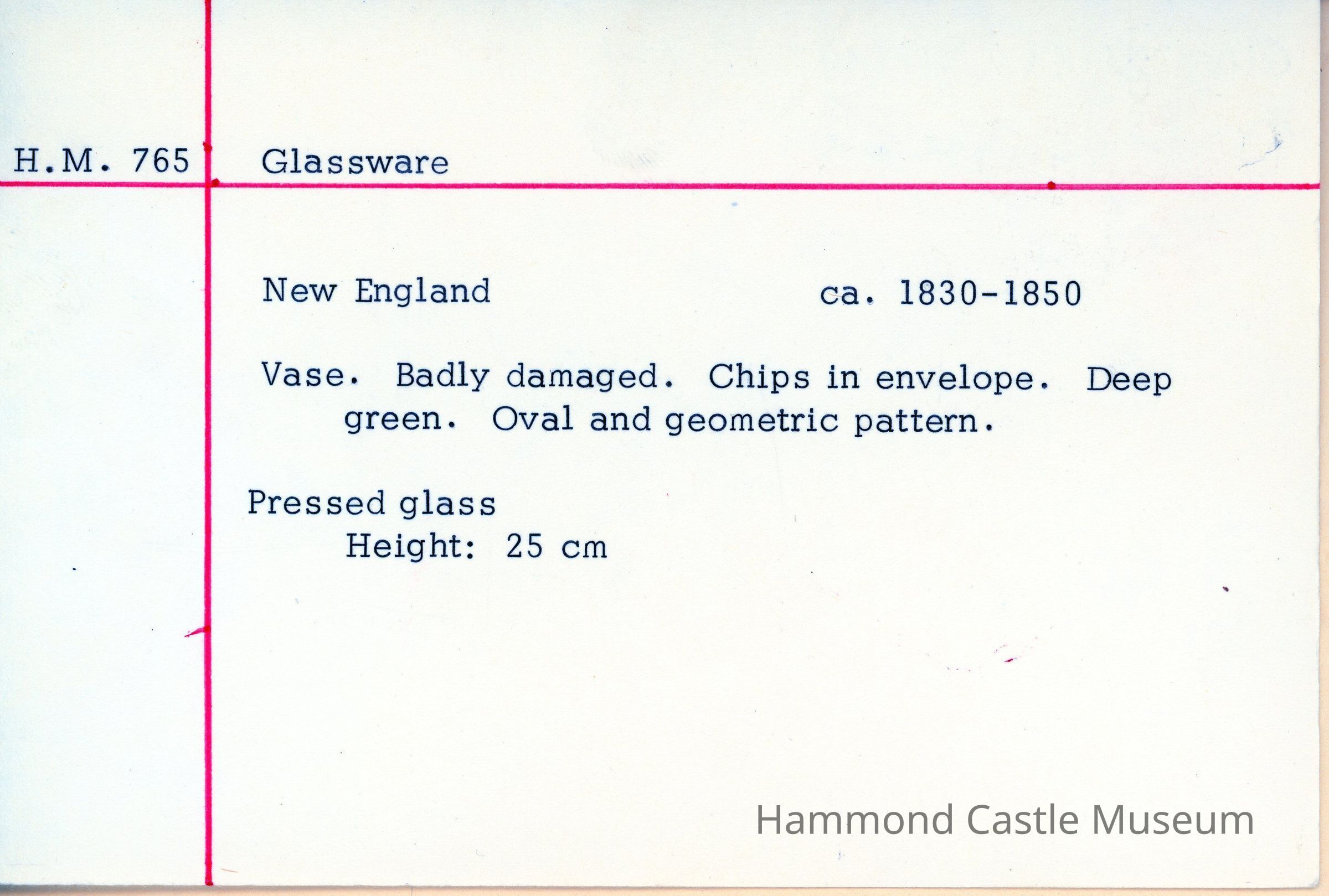Vase. Badly damaged. Chips in envelope. Deep green. Oval and geometric pattern. Pressed glass.