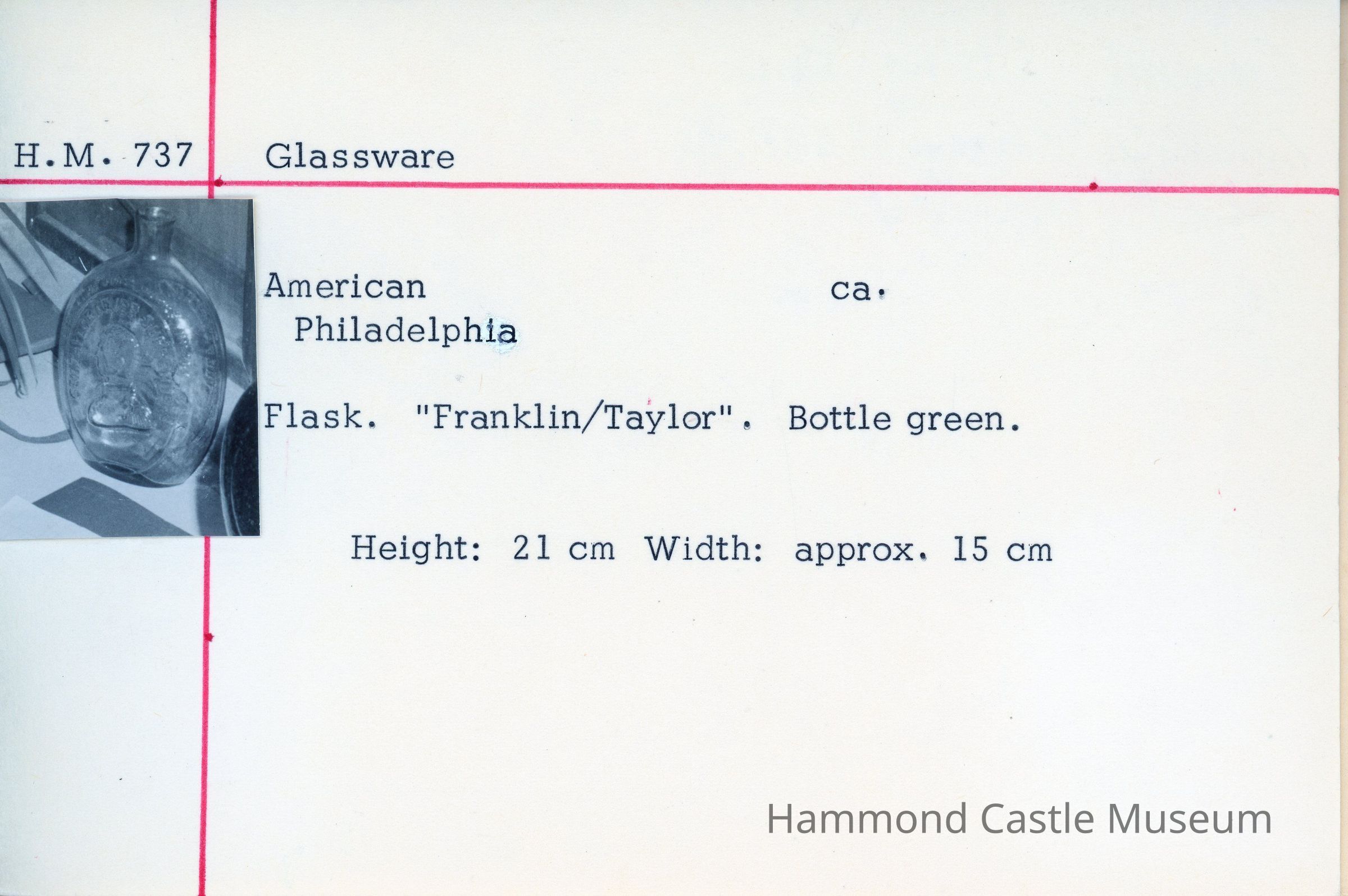 green pressed glass flask w Franklin & Taylor profiles H: 21cm W: 15cm Deaccessioned 1991 for Sotherby auction