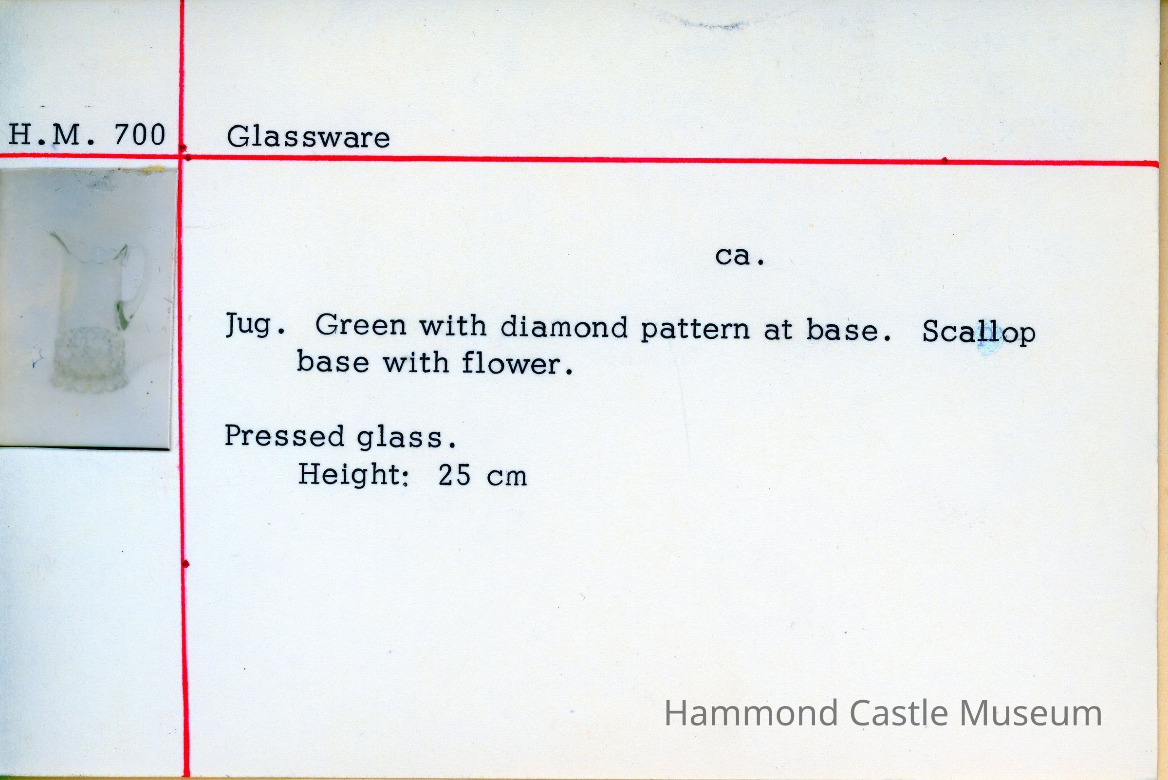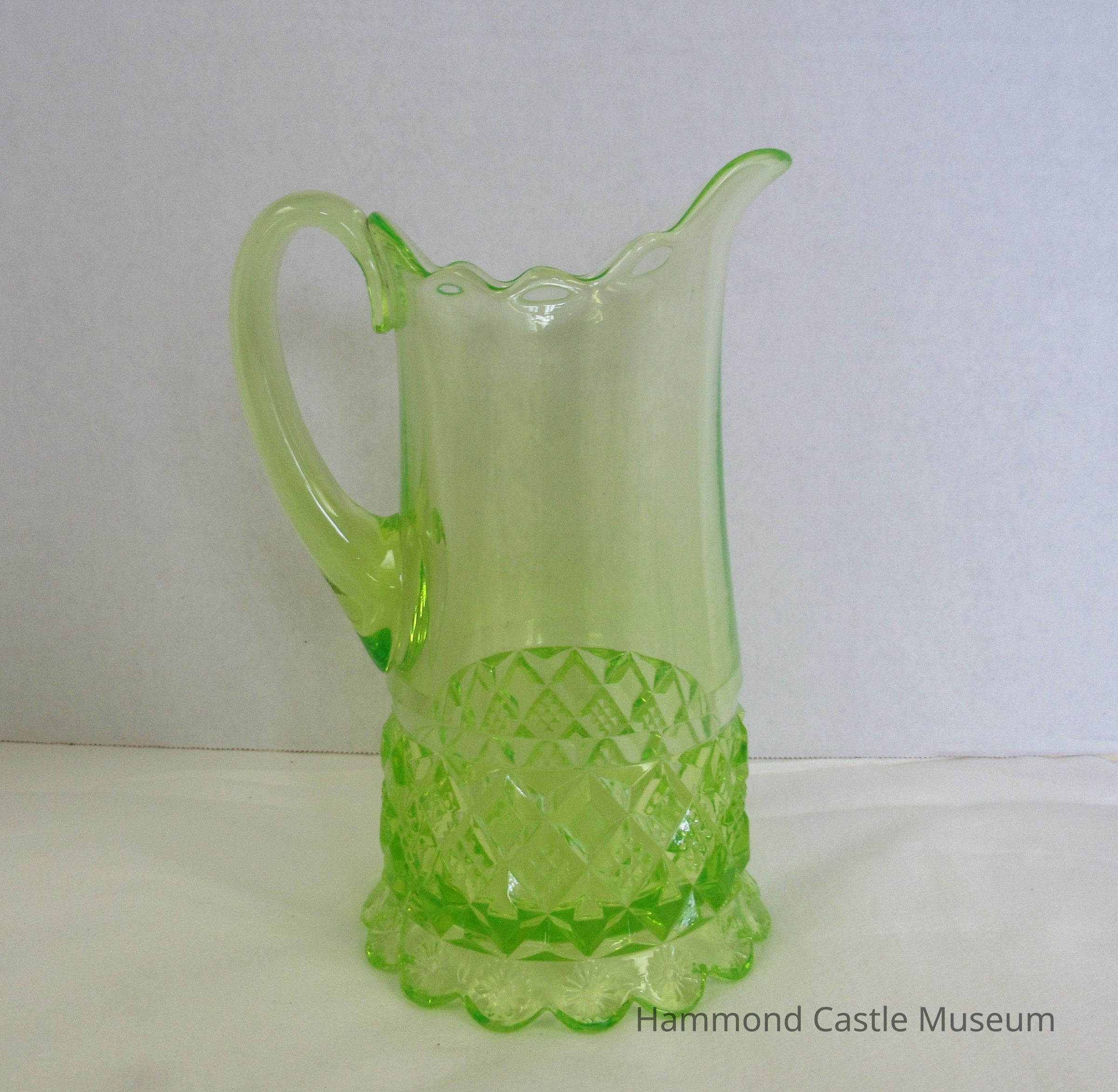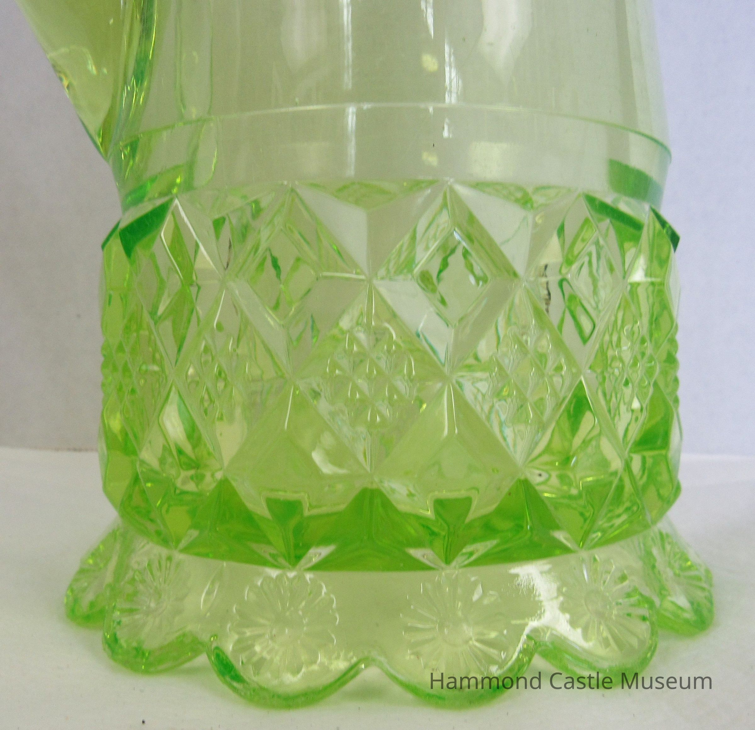 Pitcher made of green Uranium glass with a diamond pattern around the bottom. Scallop base with flower. Pressed glass.