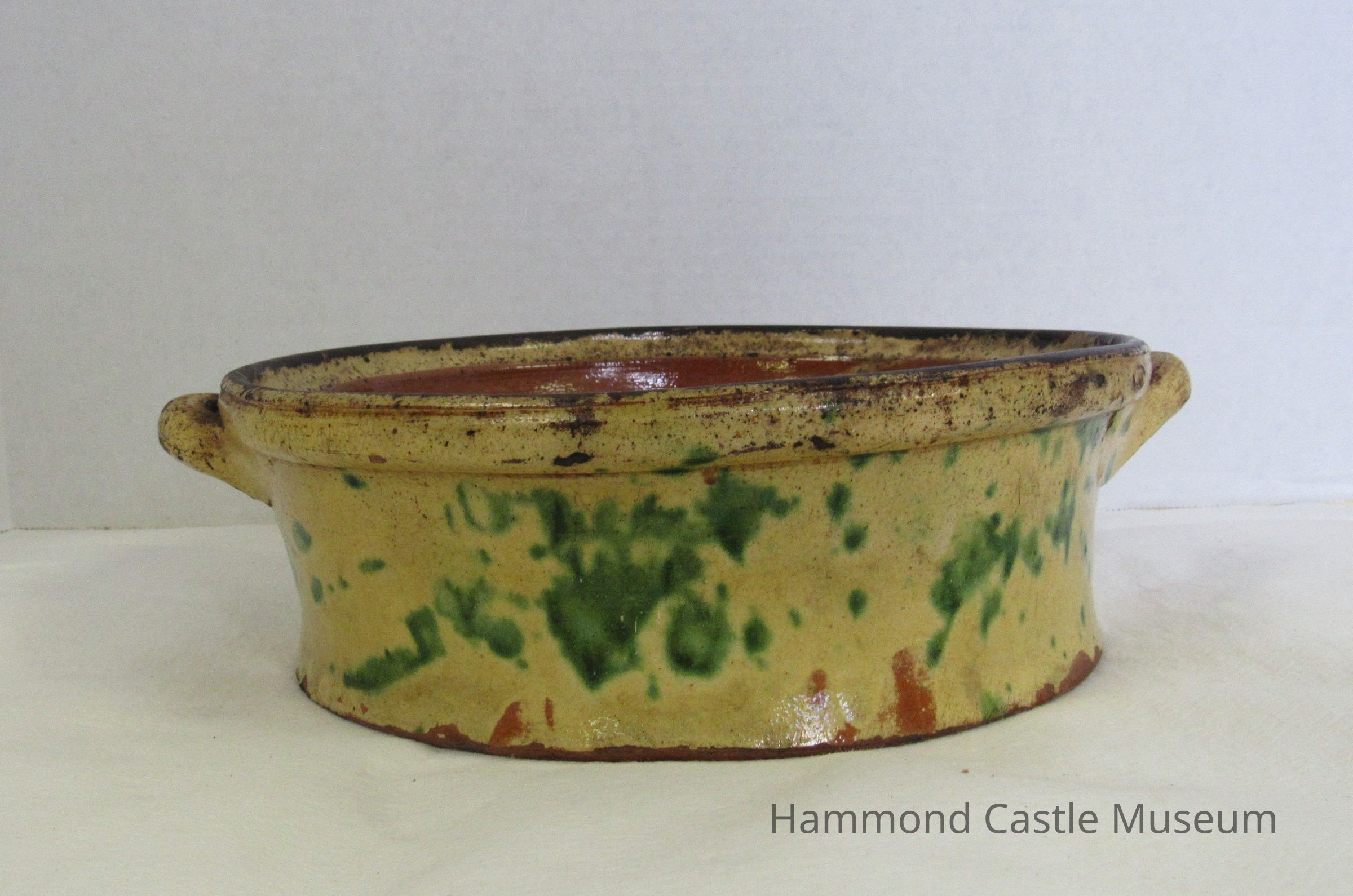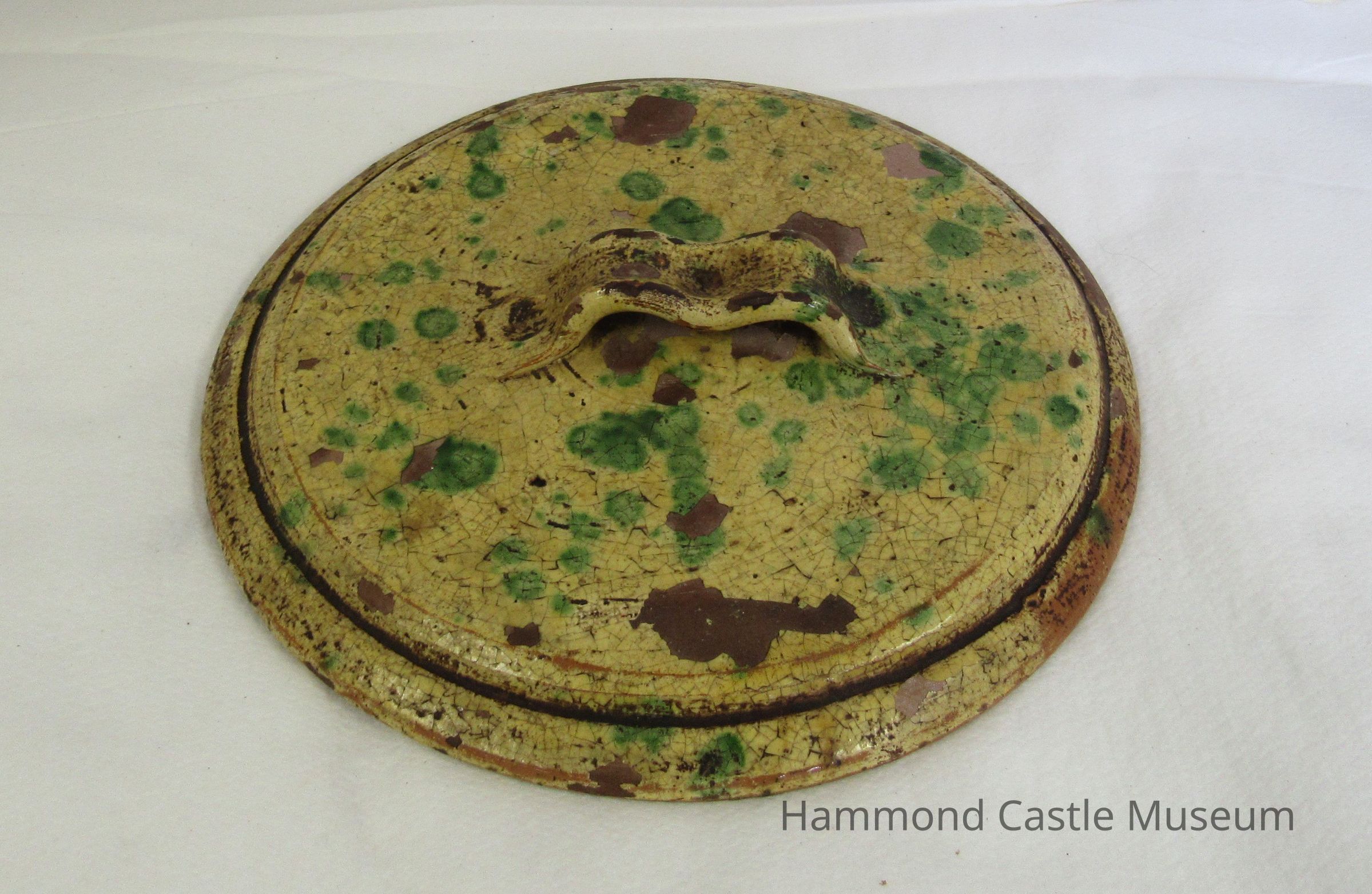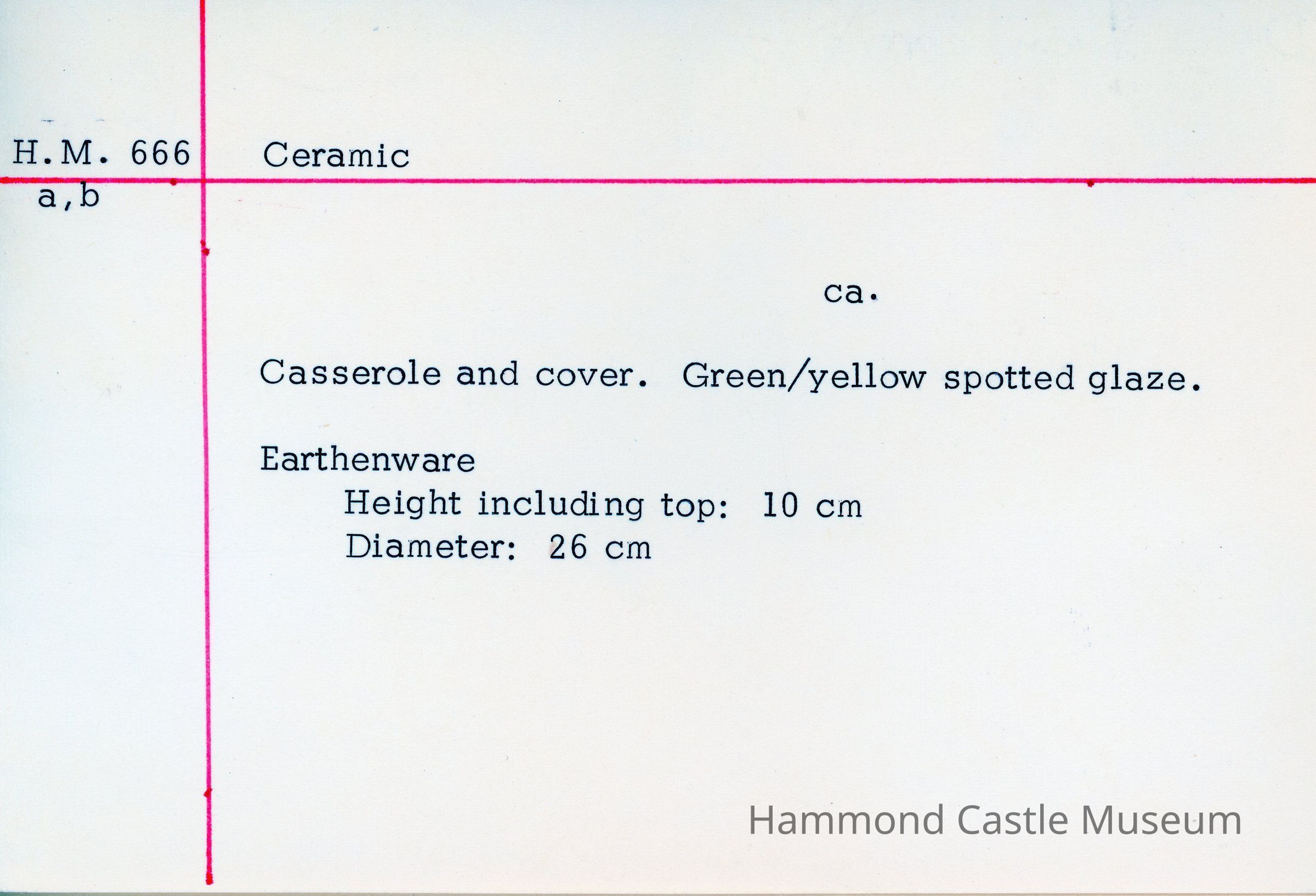 Pottery casserole dish and cover. Green/yellow spotted glaze. a - dish bottom b - cover