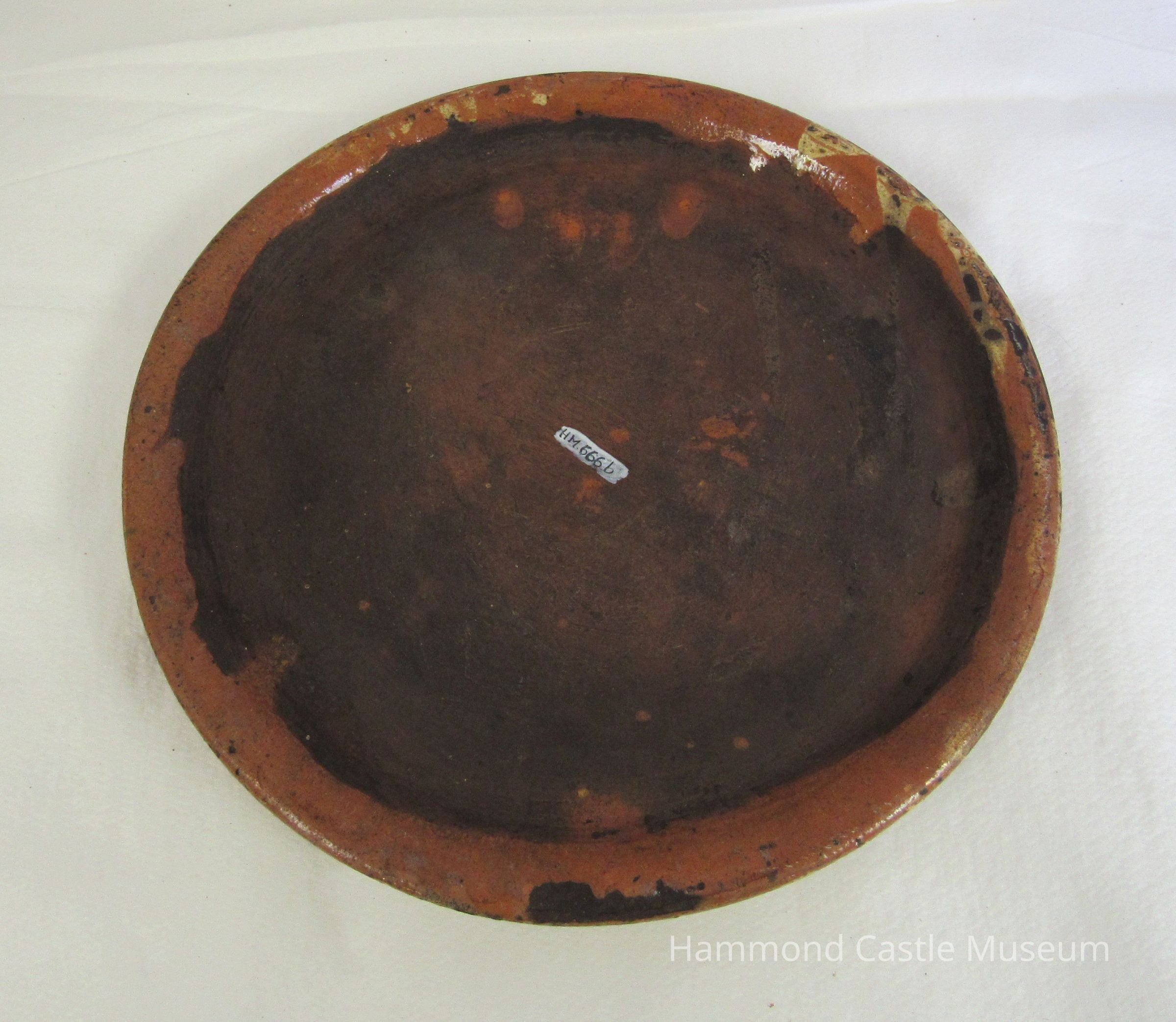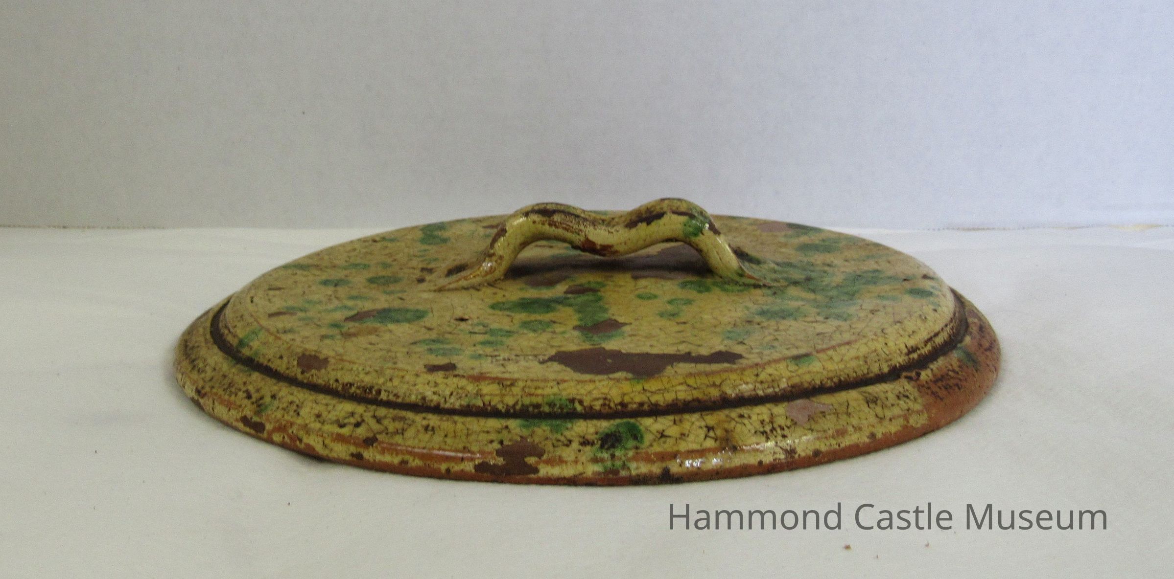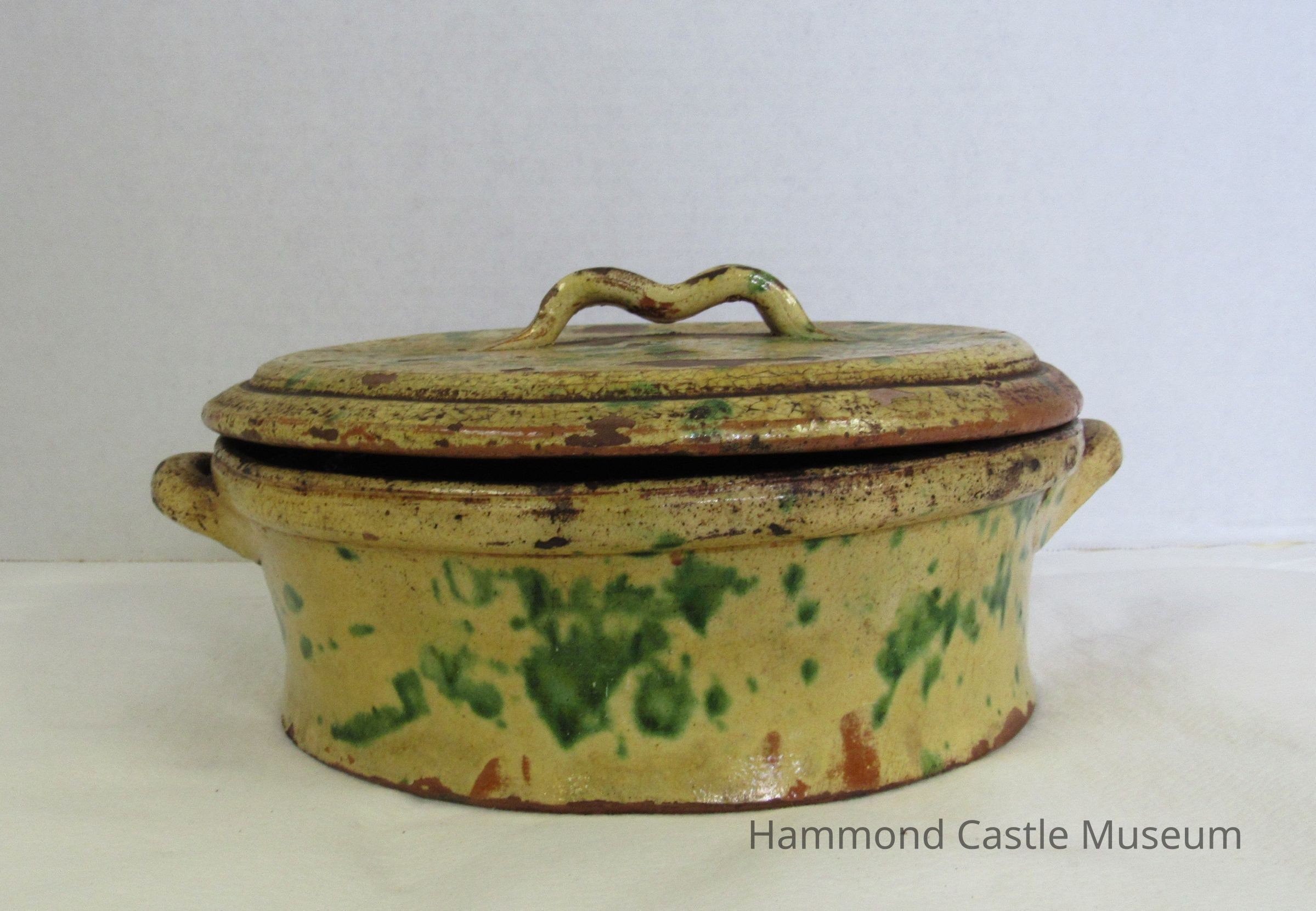 Pottery casserole dish and cover. Green/yellow spotted glaze. a - dish bottom b - cover