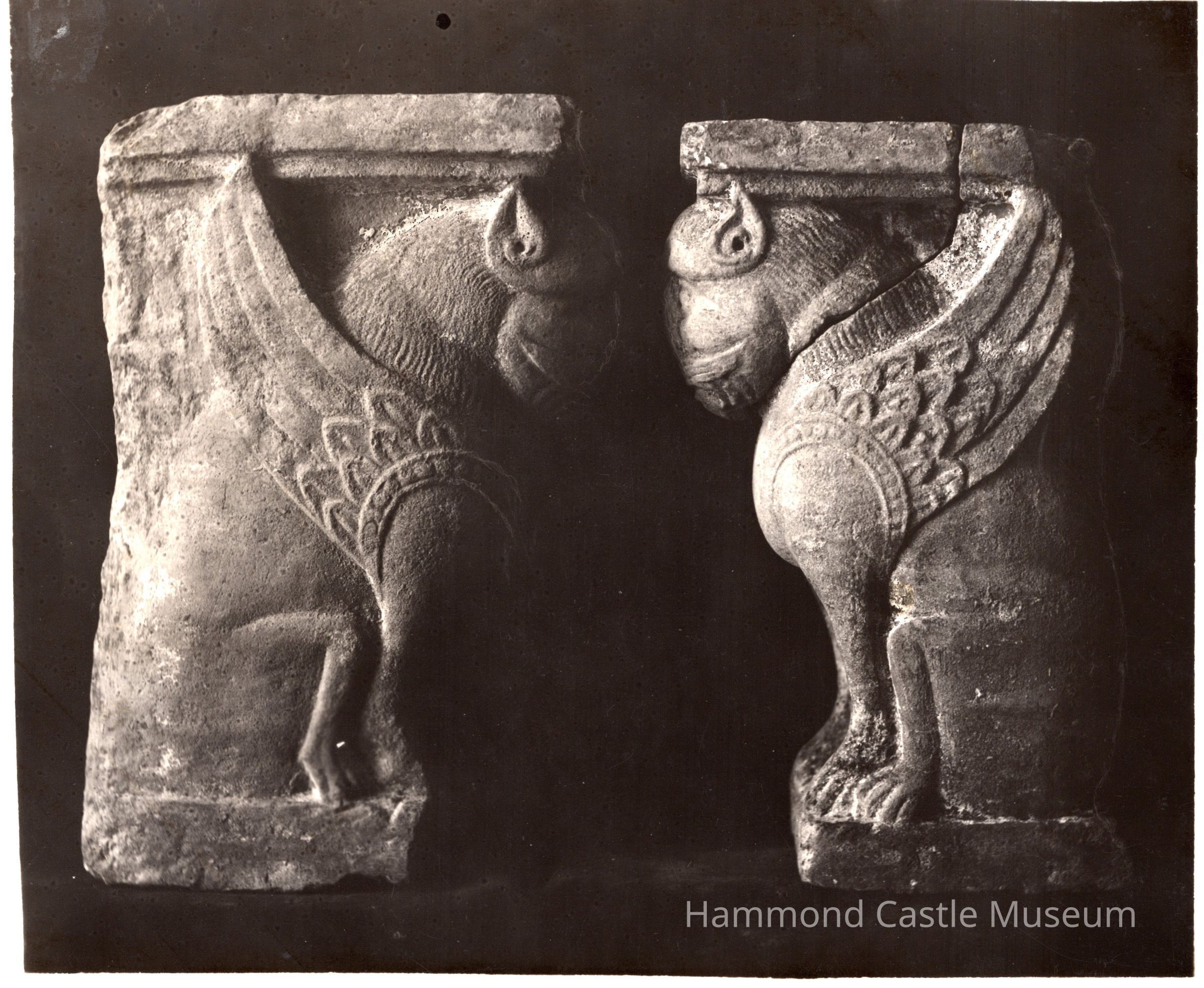 Set of 2 griffin-shaped corbels. Used to support bench on courtyard bridge