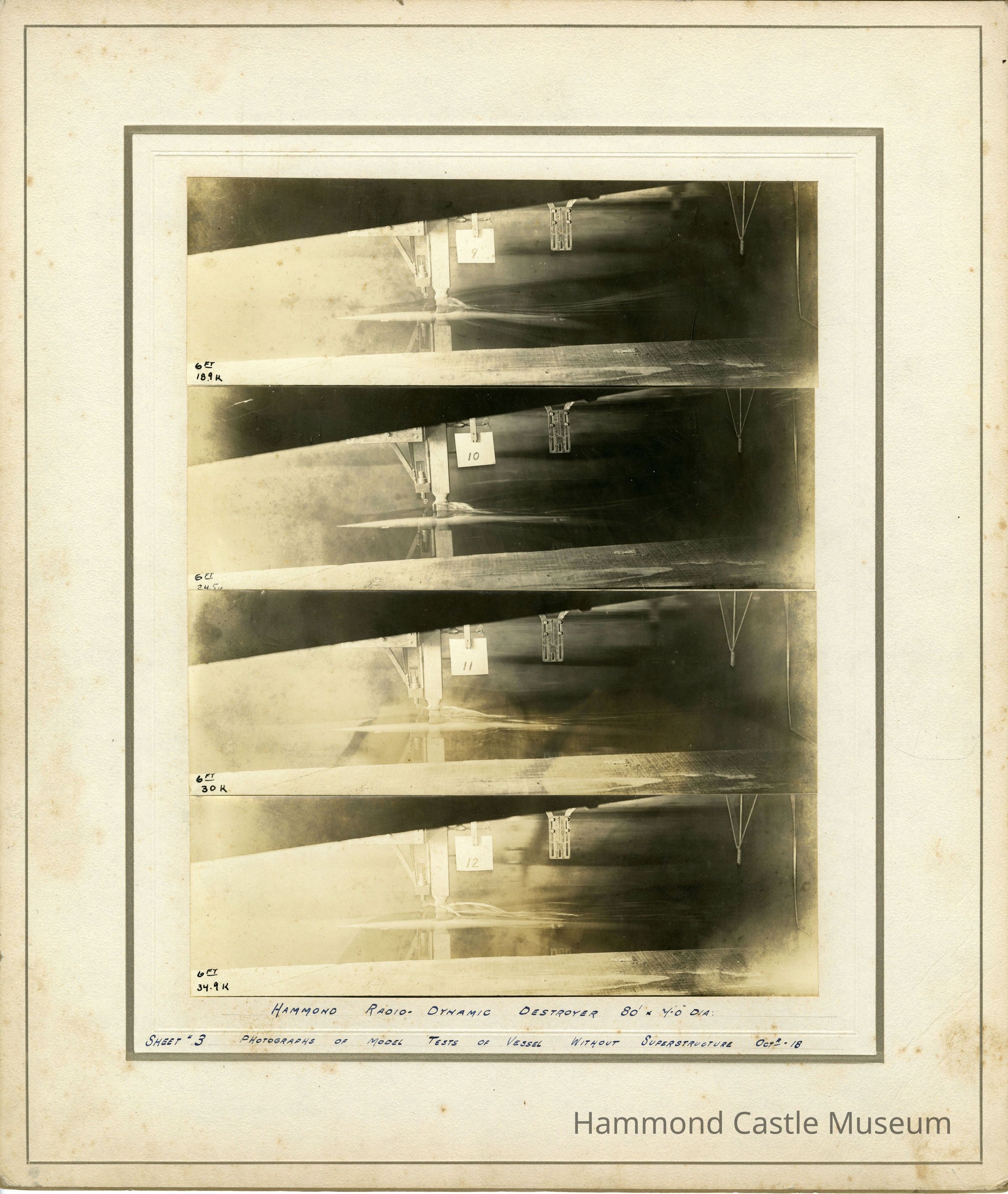 Photos & notes of Hammond Radio-Dynamic Destroyer Sheet #3 Model Tests of Vessel without Superstructure, Oct 1918