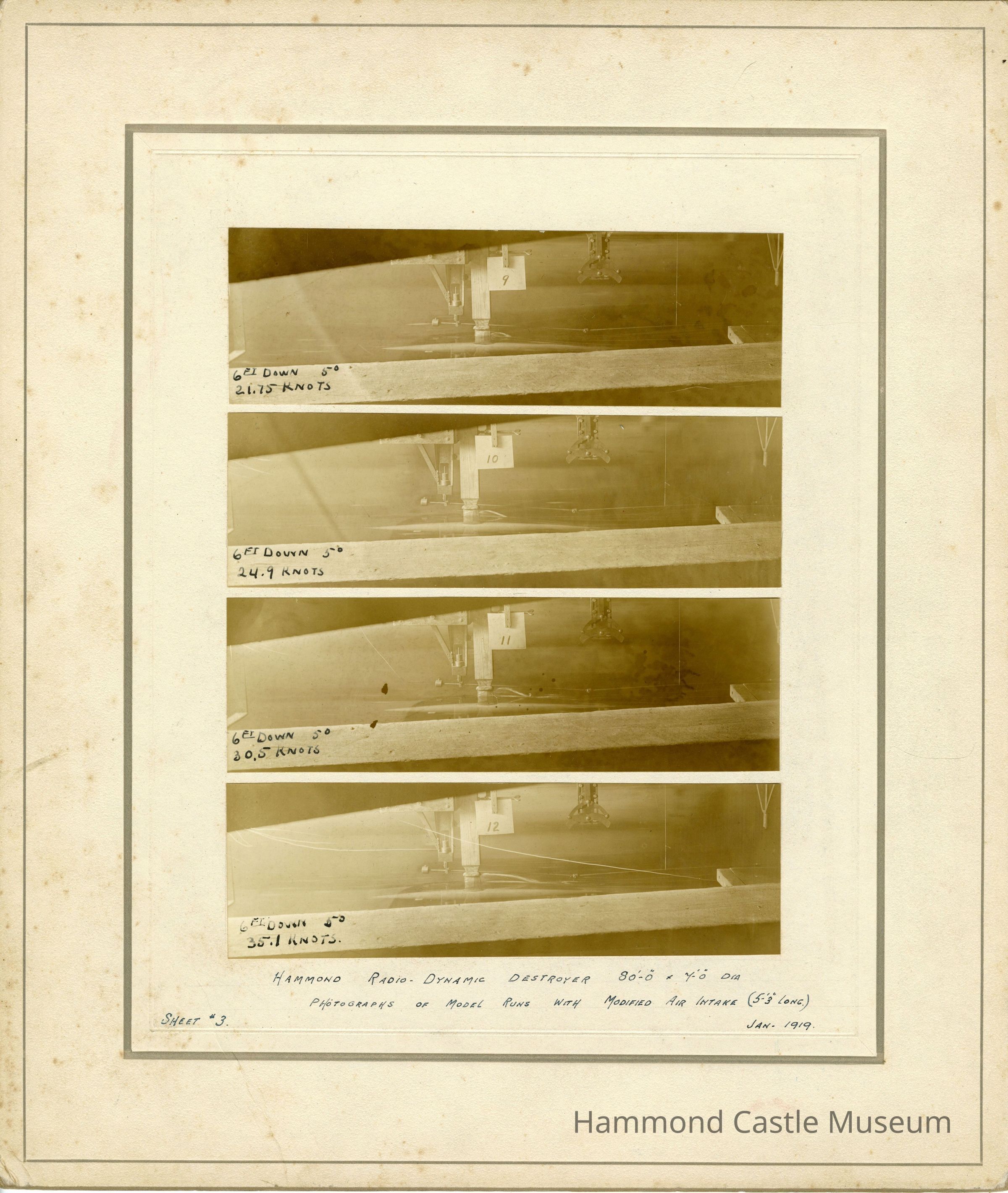 Photos & notes of Hammond Radio-Dynamic Destroyer Sheet#3 Model Runs with Modified Air Intake, Jan 1919