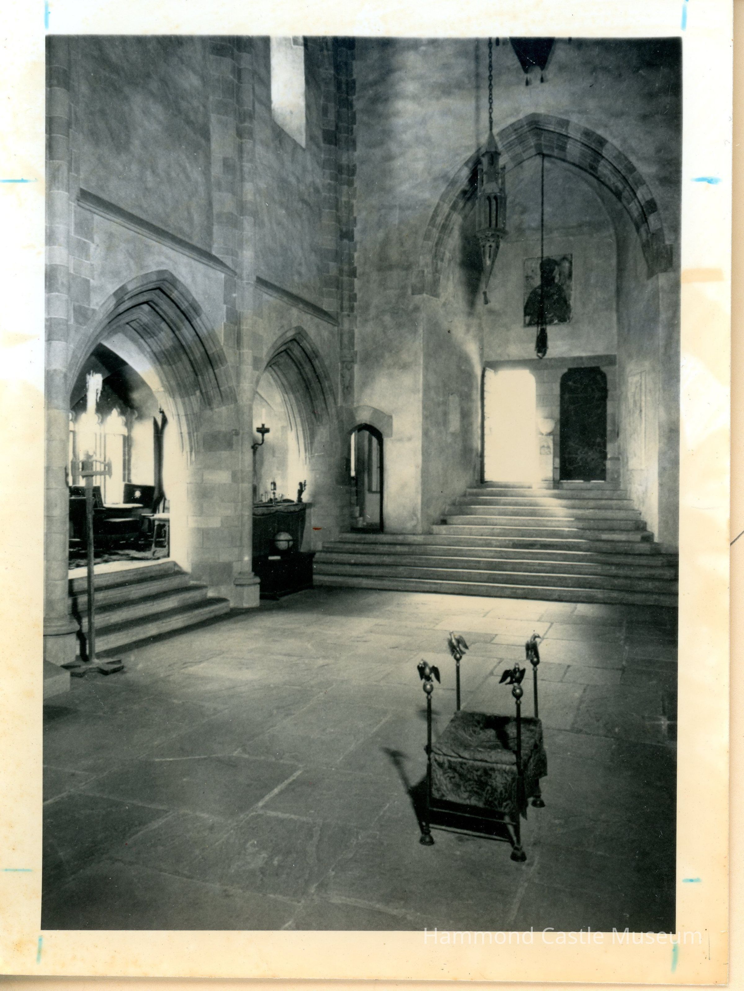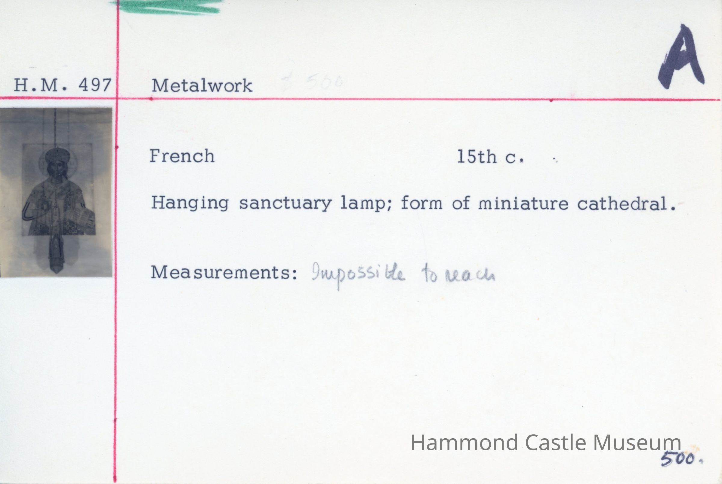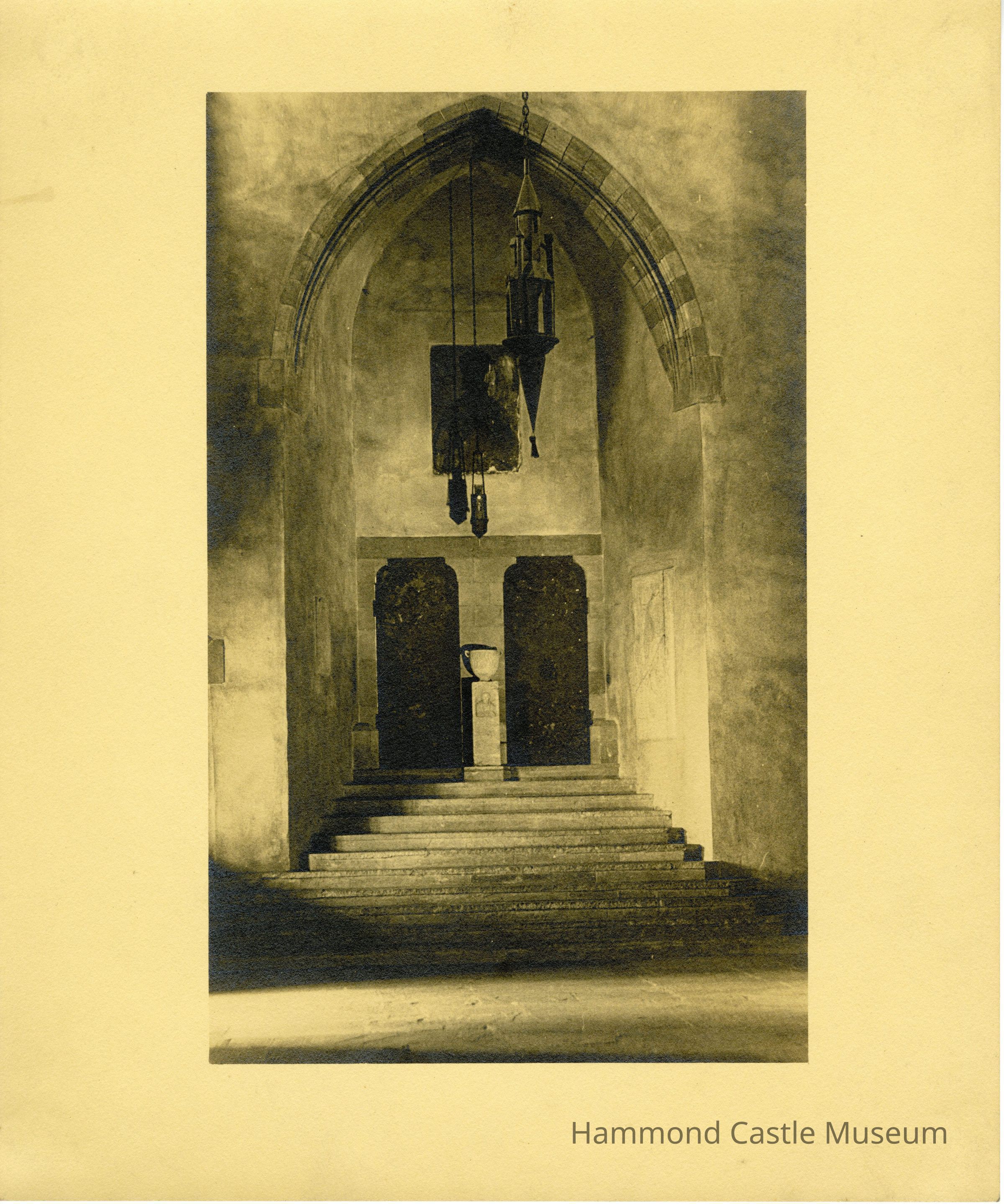 Great Hall hanging sanctuary lantern in form of miniature cathedral over stairs to courtyard Reportedly French, circa 1440 or Possibly designed by Hammond as mentioned in 1927-01-17 letter to Buswell (CAM collection)