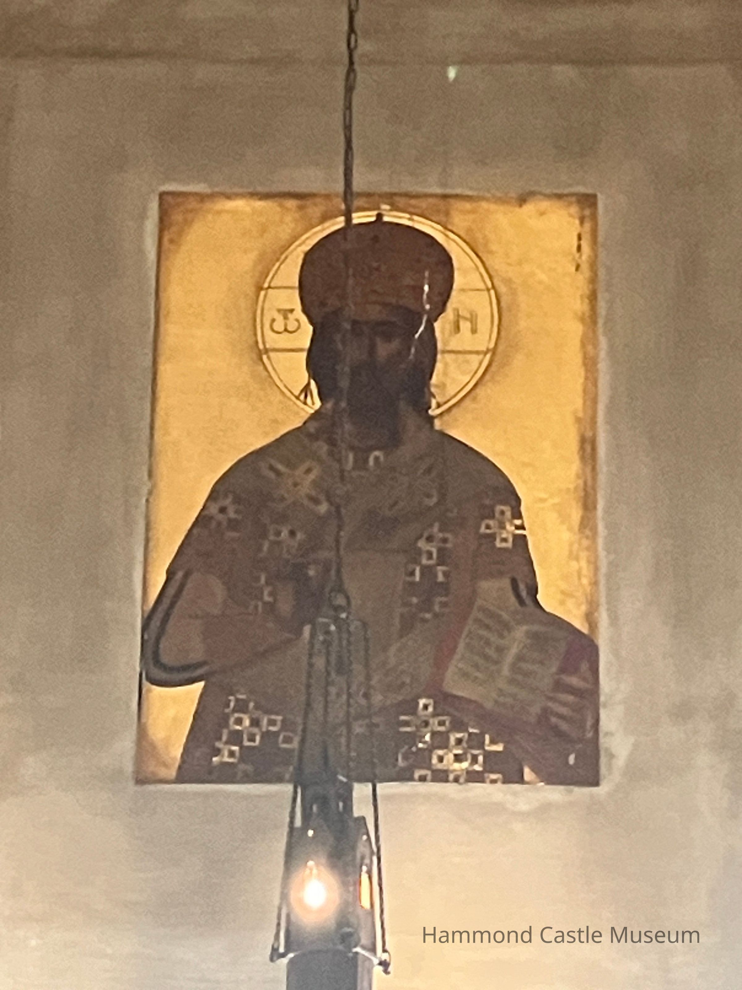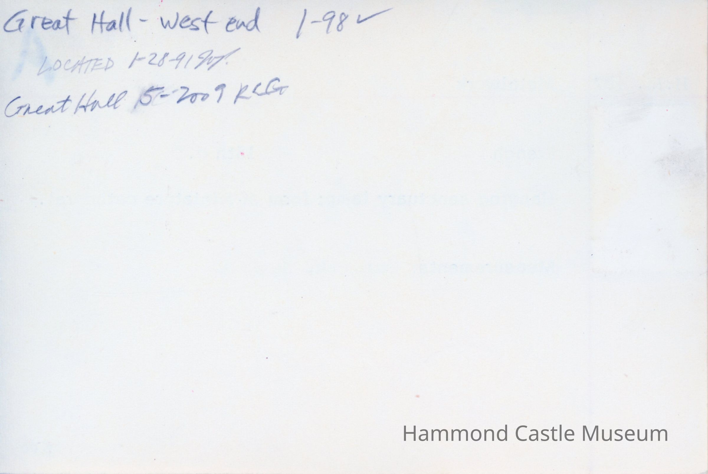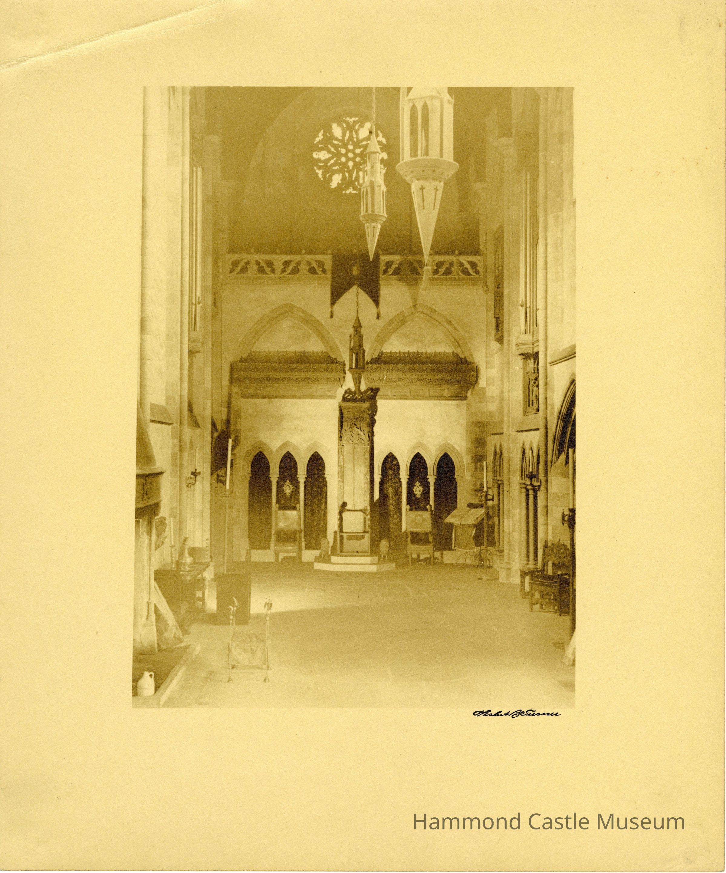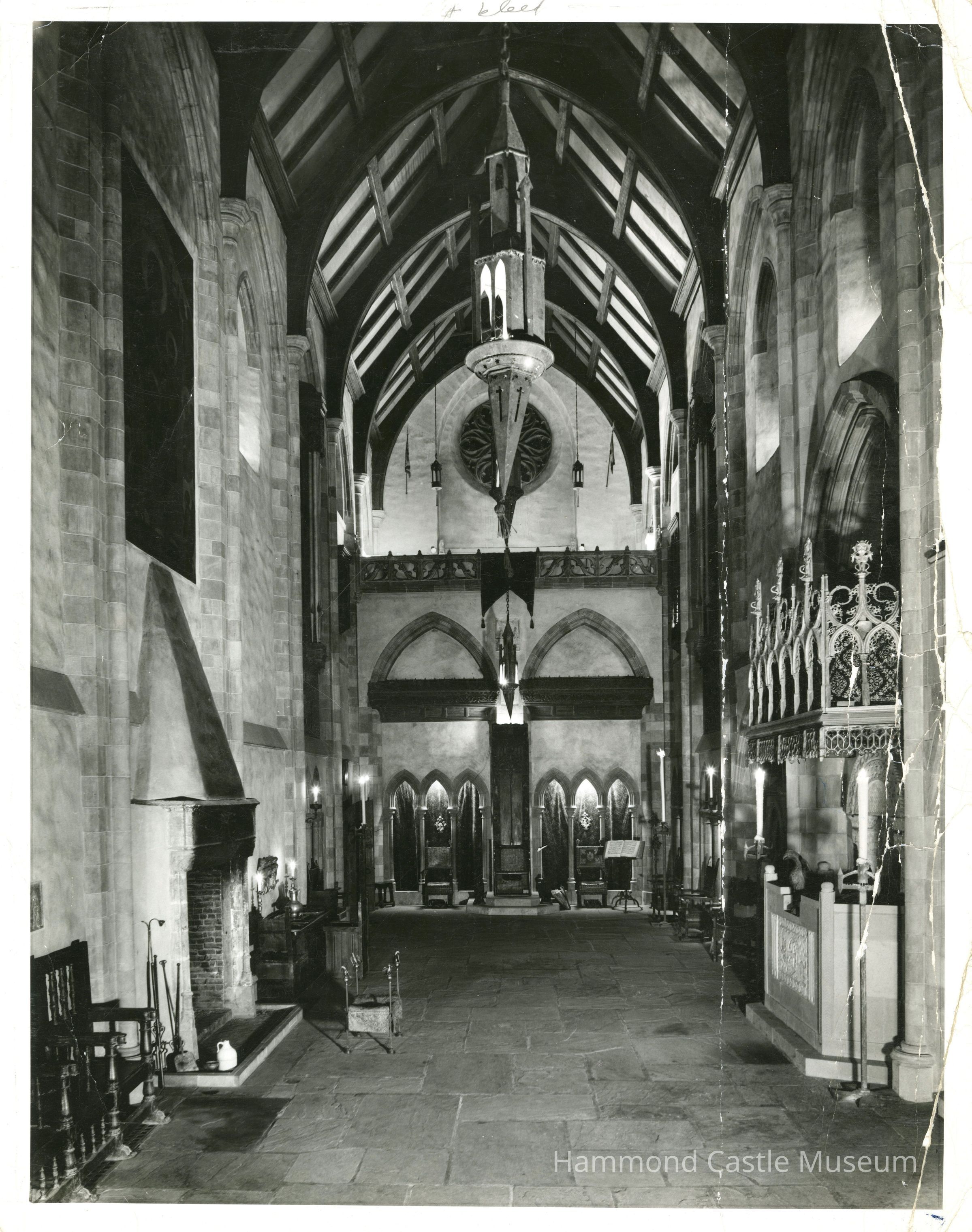 Great Hall hanging sanctuary lantern in form of miniature cathedral over stairs to courtyard Reportedly French, circa 1440 or Possibly designed by Hammond as mentioned in 1927-01-17 letter to Buswell (CAM collection)