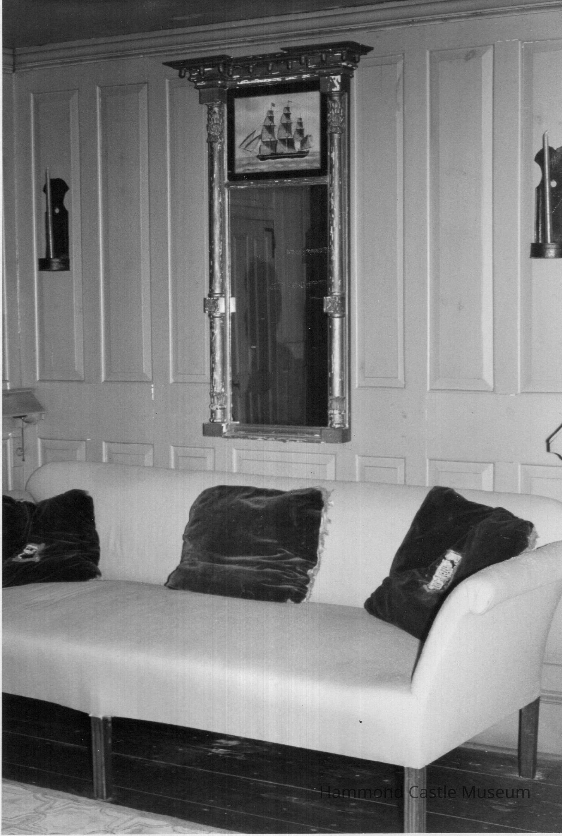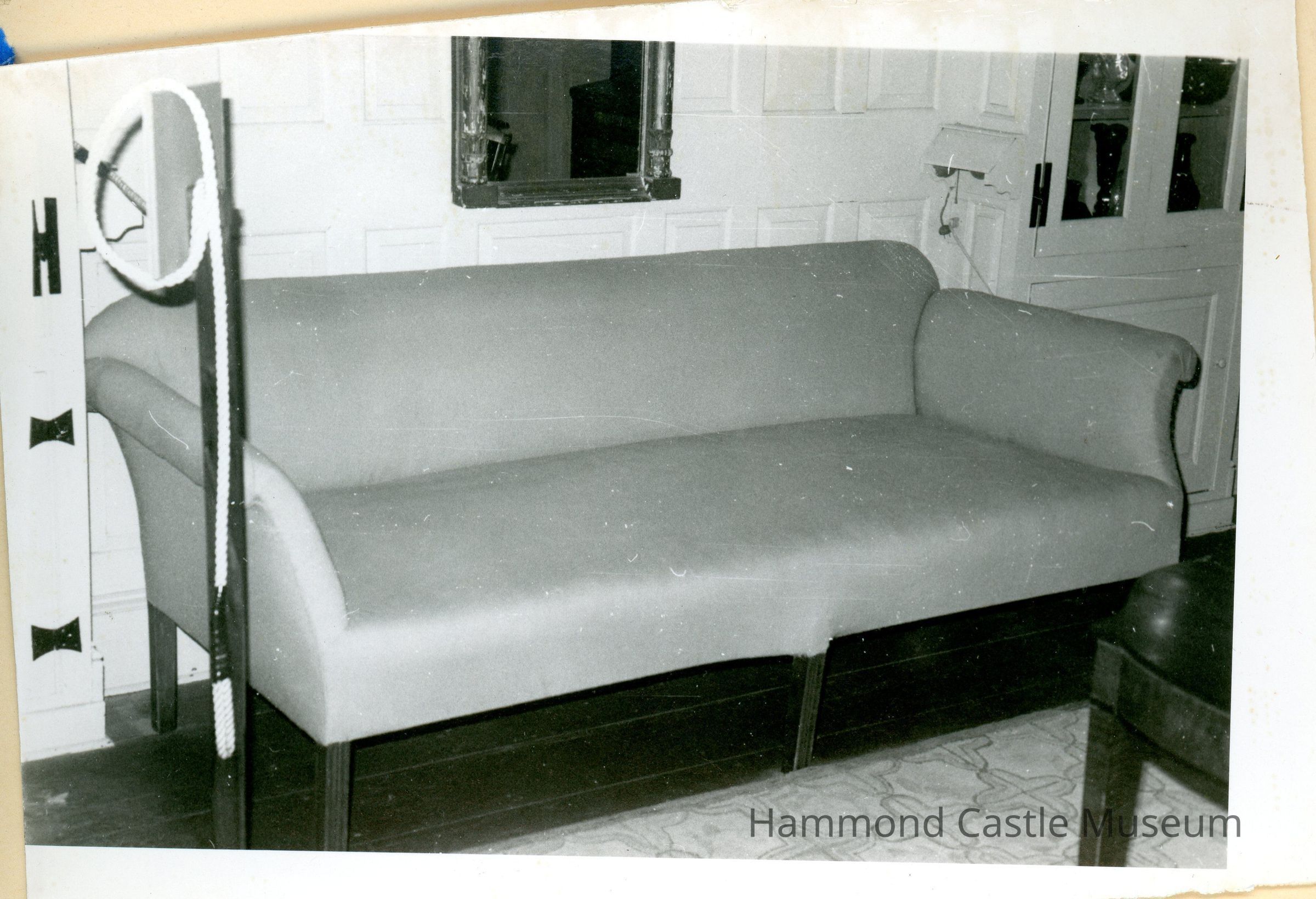 Tightly fitted upholstered sofa with wooden legs, similar to Hepplewhite chairs 1965 Probate Inventory - Sitting Room
