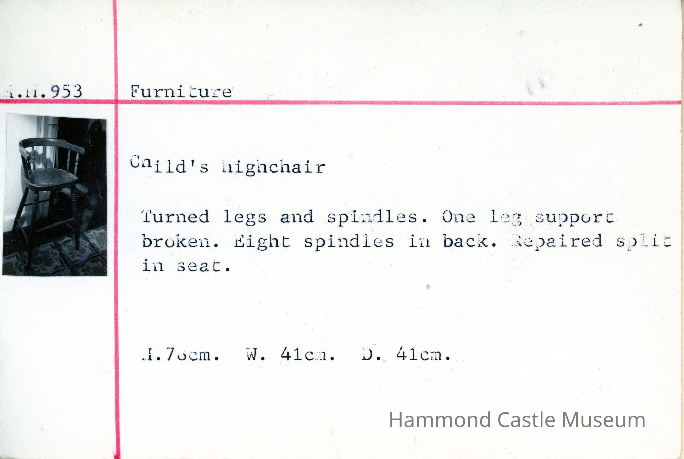 Turned legs and spindles. One leg support broken. Eight spindles in back. Repaired split in seat. 1965 Probate Inventory - Sitting Room