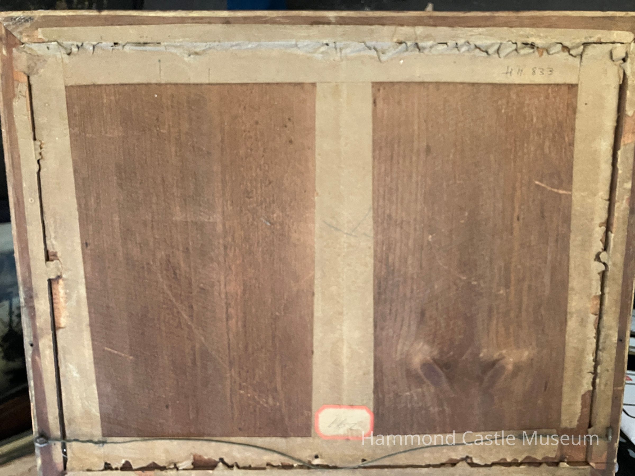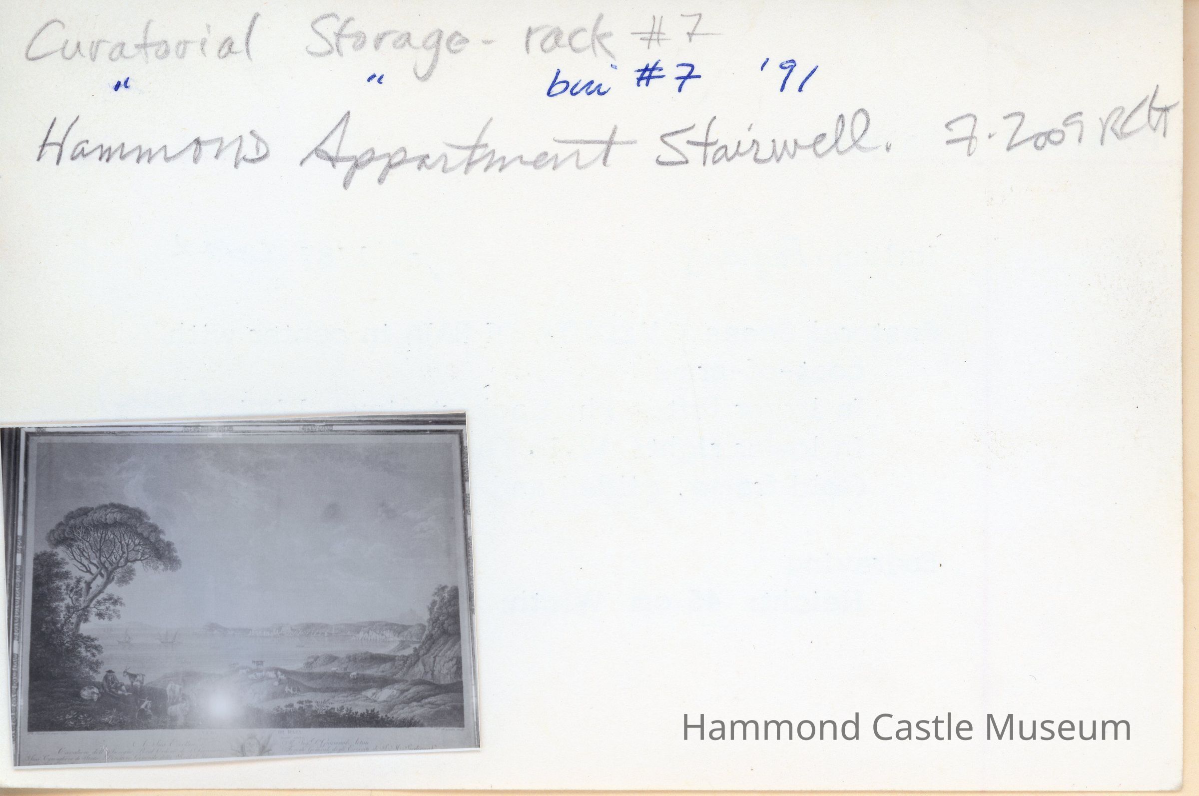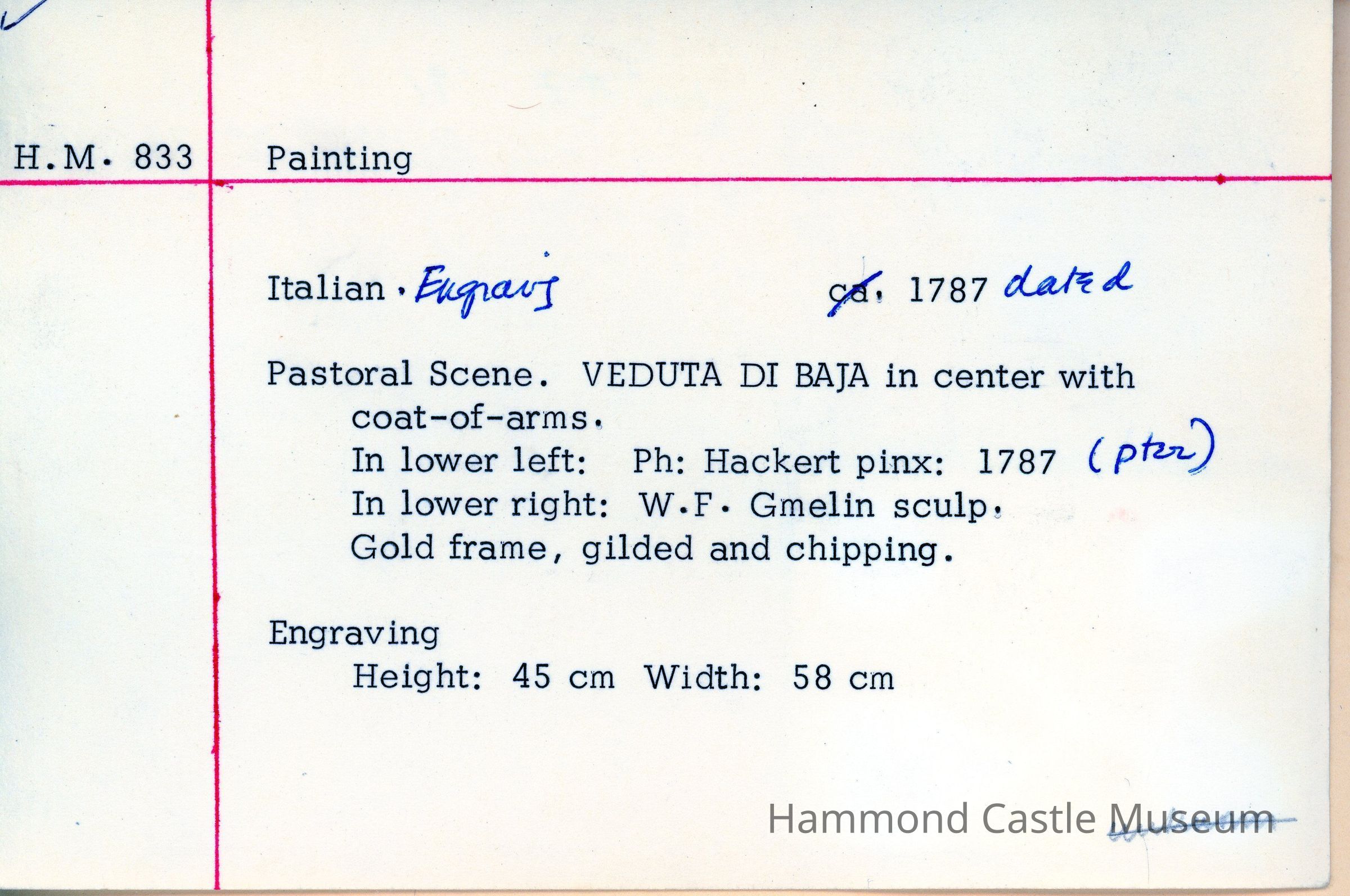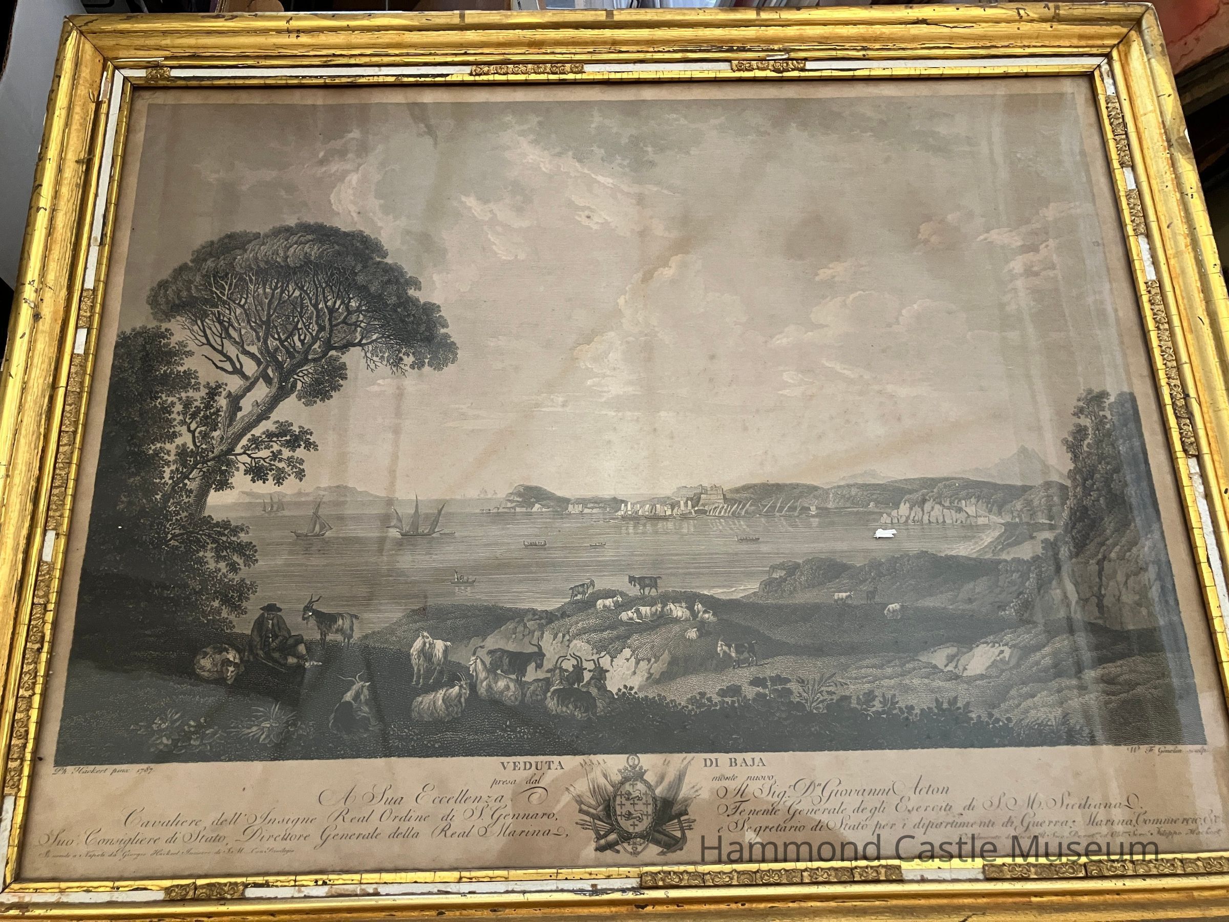 Pastoral scene. VEDUTA DI BAJA in center with coat-of-arms. In lower left: Ph: Hacket pinx: 1787 In lower right: W.F. Gmelin sculp. Gold frame, gilded and chipping.