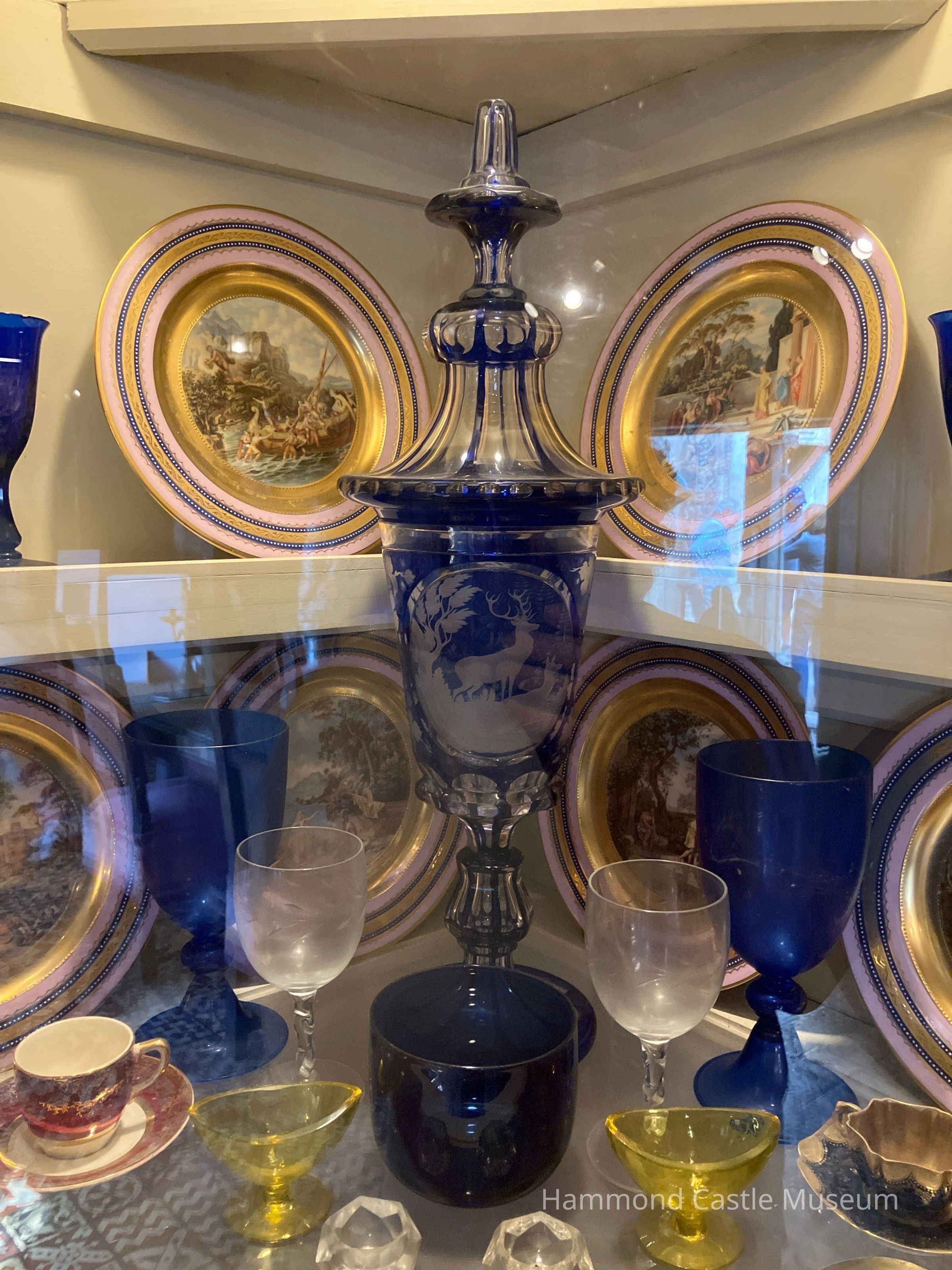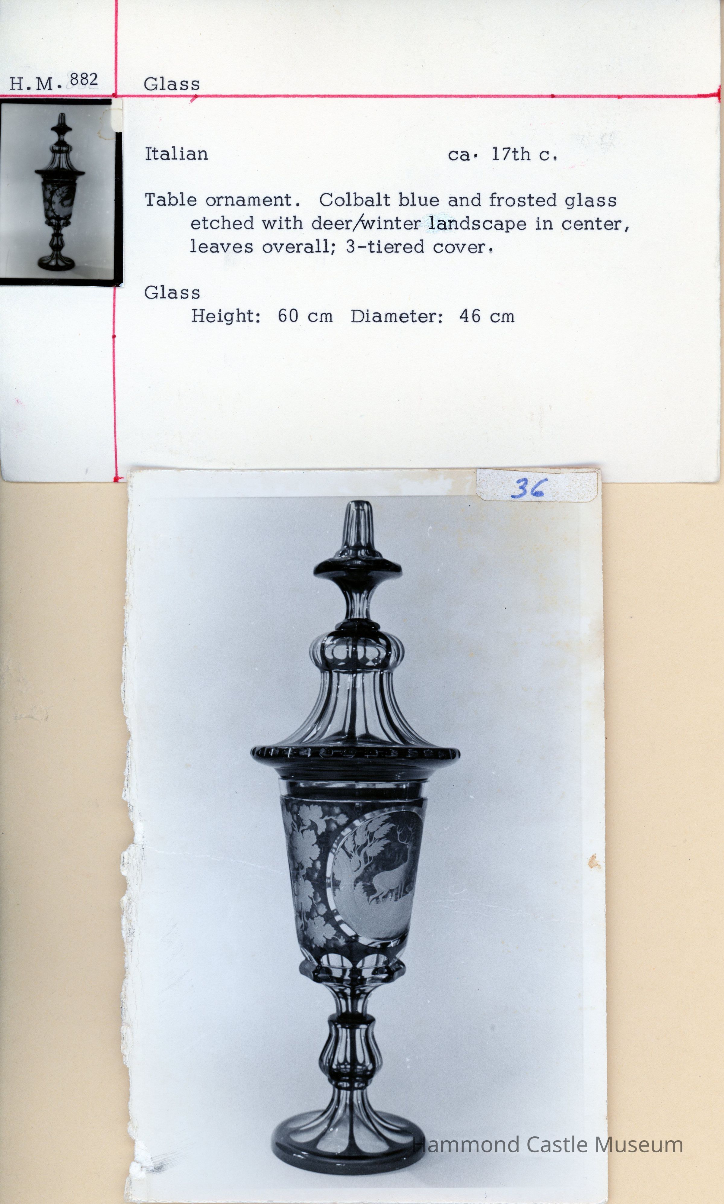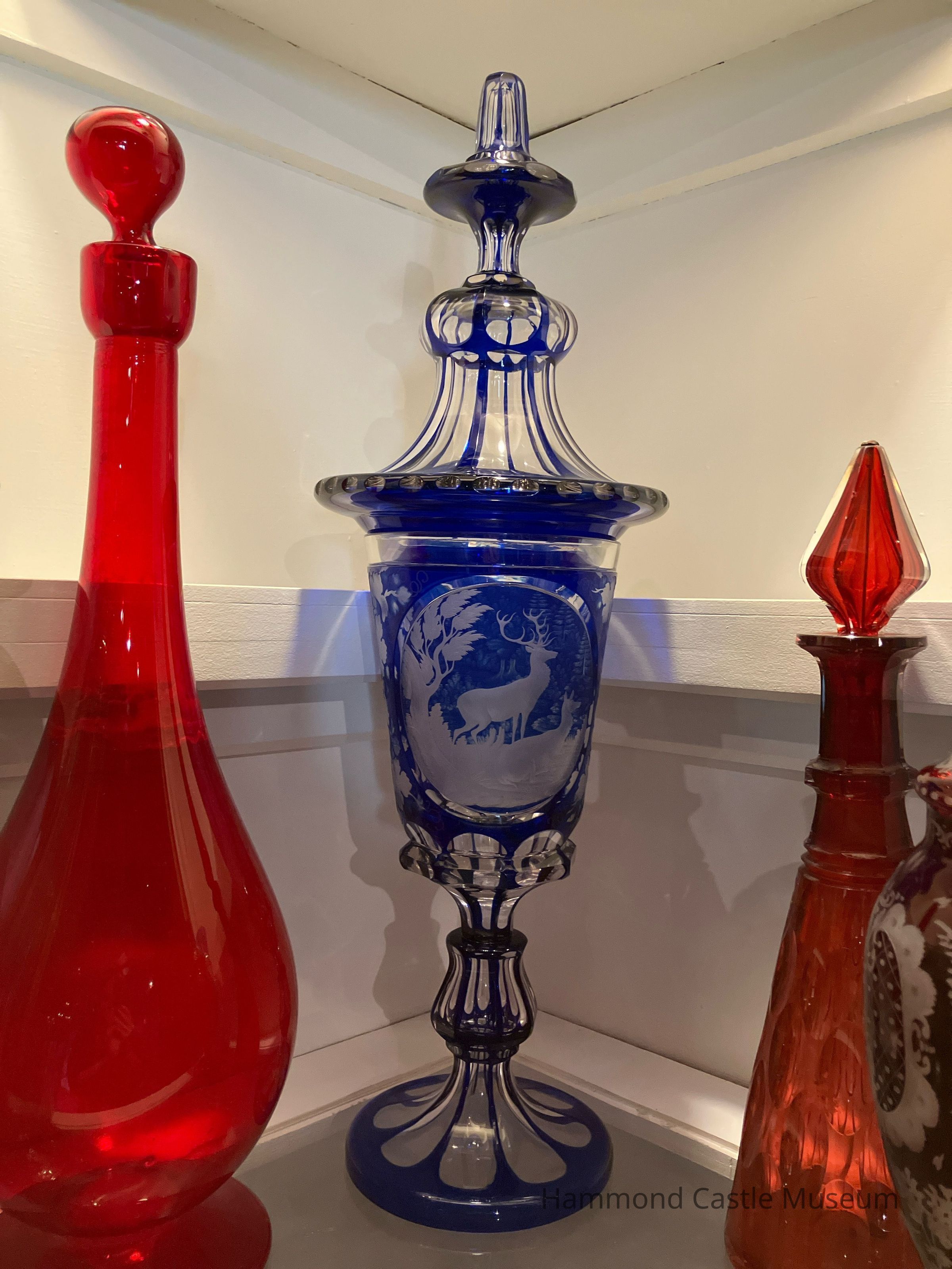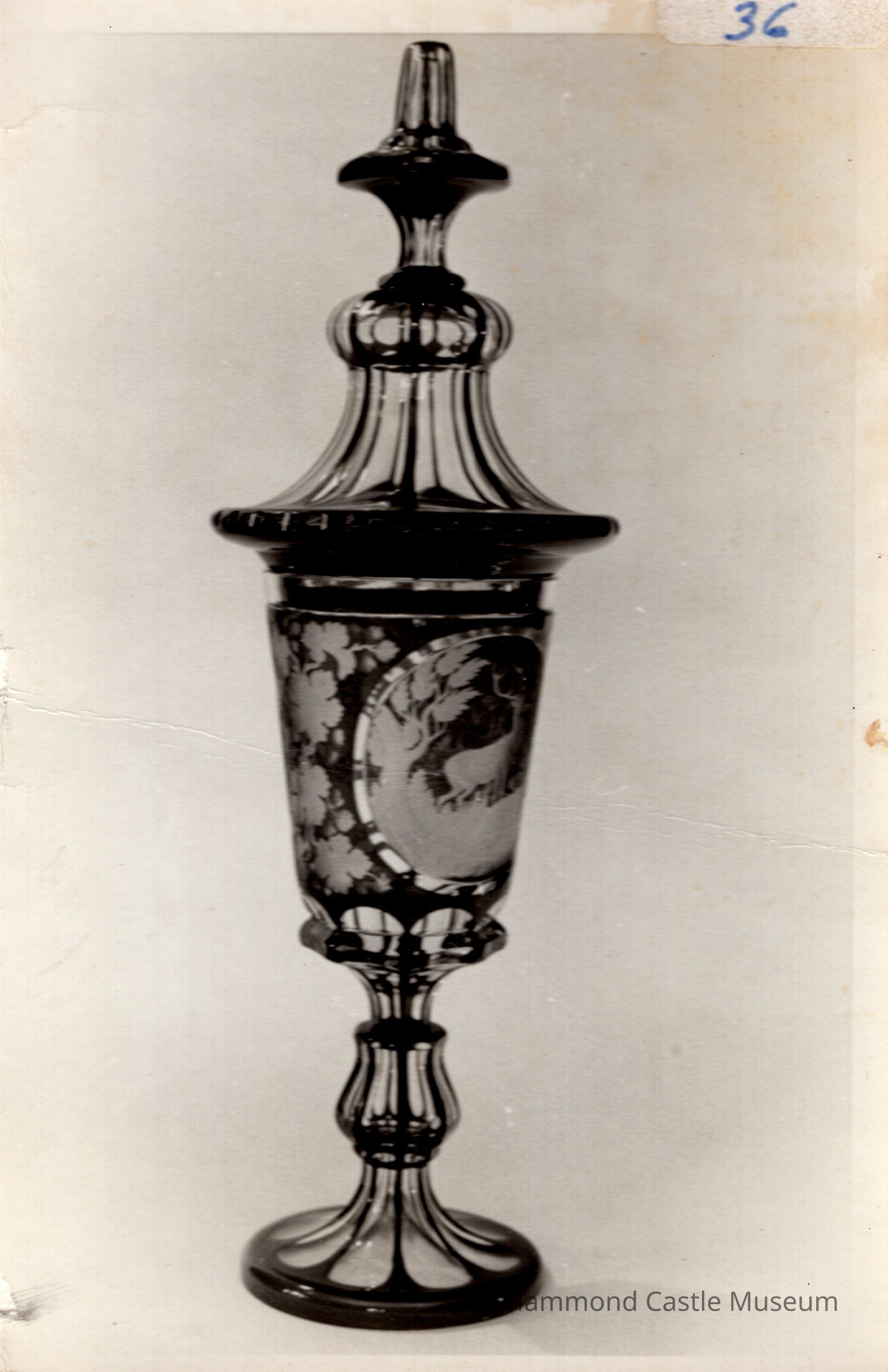 Table vase w lid. Cobalt blue and frosted glass etched with deer/winter landscape in center, leaves overall; 3-tiered cover.