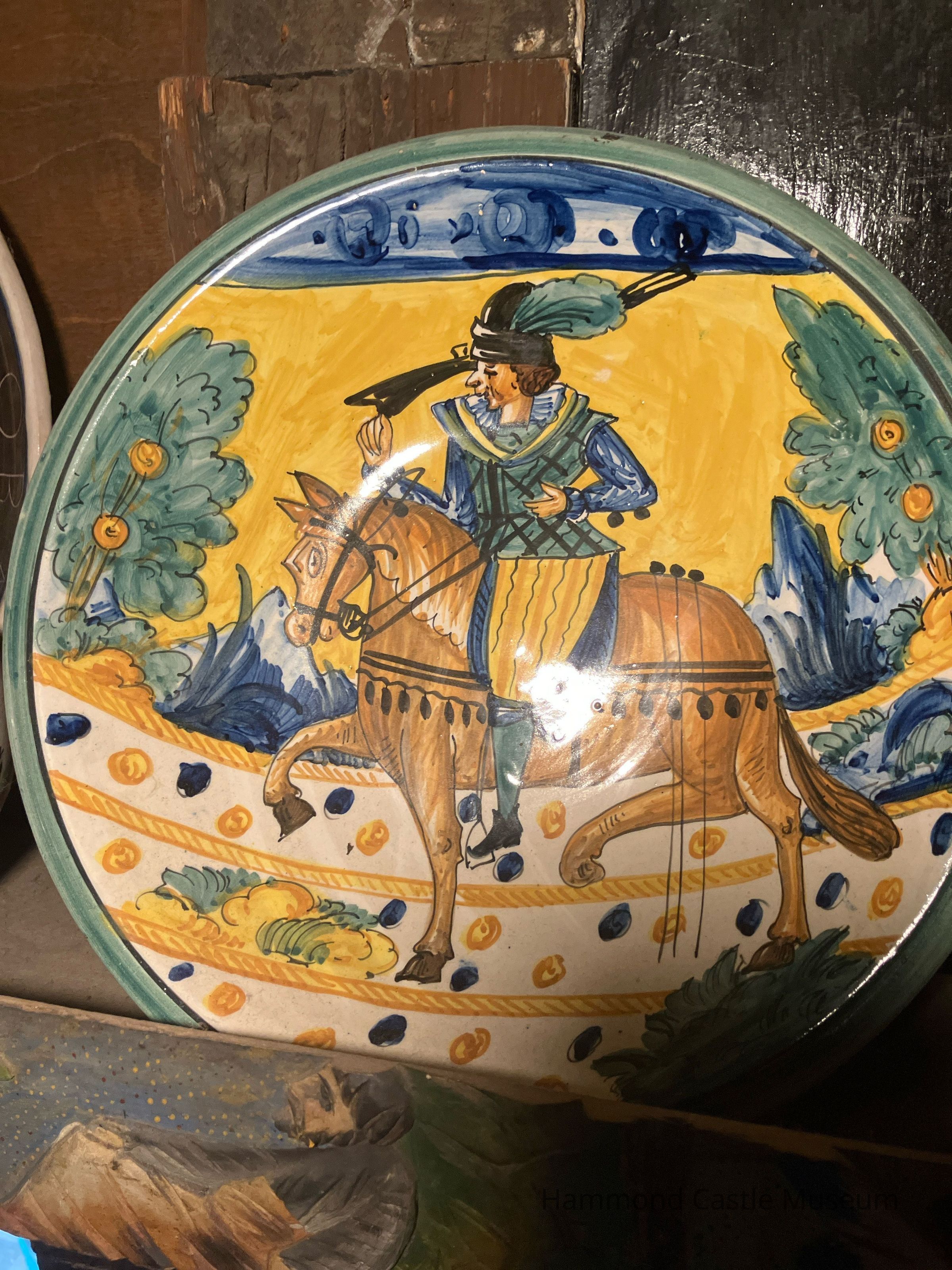 19th/20th Century Italian ceramic plate. Majolica deep dishes with medieval inspired decoration. Maker's mark. Part of four piece set. 1 - rider on horse facing left 2 - rider on horse facing right 3 - 2 soldiers facing each each with a spear 4 -- drummer & solder marching to the right