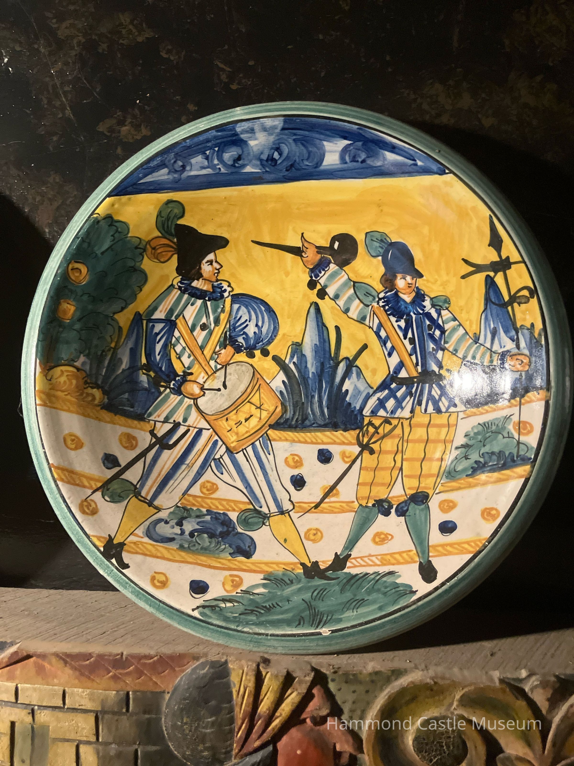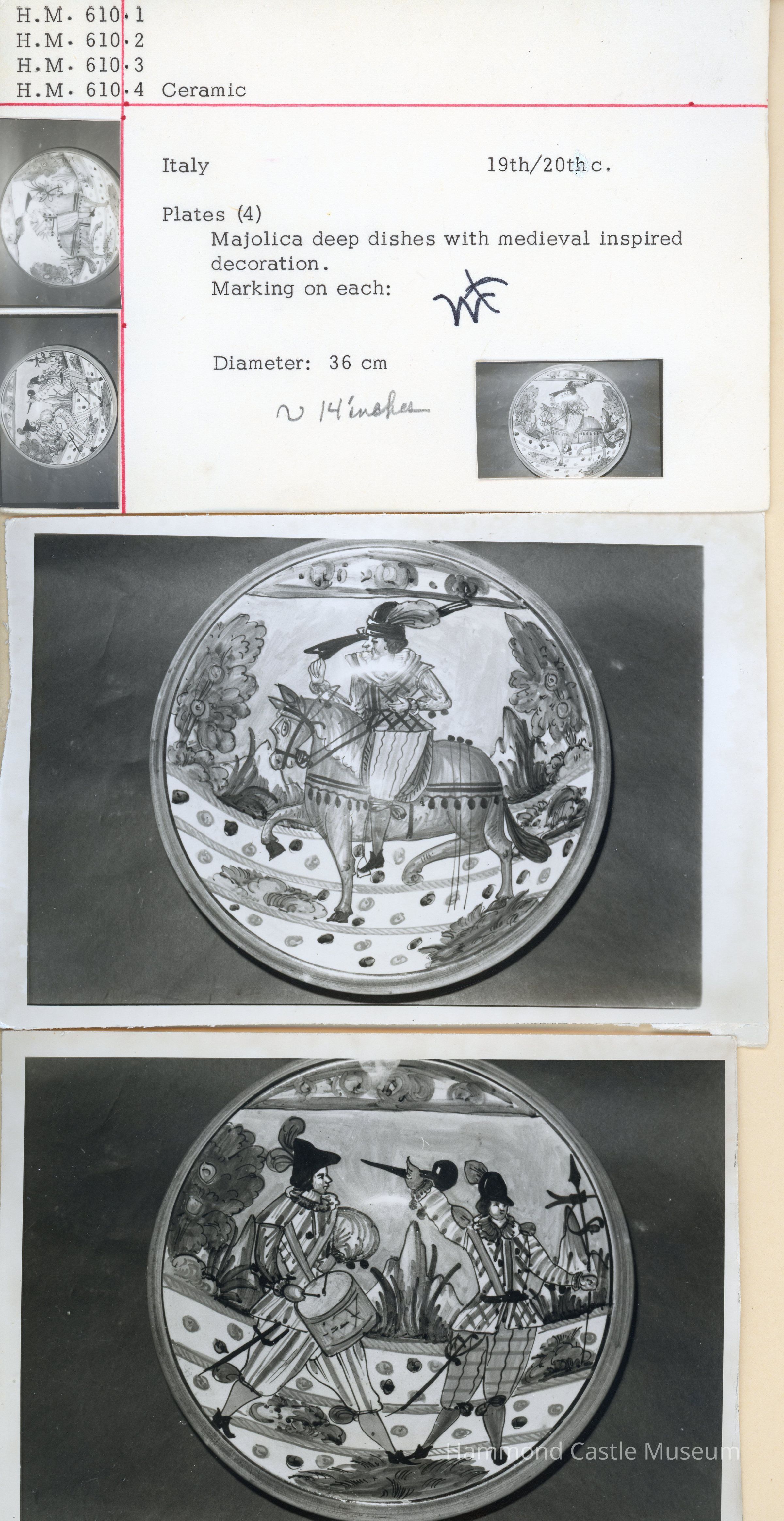 19th/20th Century Italian ceramic plate. Majolica deep dishes with medieval inspired decoration. Maker's mark. Part of four piece set. 1 - rider on horse facing left 2 - rider on horse facing right 3 - 2 soldiers facing each each with a spear 4 -- drummer & solder marching to the right