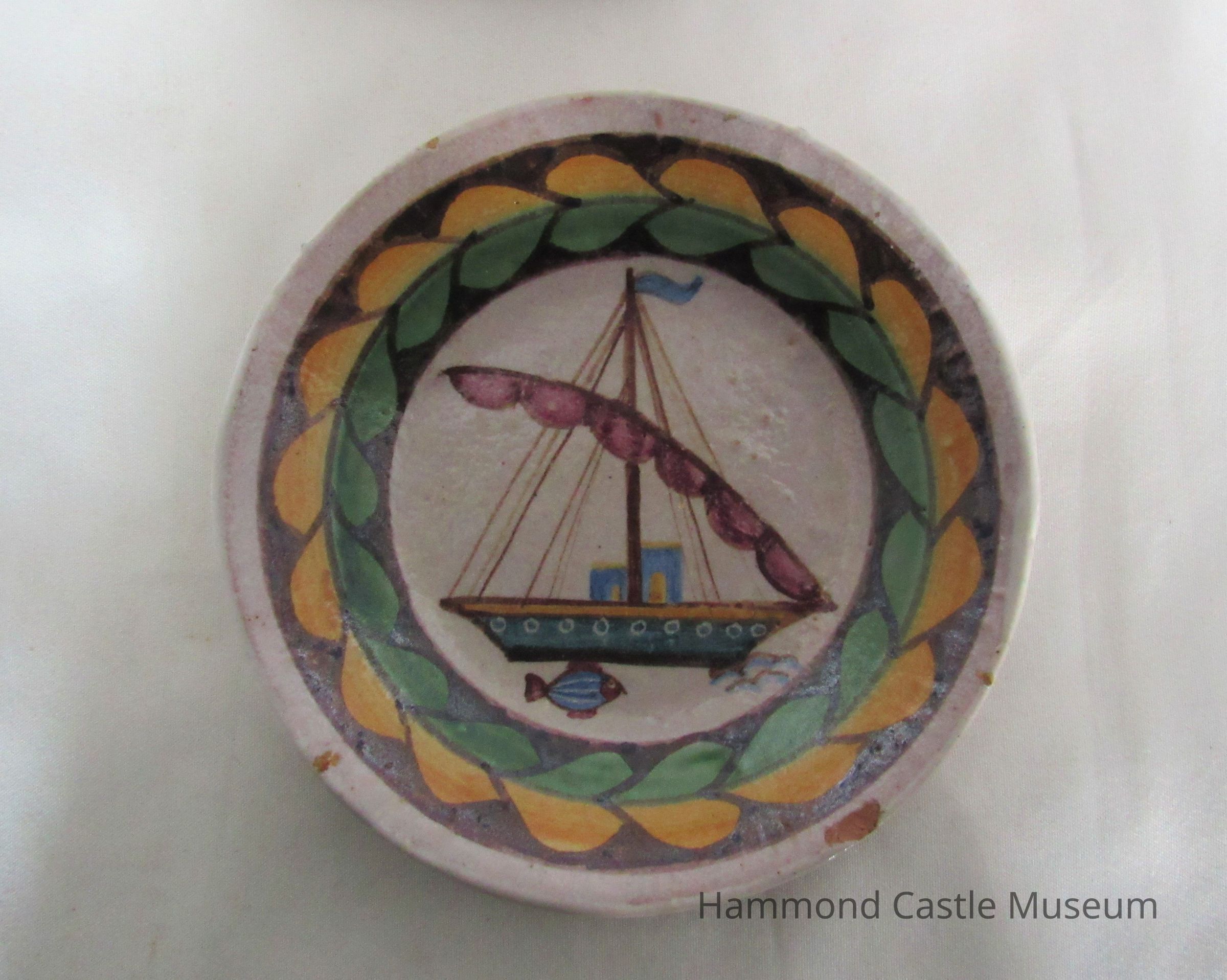 19th/20th century Italian earthenware glazed plate with primitive decoration. Depicts river boat with fish