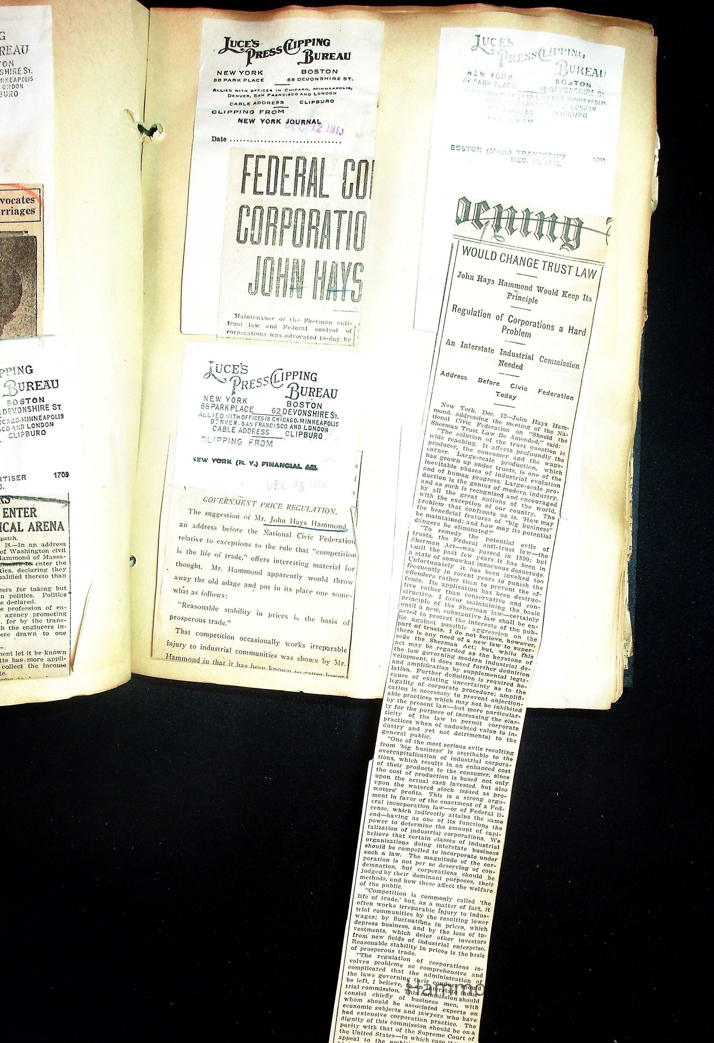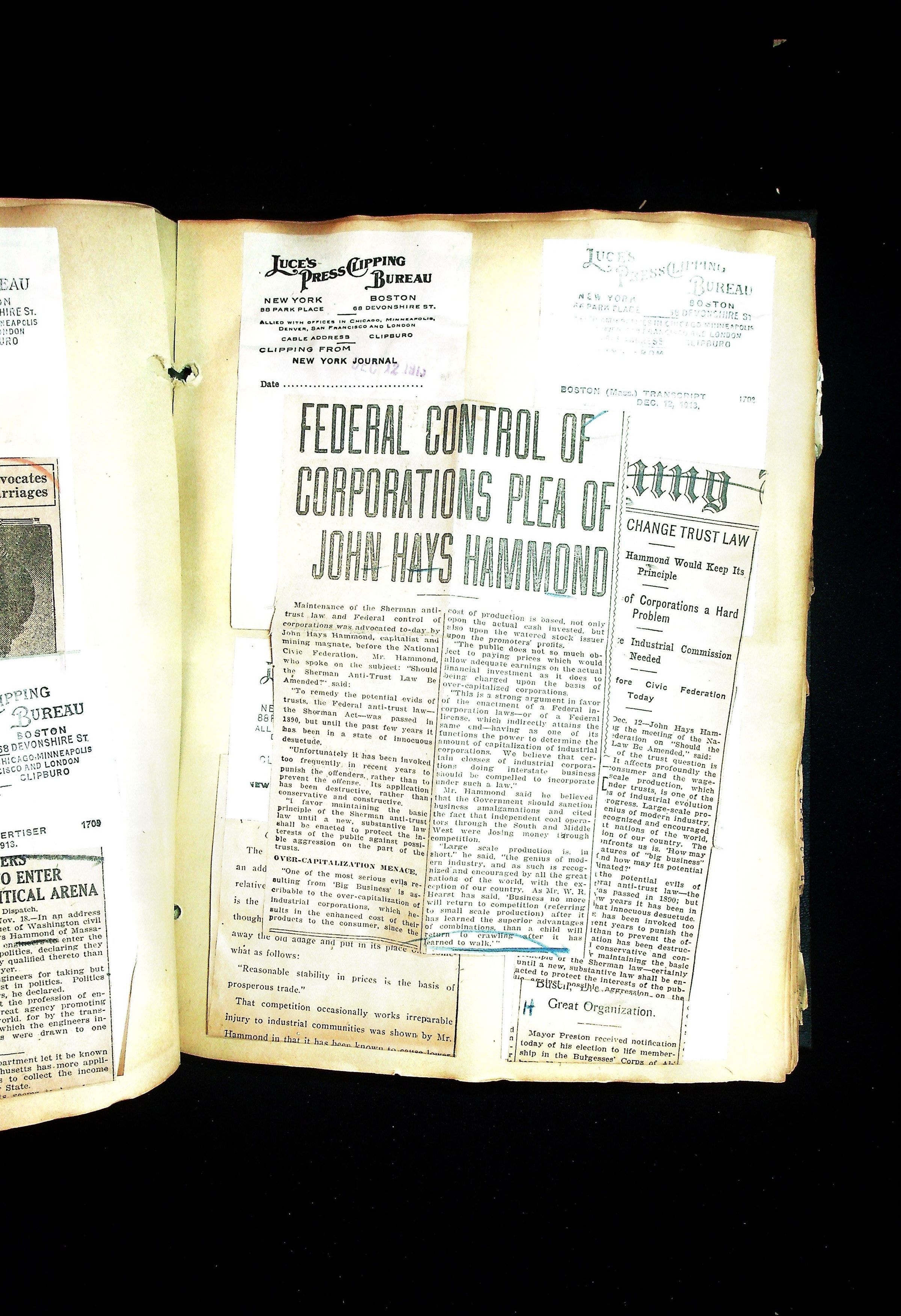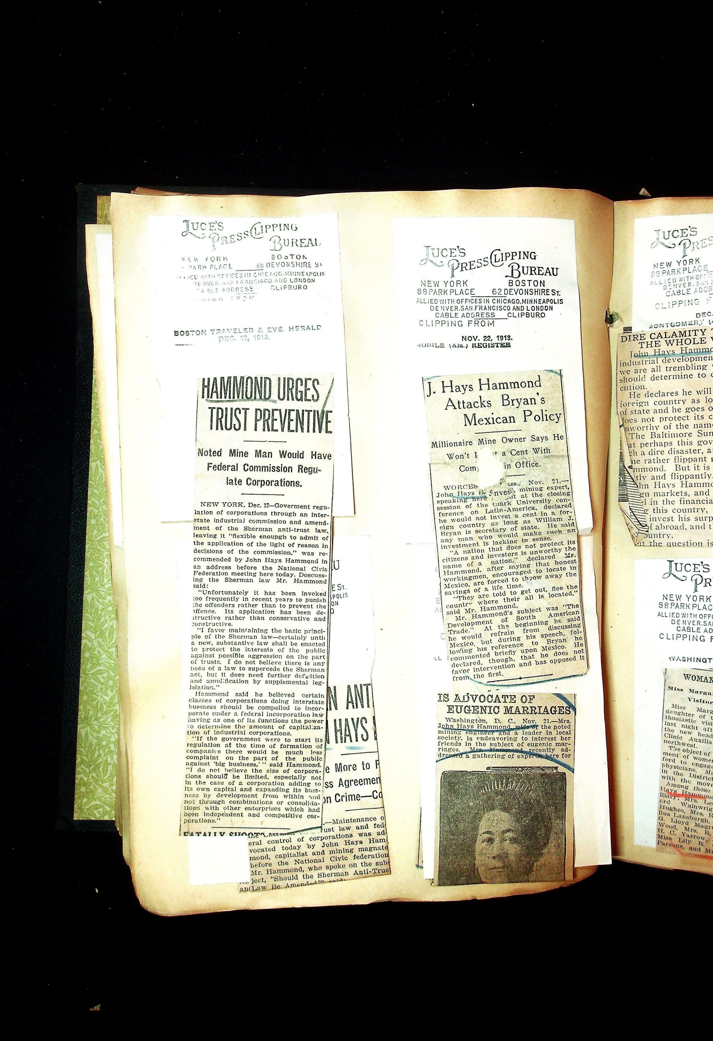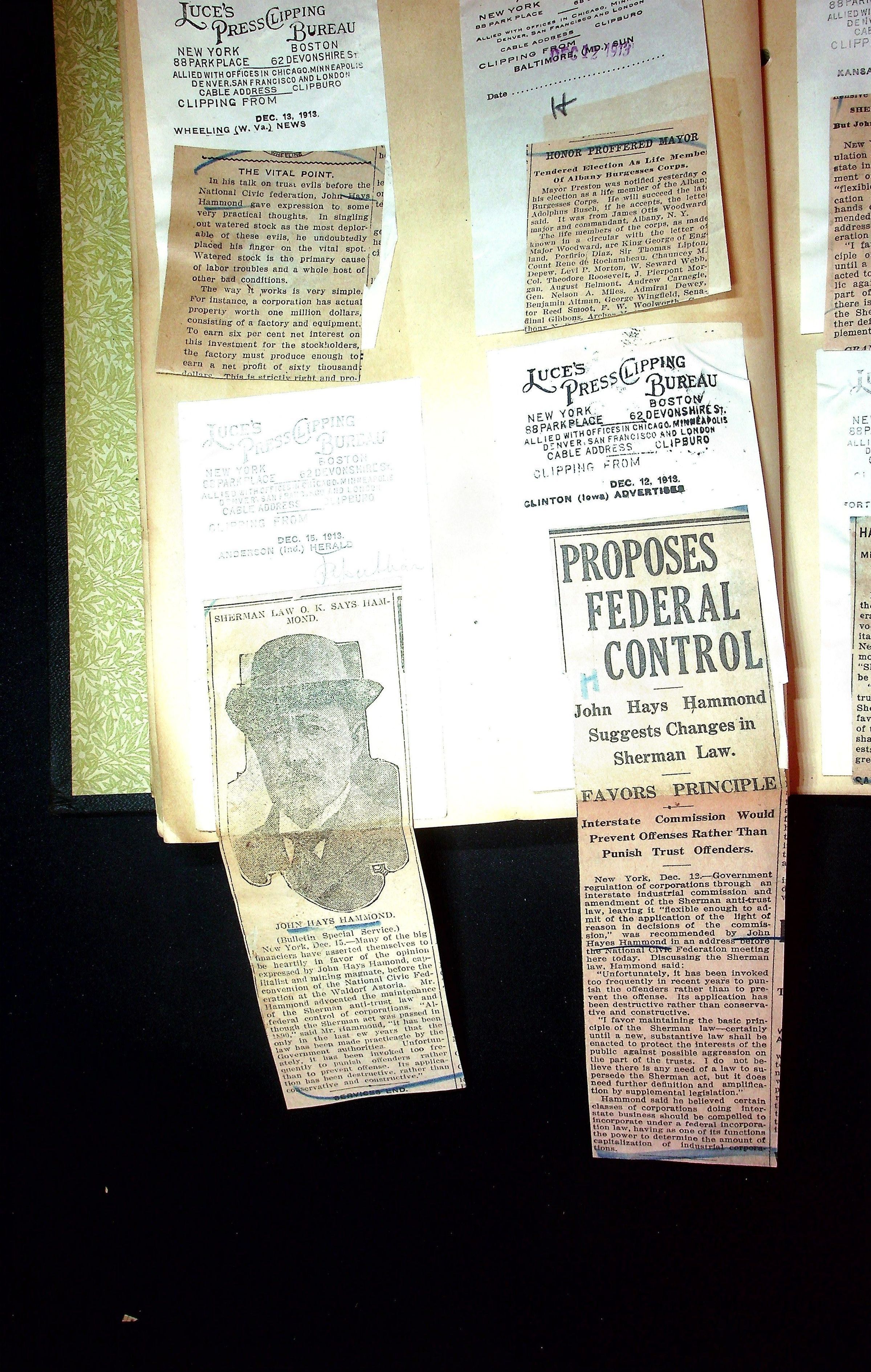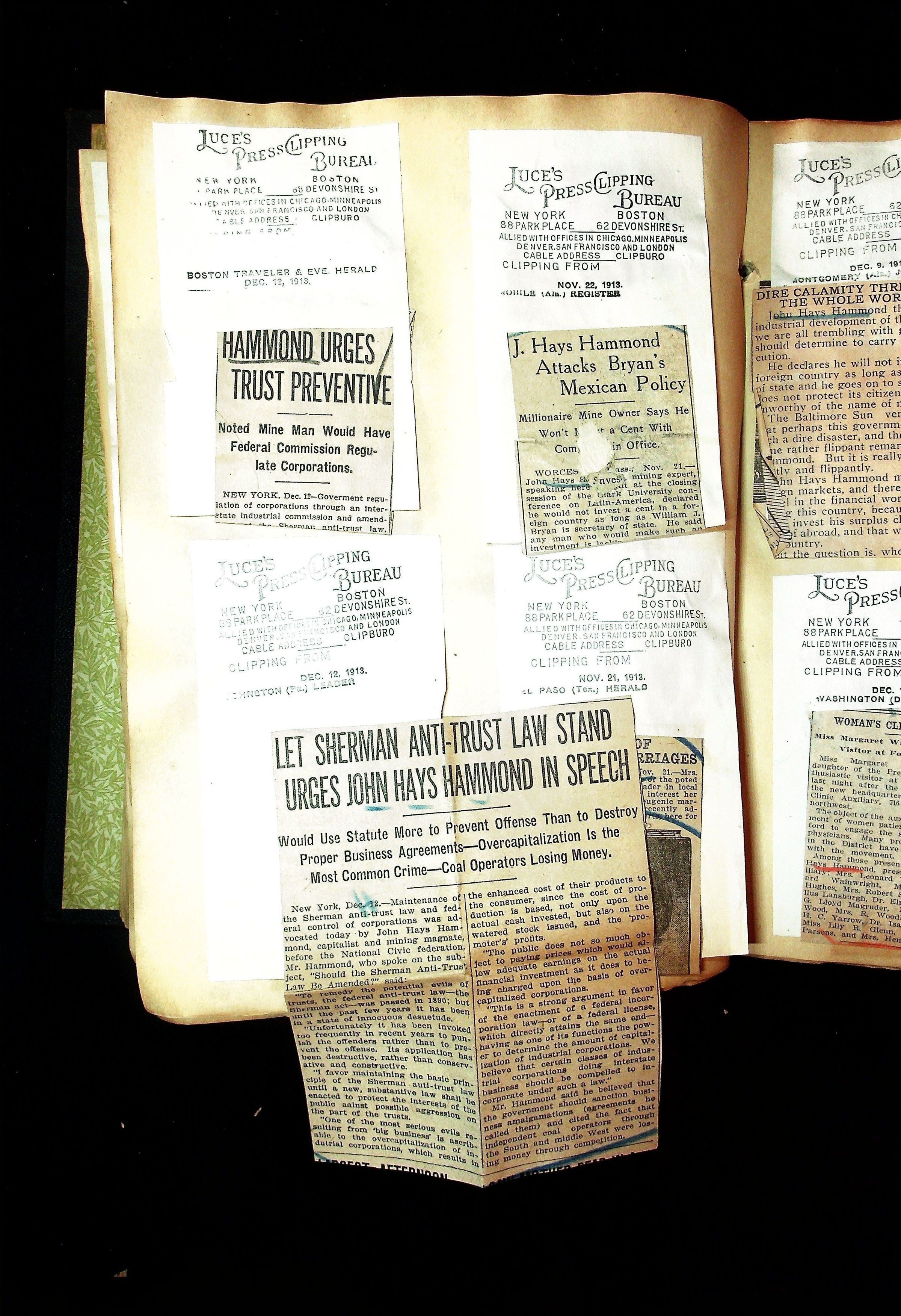 1913 scrapbook of newspaper articles about John Hays Hammond (Sr) and Mrs. Hammond covering governmental policies, Sherman Act, Eugenics & politics.
