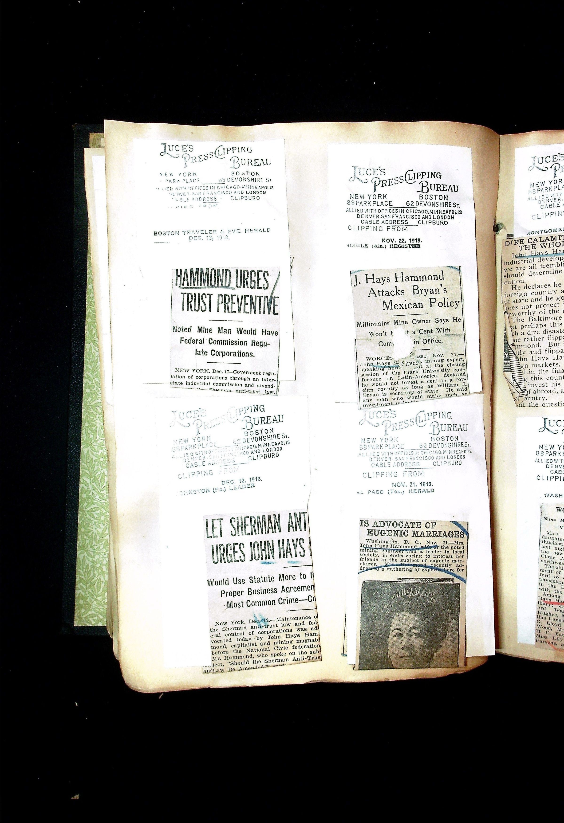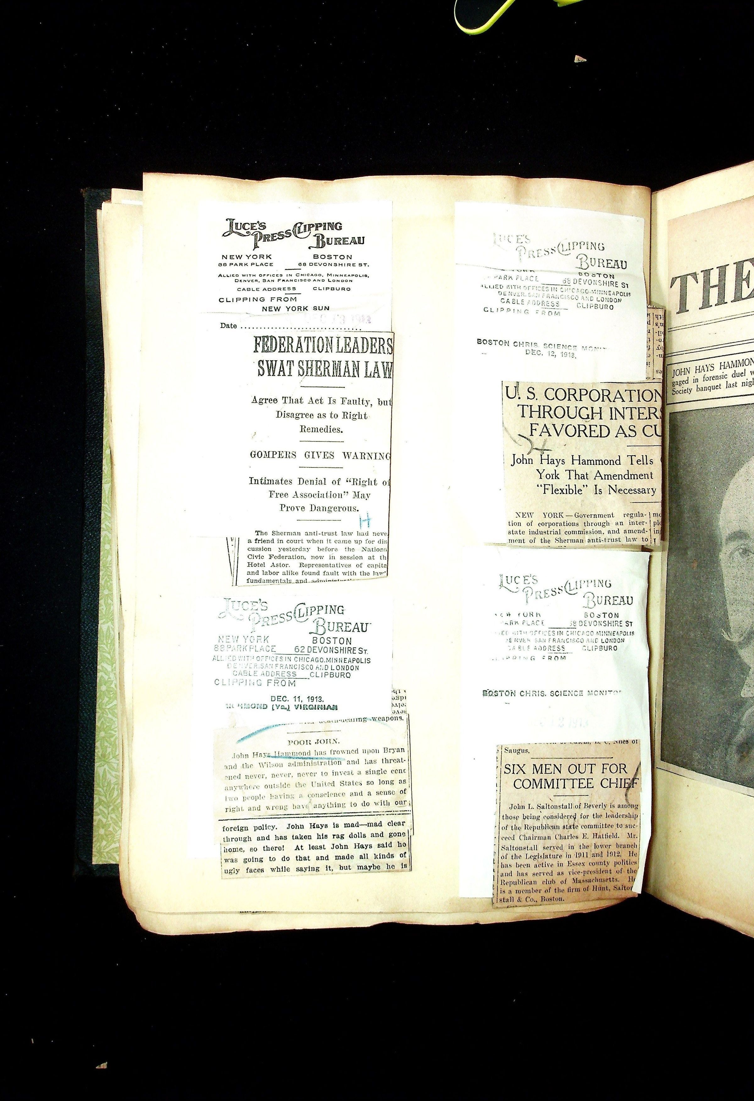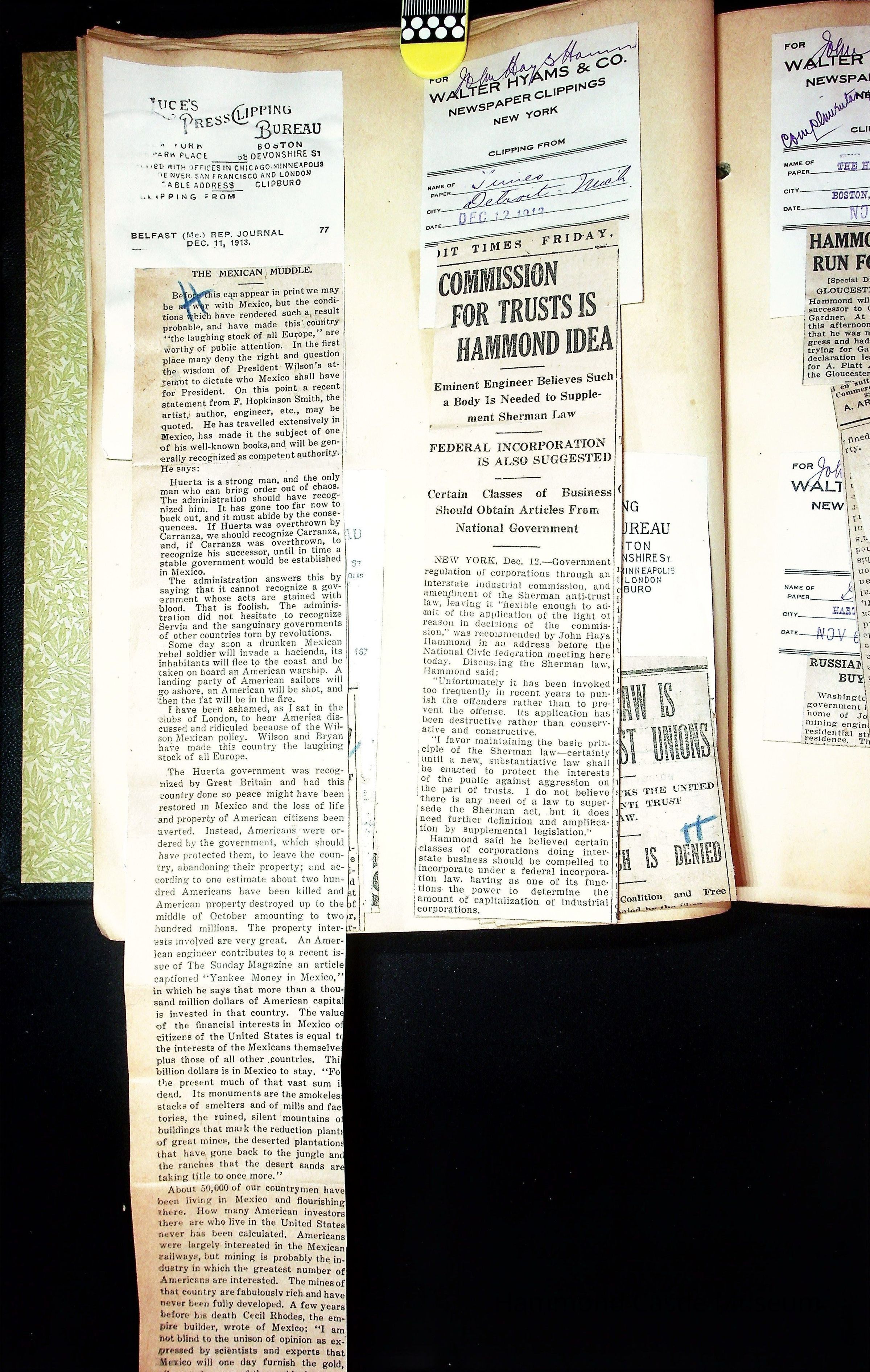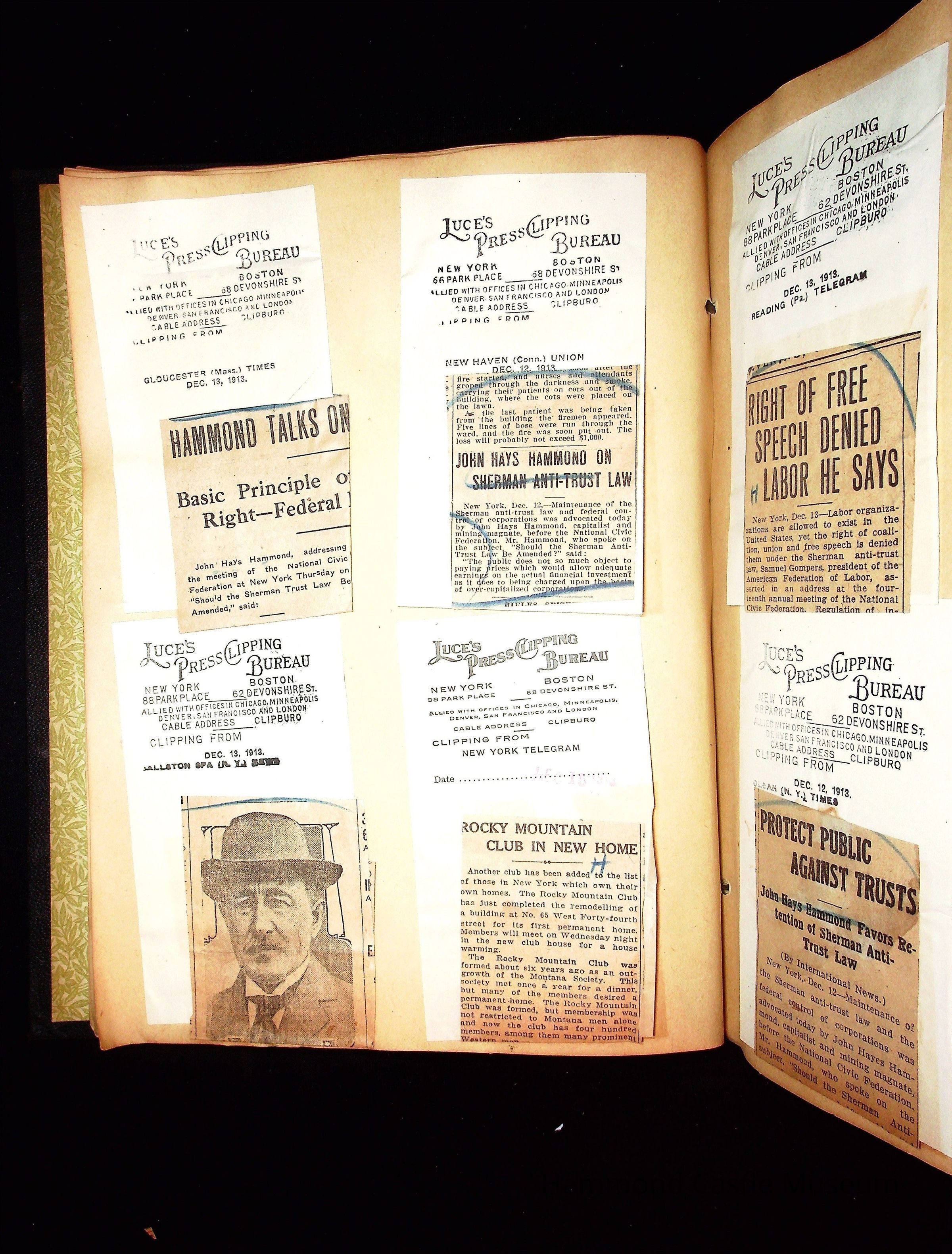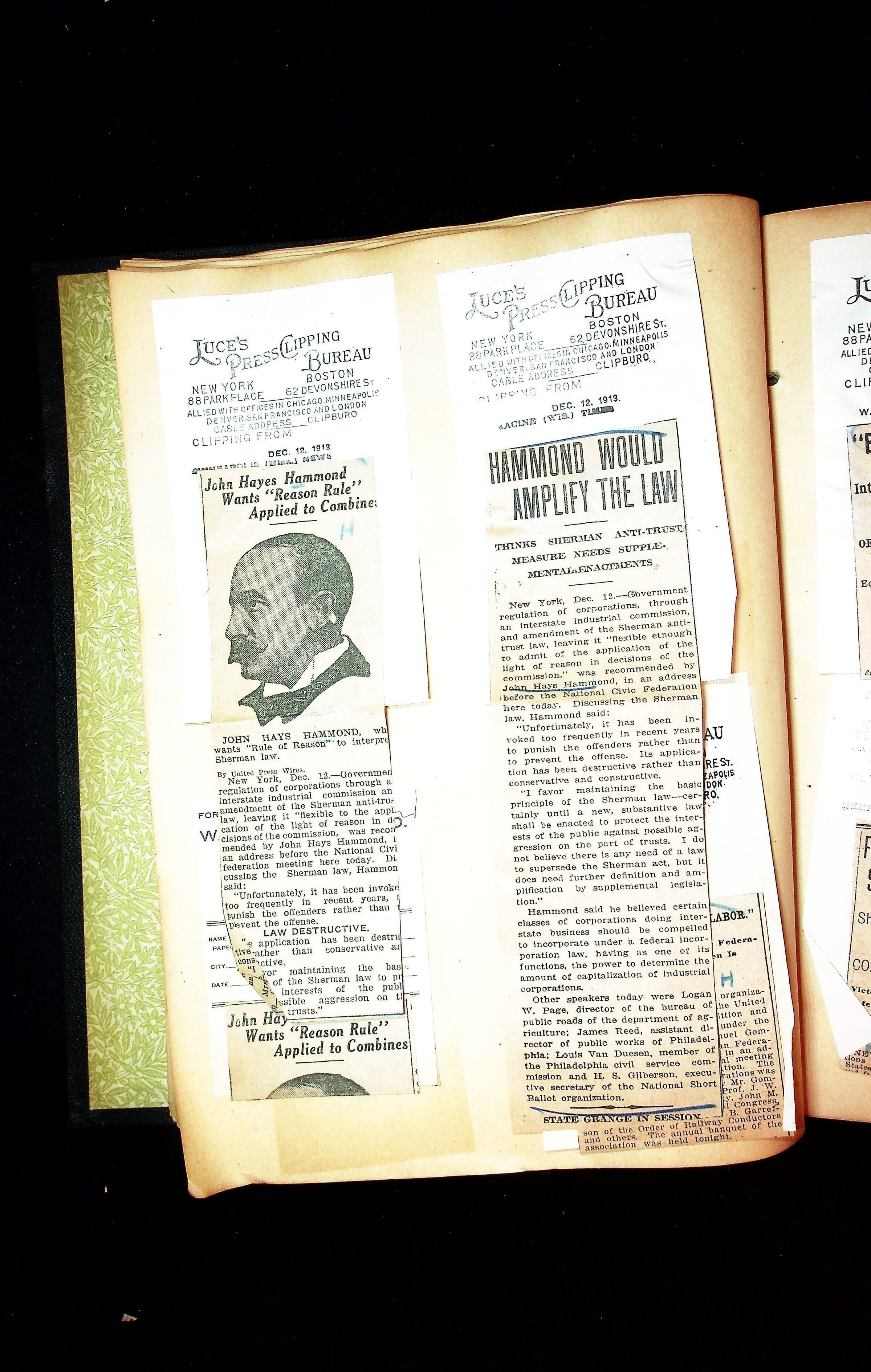 1913 scrapbook of newspaper articles about John Hays Hammond (Sr) and Mrs. Hammond covering governmental policies, Sherman Act, Eugenics & politics.