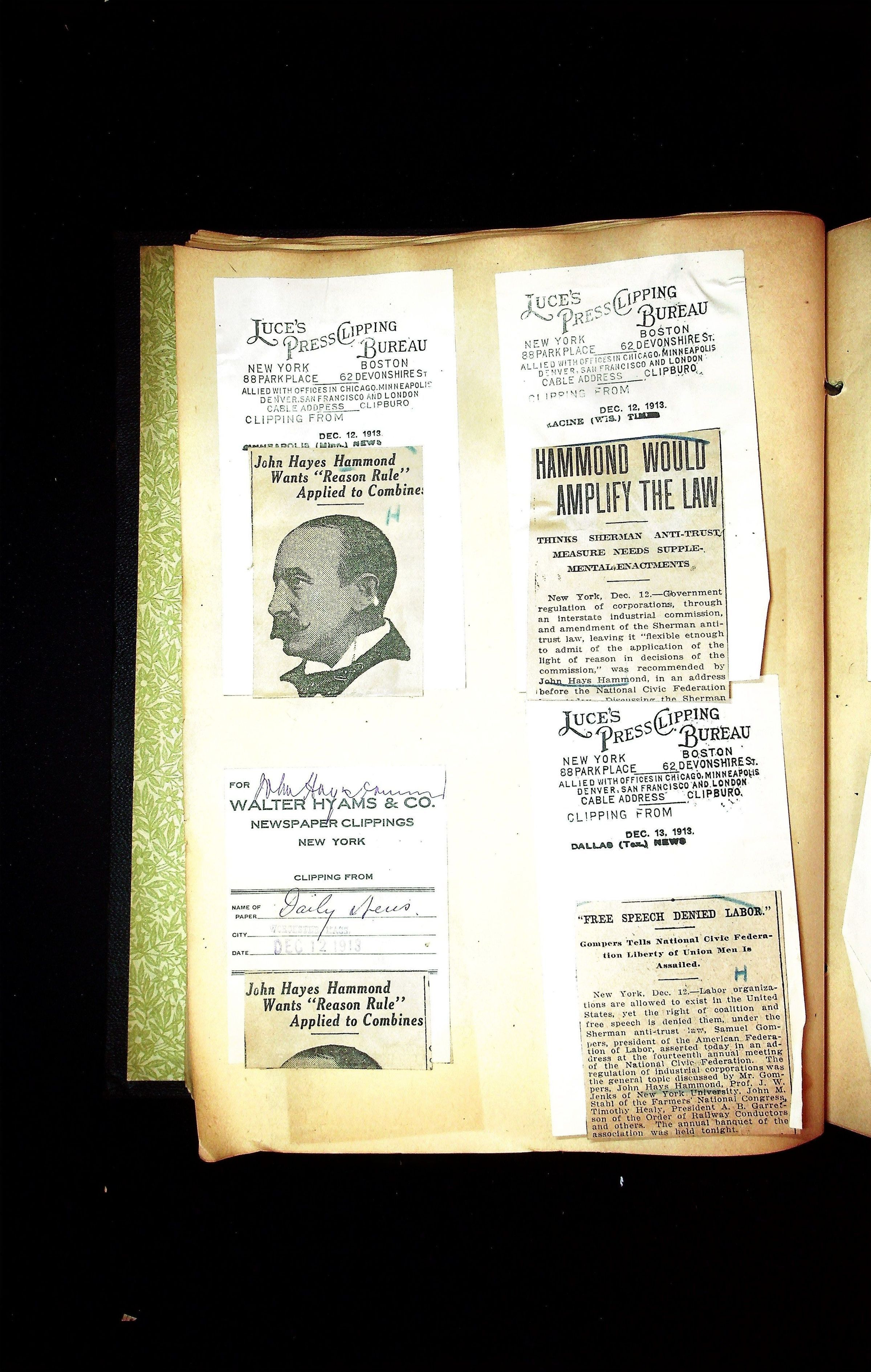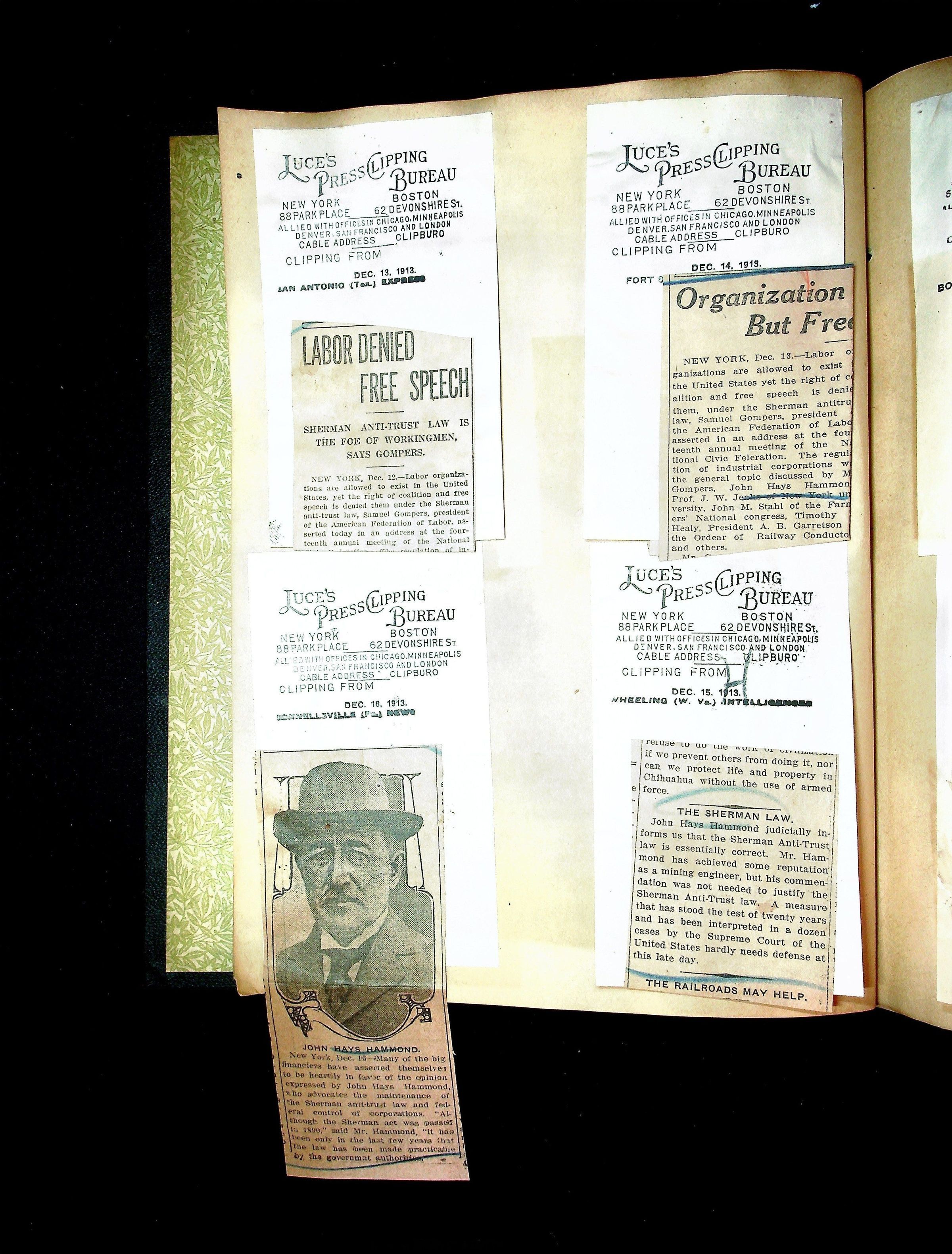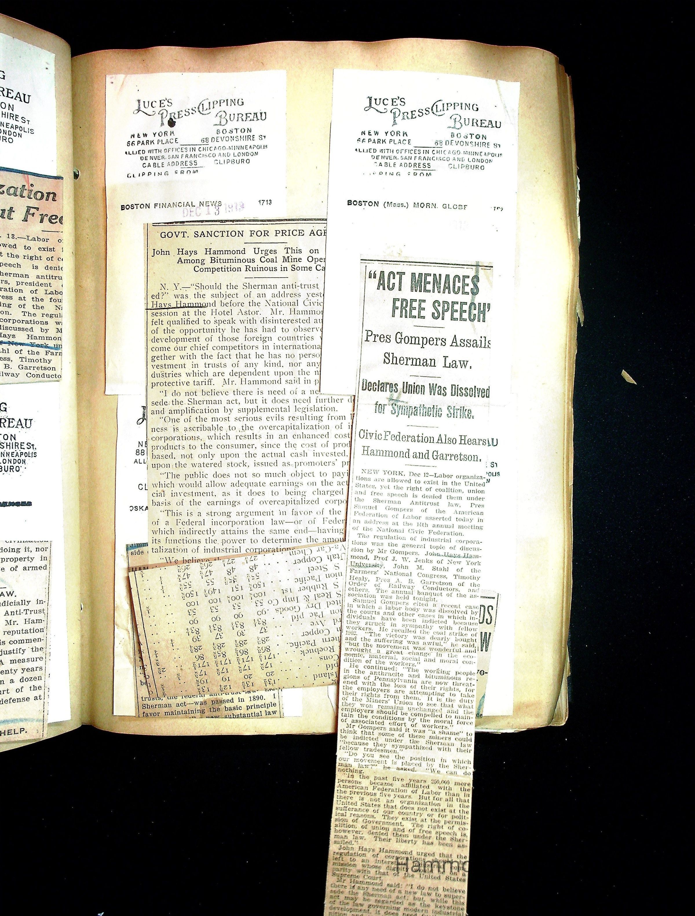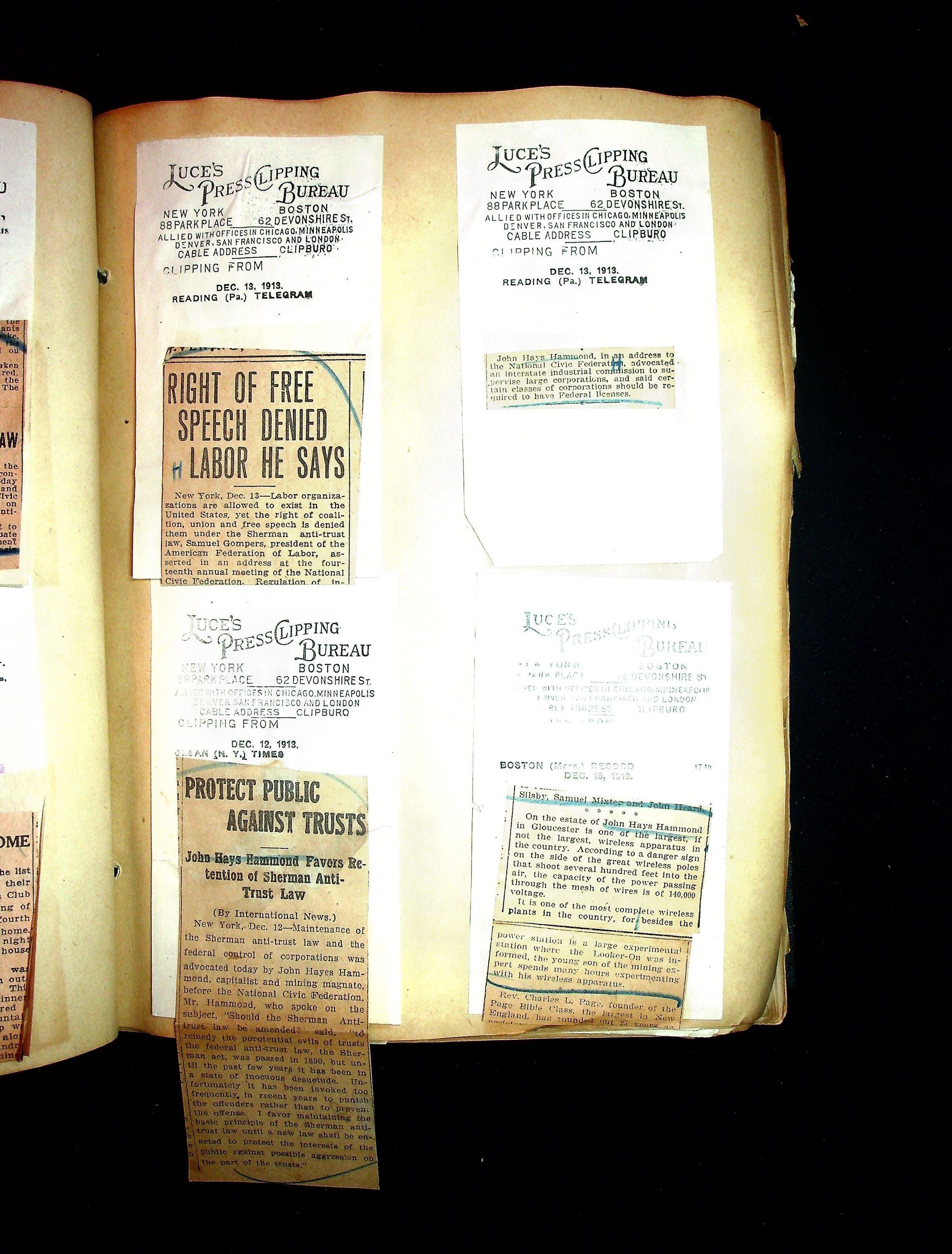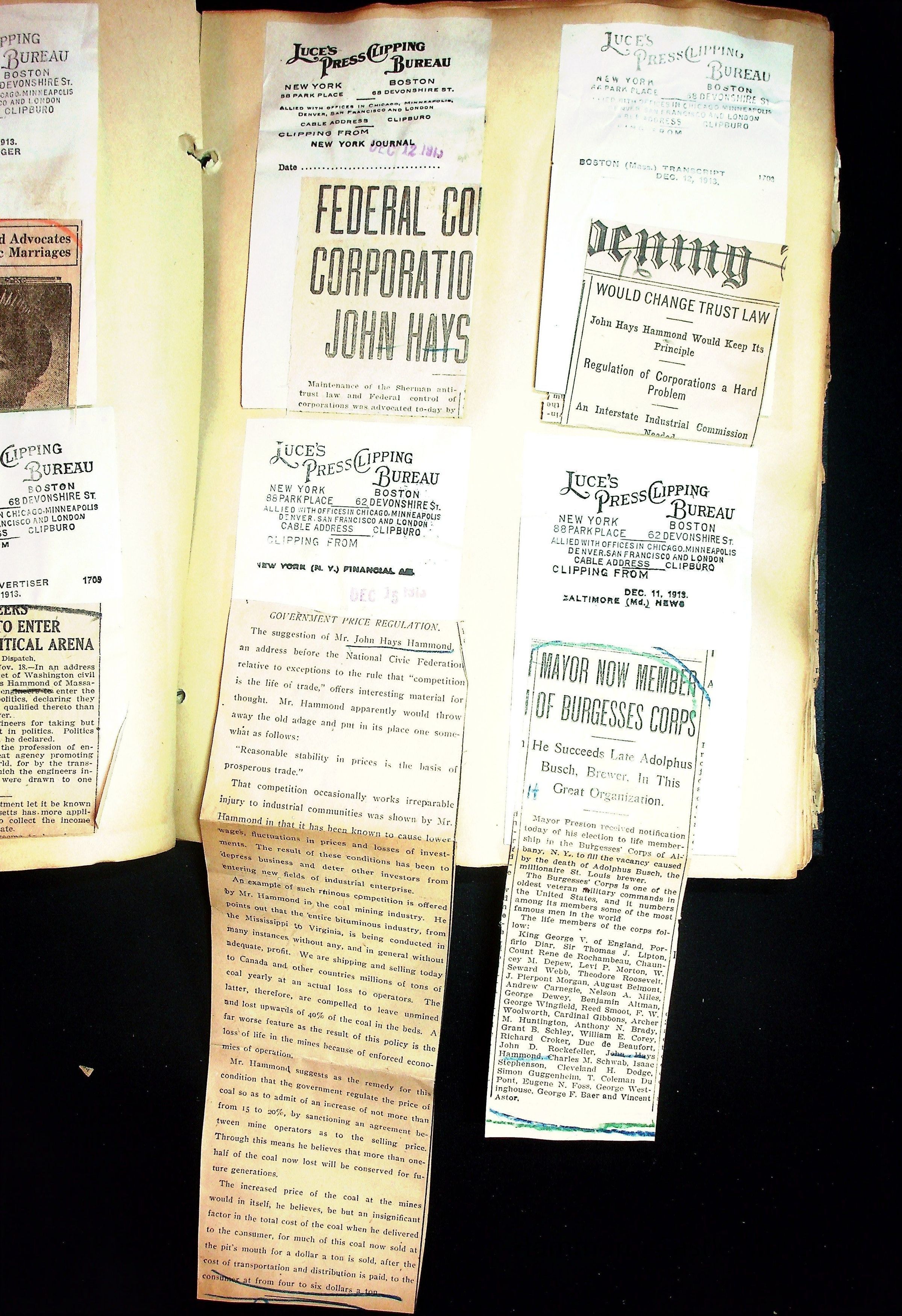 1913 scrapbook of newspaper articles about John Hays Hammond (Sr) and Mrs. Hammond covering governmental policies, Sherman Act, Eugenics & politics.
