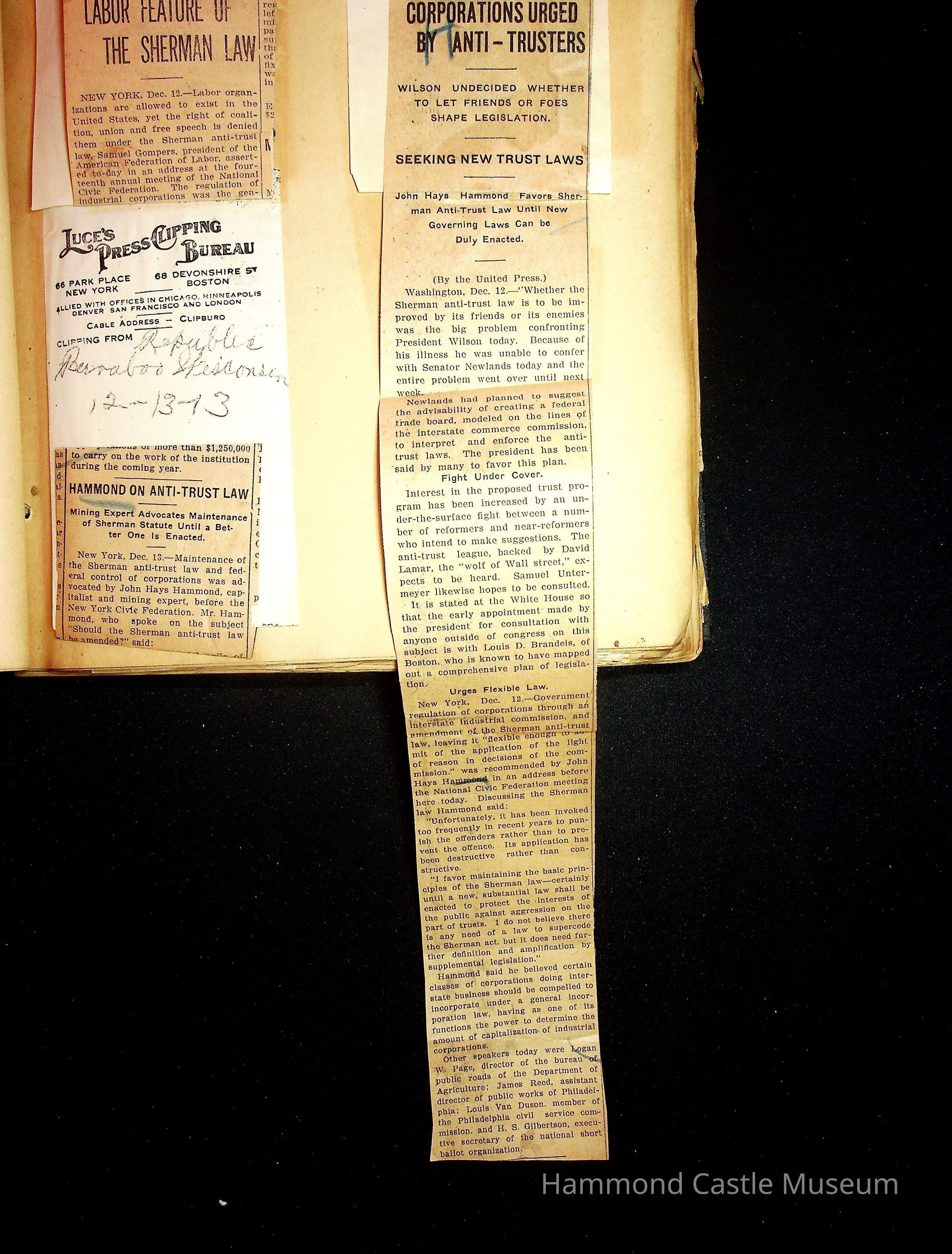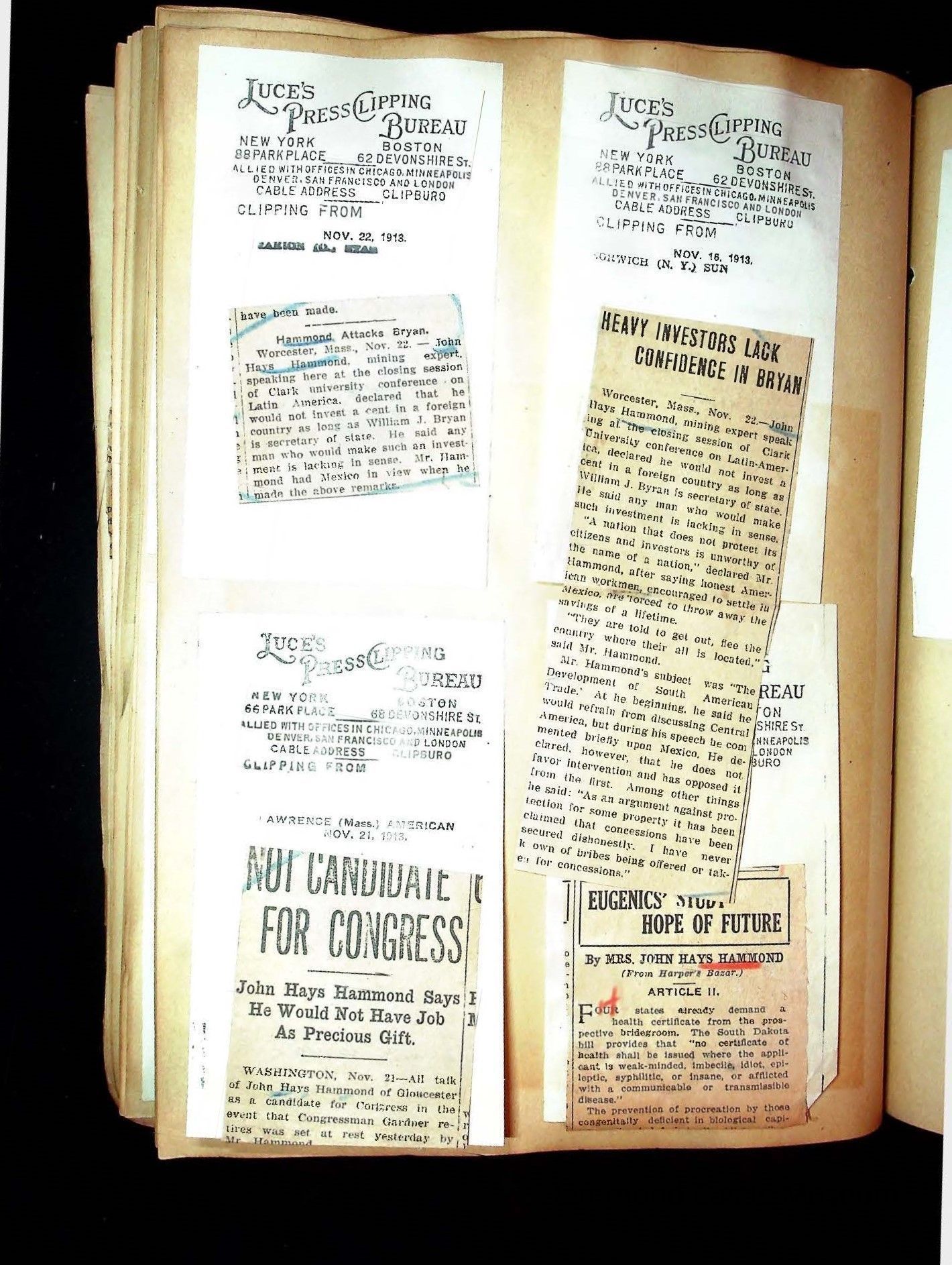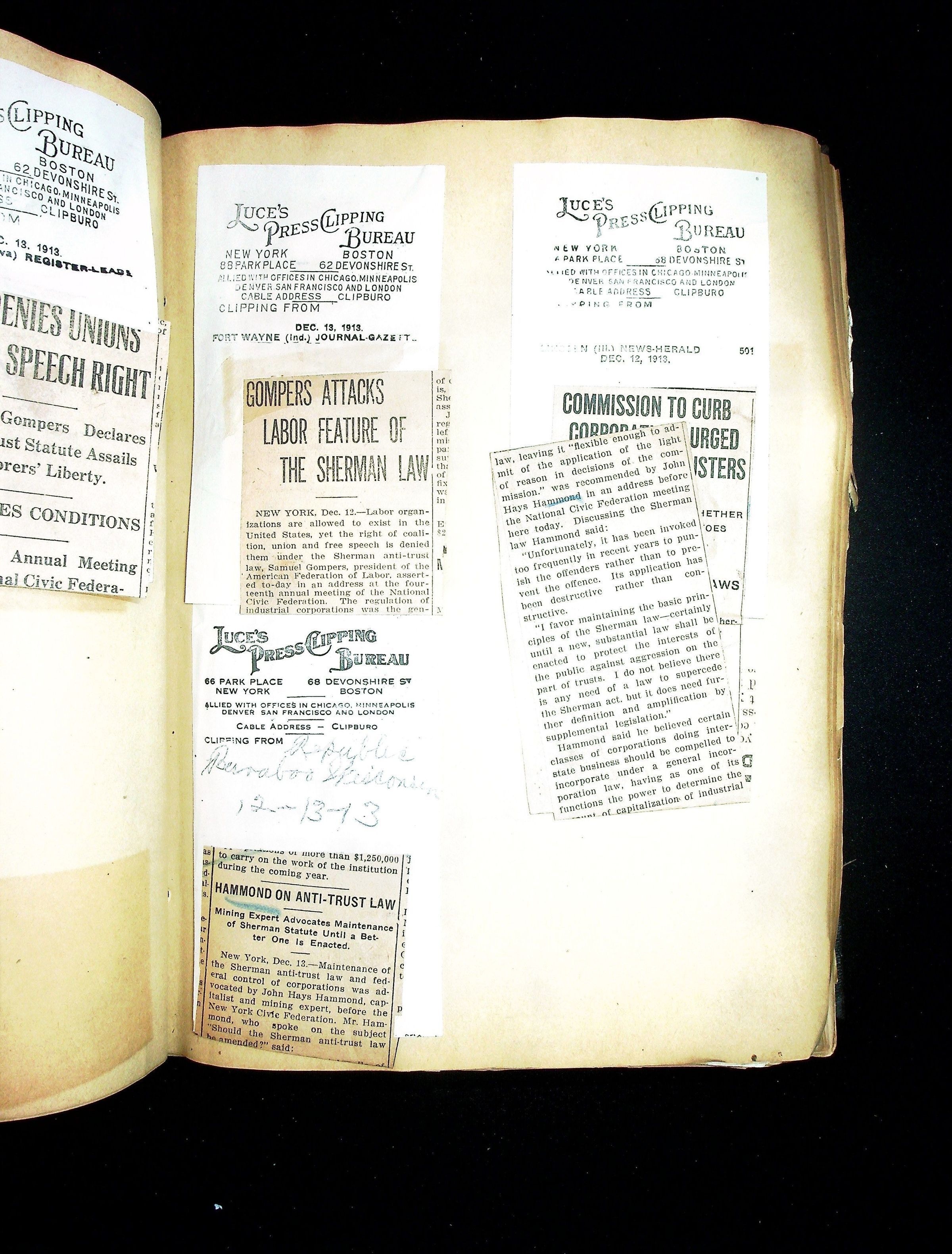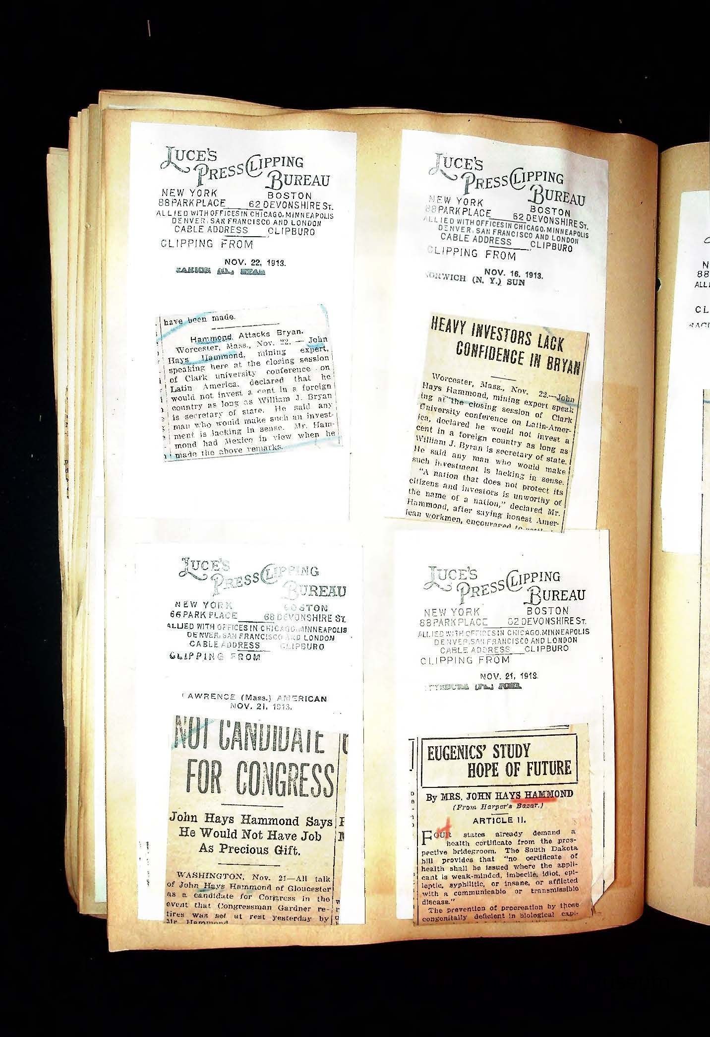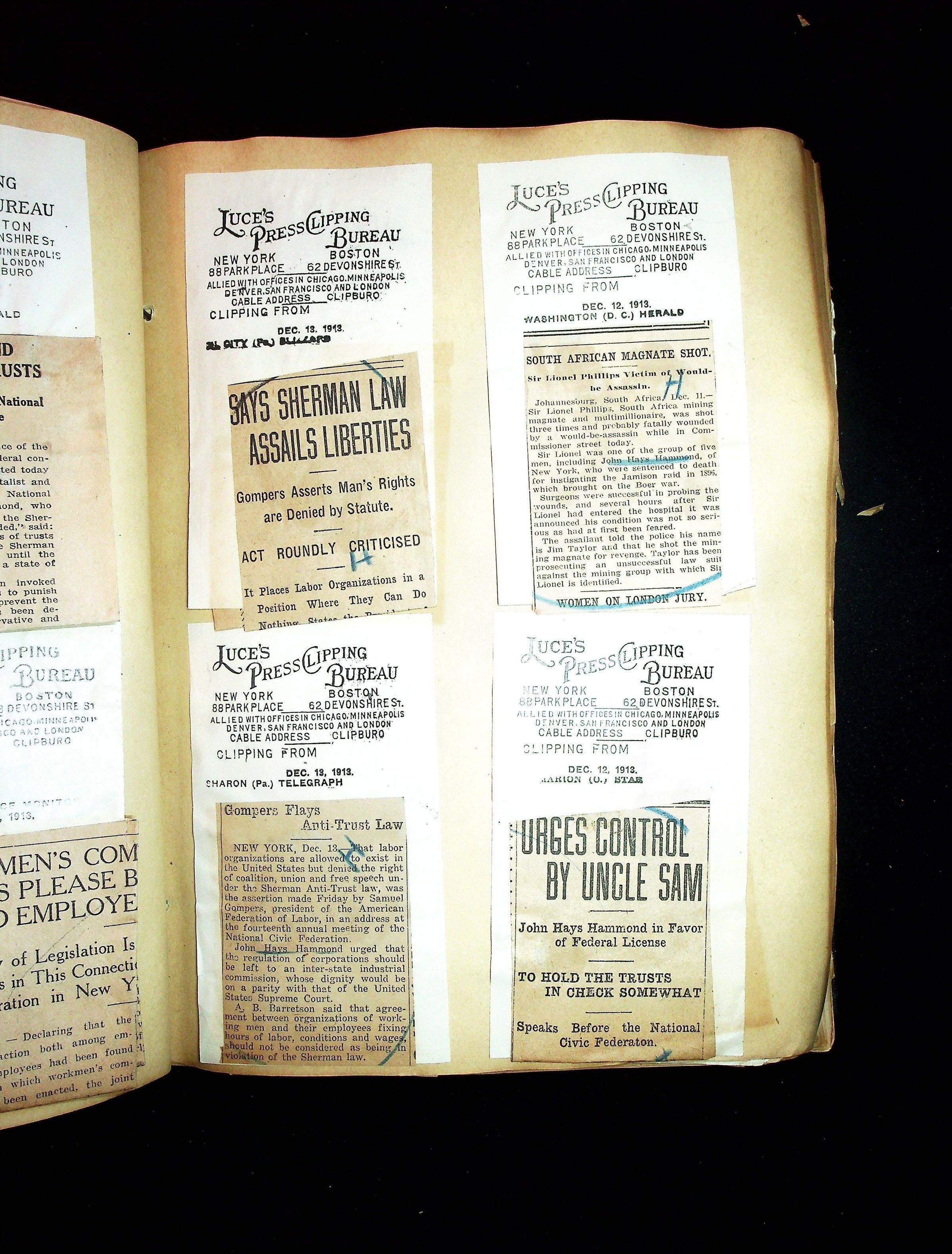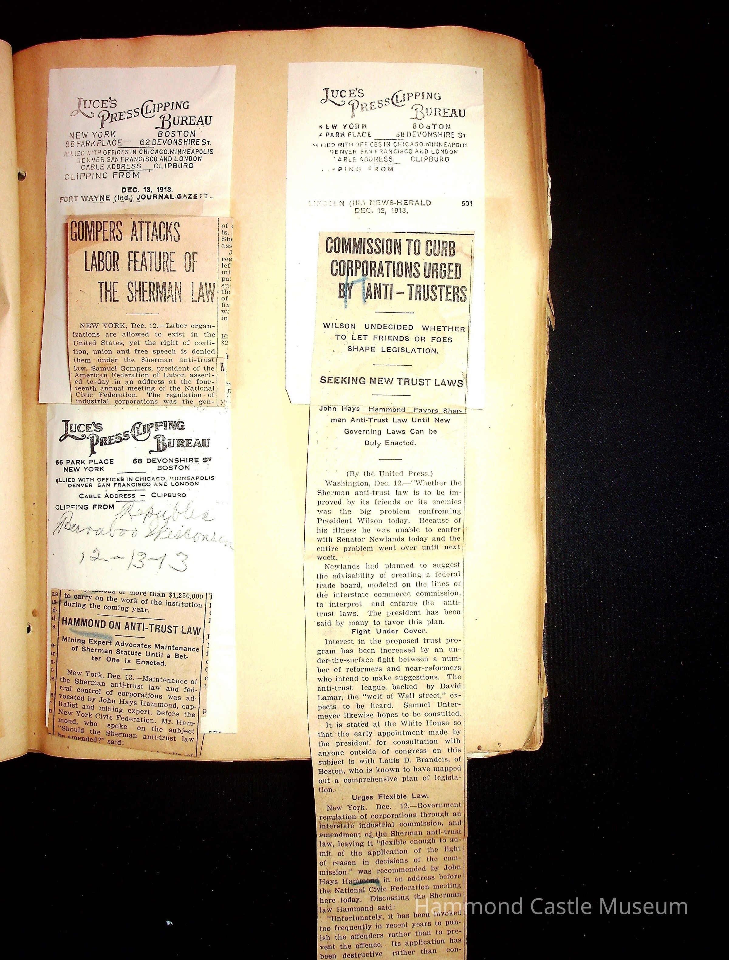 1913 scrapbook of newspaper articles about John Hays Hammond (Sr) and Mrs. Hammond covering governmental policies, Sherman Act, Eugenics & politics.