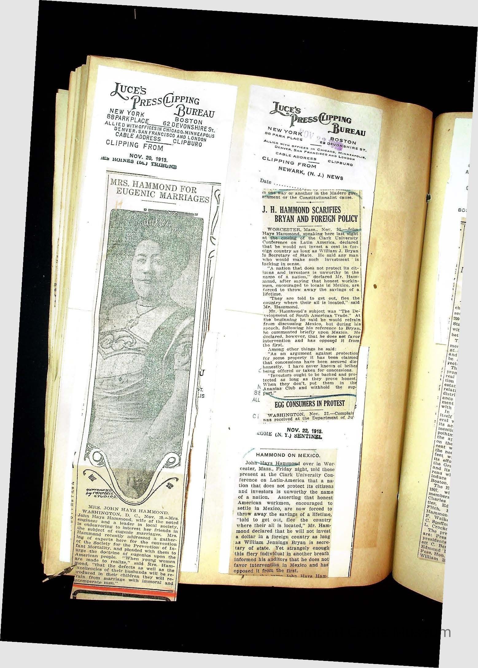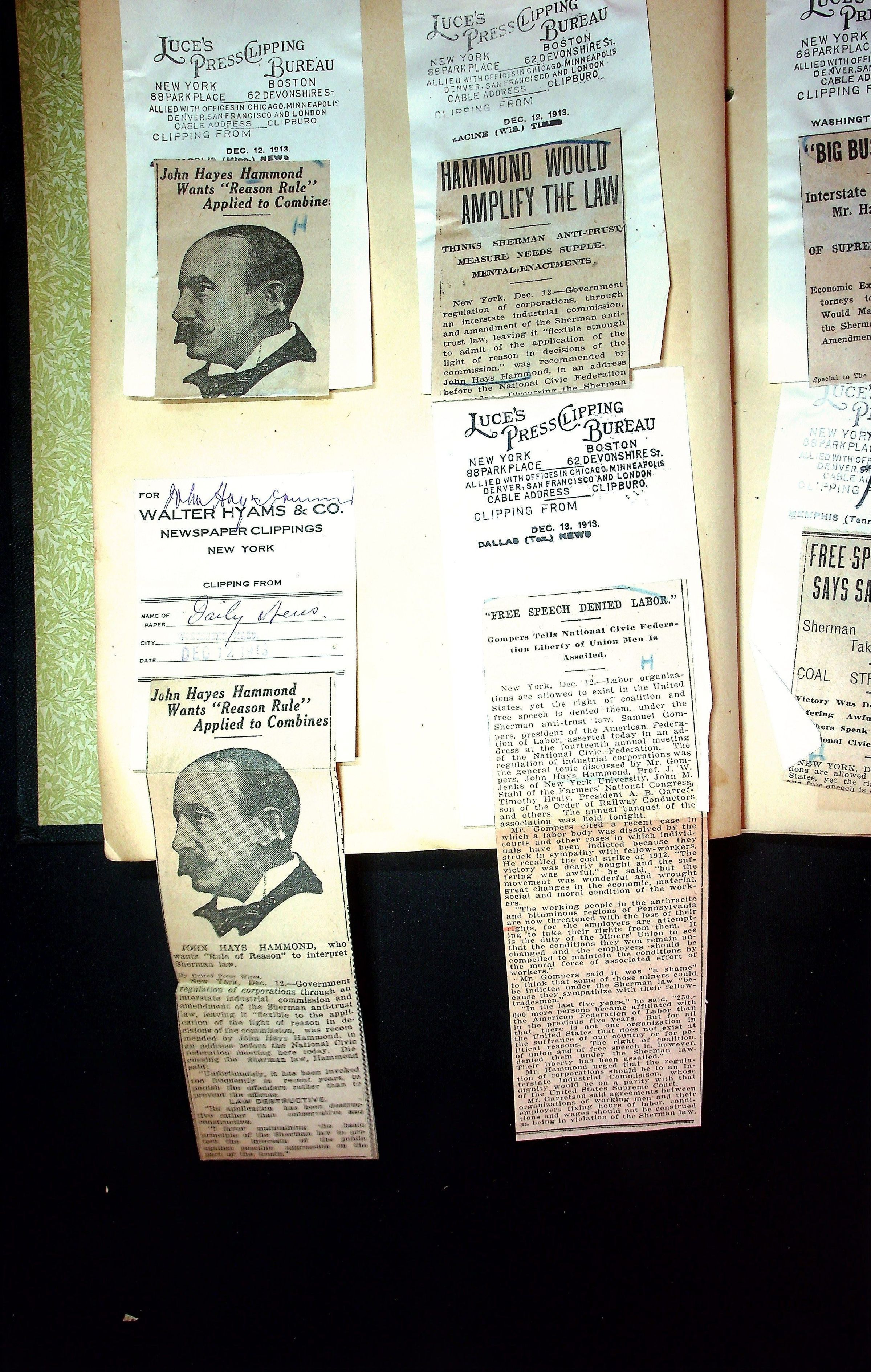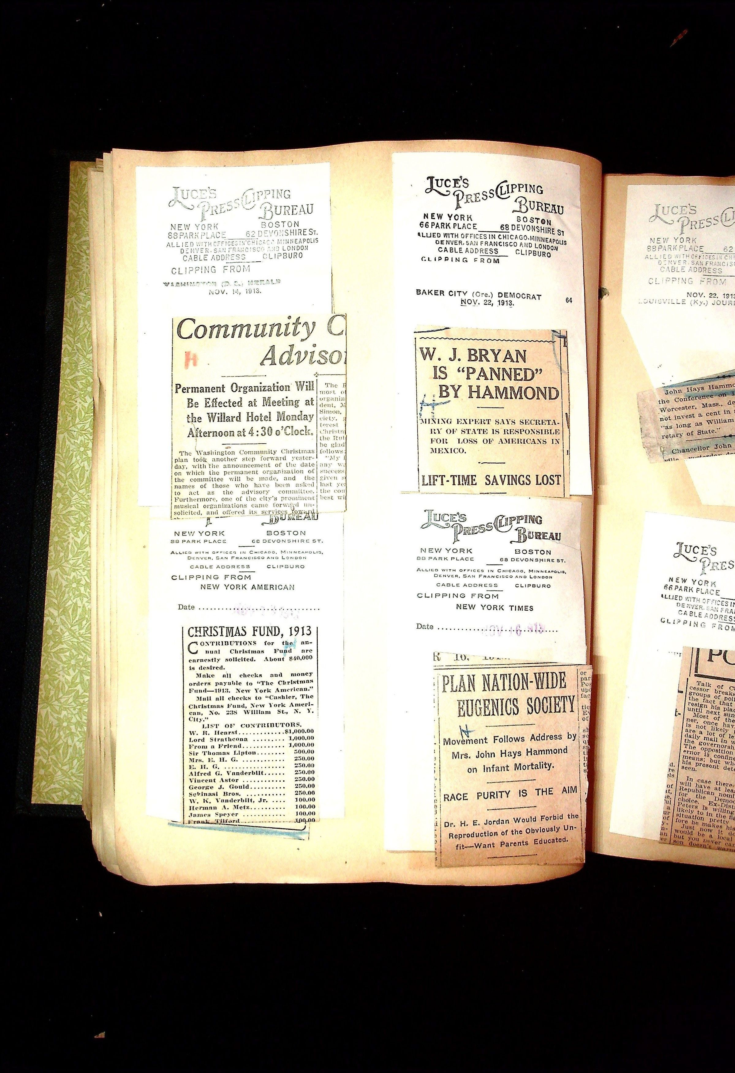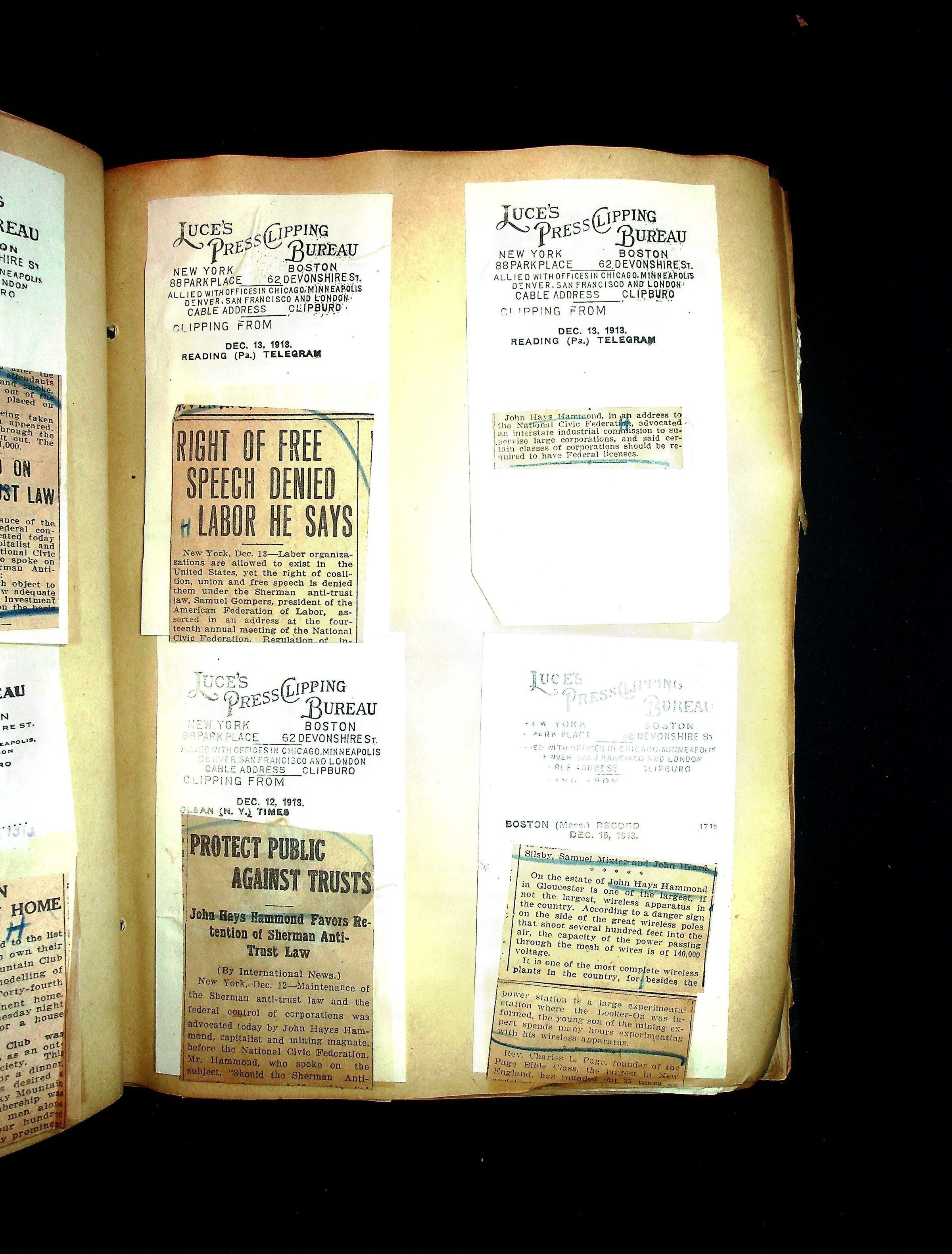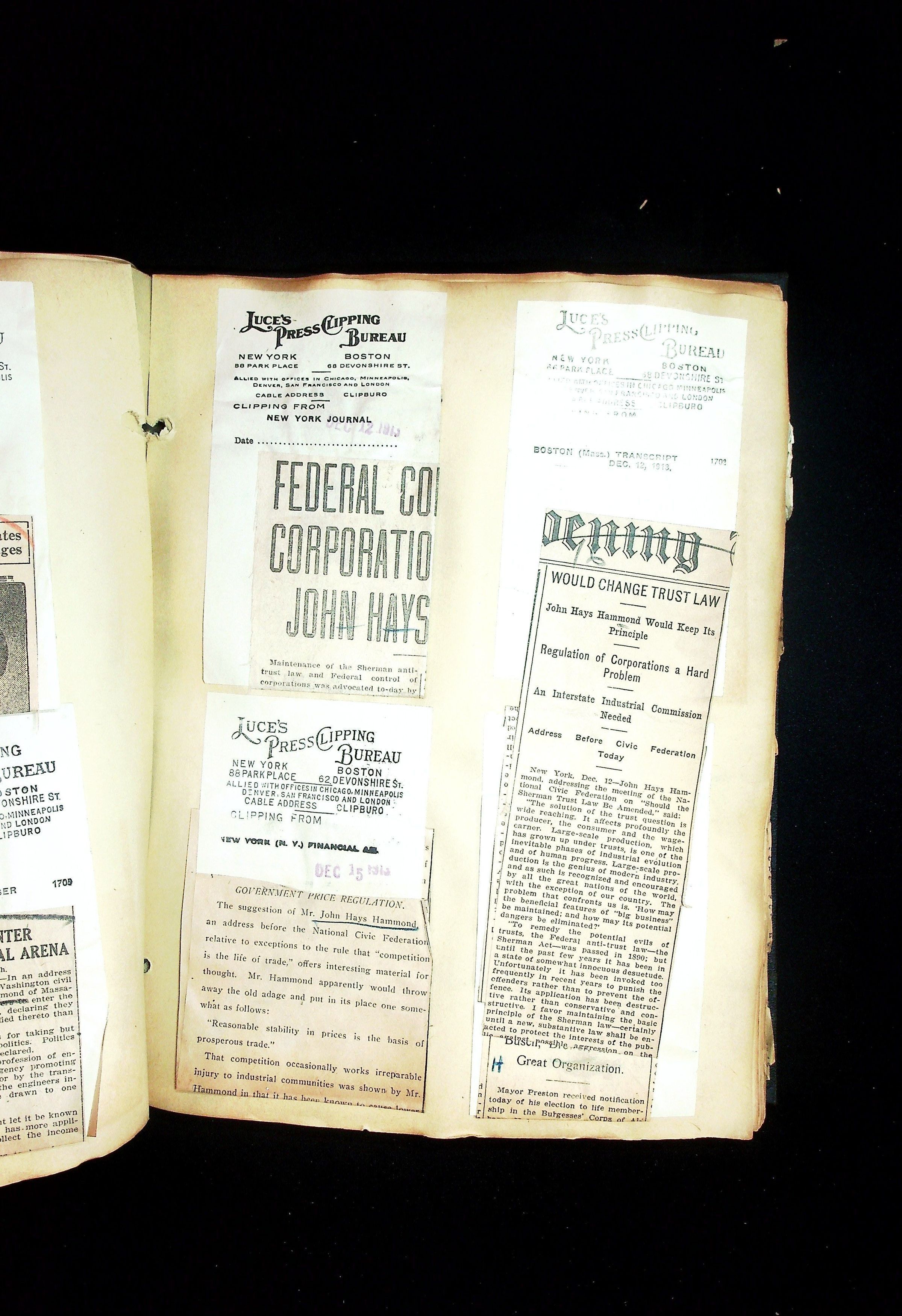 1913 scrapbook of newspaper articles about John Hays Hammond (Sr) and Mrs. Hammond covering governmental policies, Sherman Act, Eugenics & politics.
